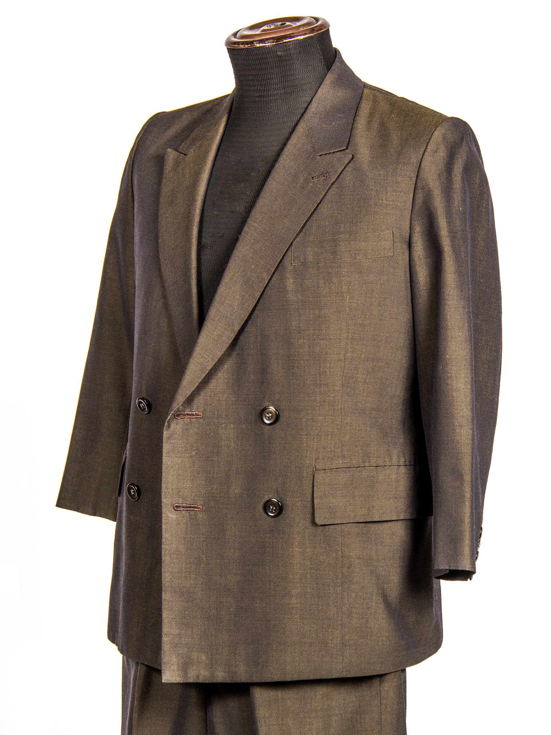 Two-piece iridescent brown suit, double-breasted jacket with 4 buttons and trousers, label 'Xuga,' Valparaíso. Chilean manufacture. Belonged to Alfonso Ansieta Núñez, former mayor and deputy for Valparaíso.