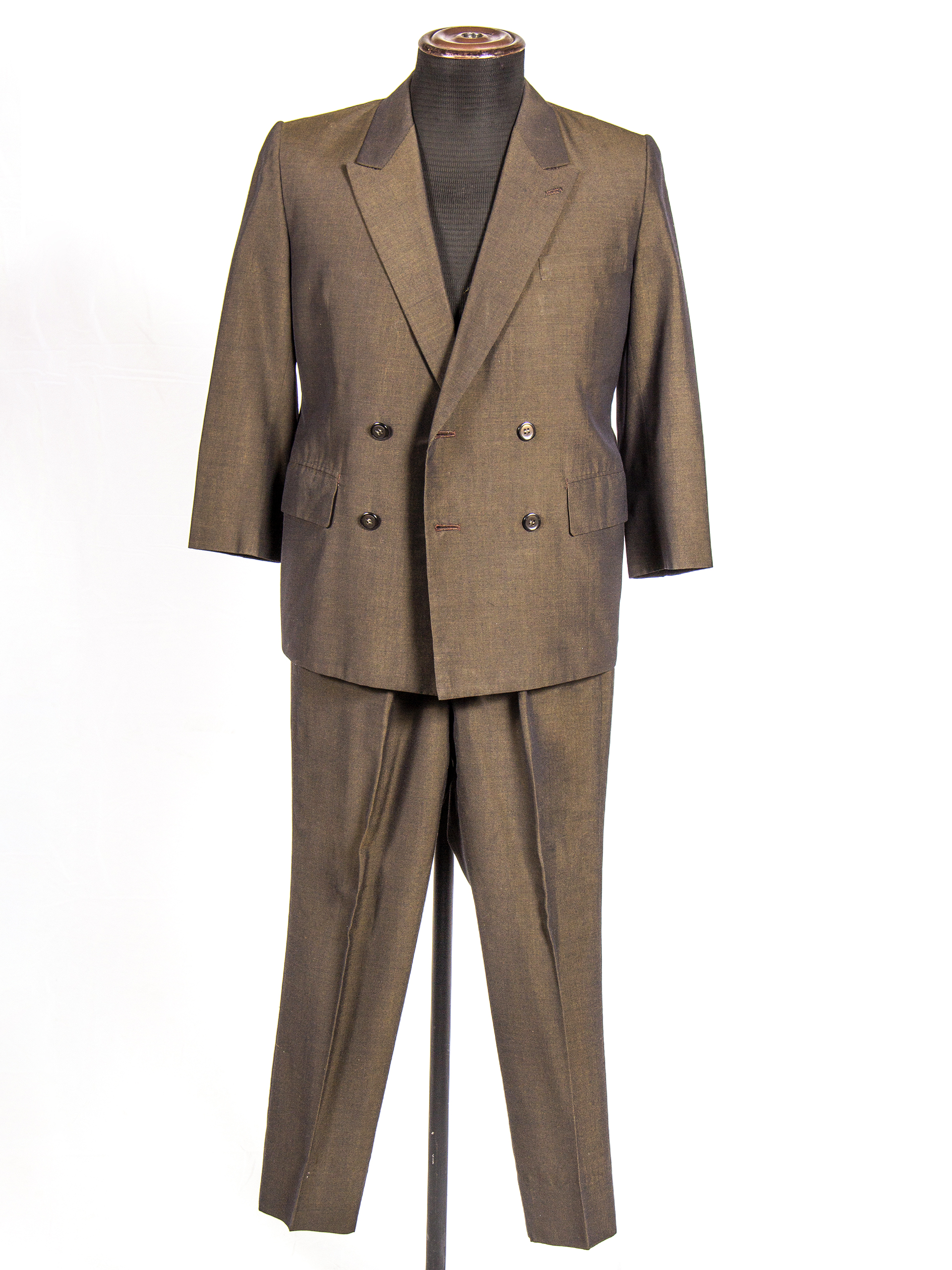 Traje 2 piezas café tornasol, chaqueta cruzada 4 botones y pantalón, etiqueta 'Xuga', Valparaíso. Fabricación chilena. Perteneció a Alfonso Ansieta Núñez, ex alcalde y diputado por Valparaíso.