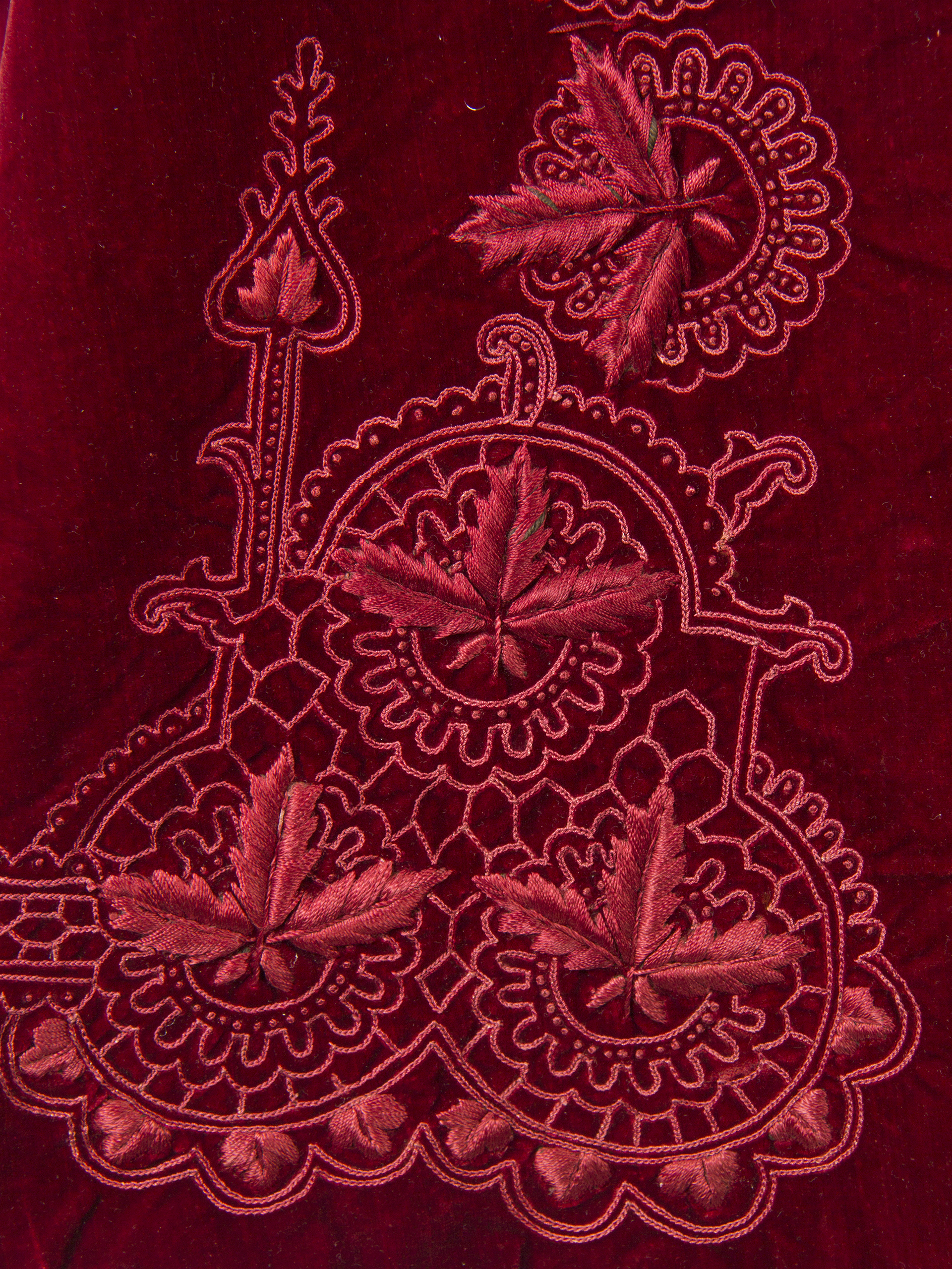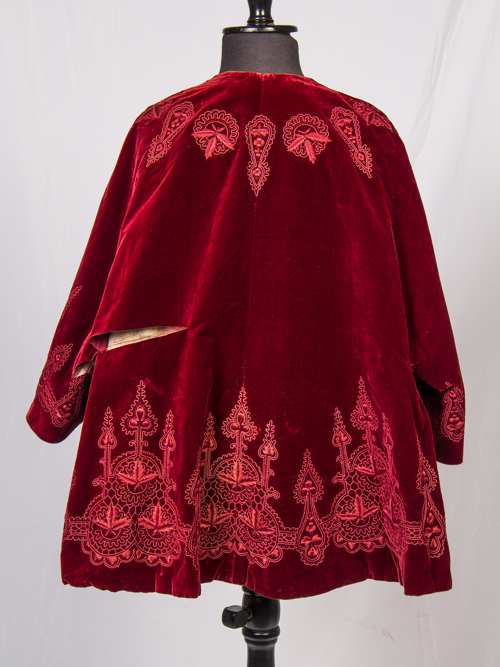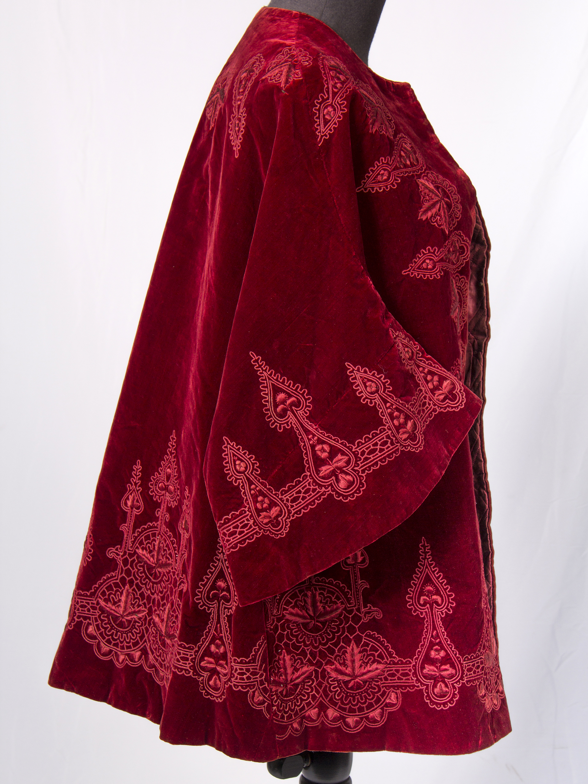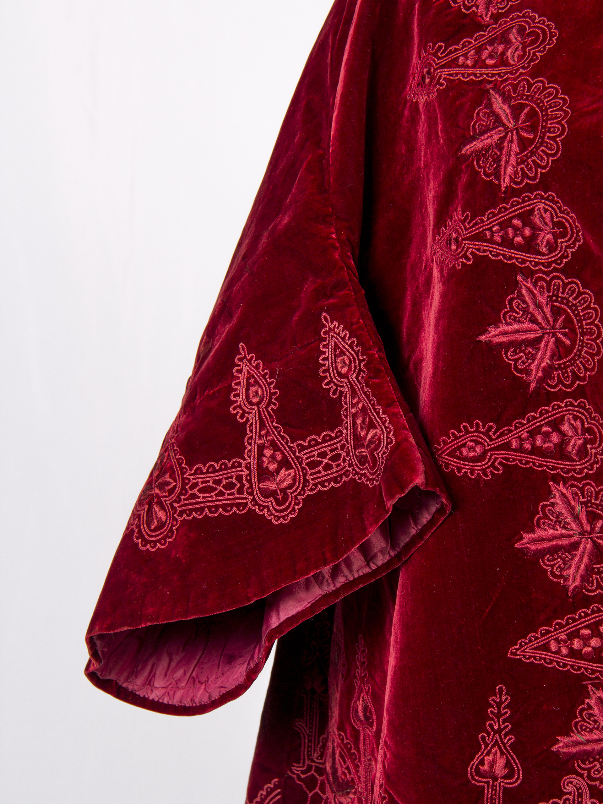 Woman's cape with sleeves, red velvet with raised floral embroidery, thin red quilted lining, round collar without lapels, elbow-height sleeves, open front without buttons. It is approximately from the late 1800s, belonged to the family of Consuelo Beaumont Portales. It shows discoloration and stains on the lining, a tear in the back at the waist height.