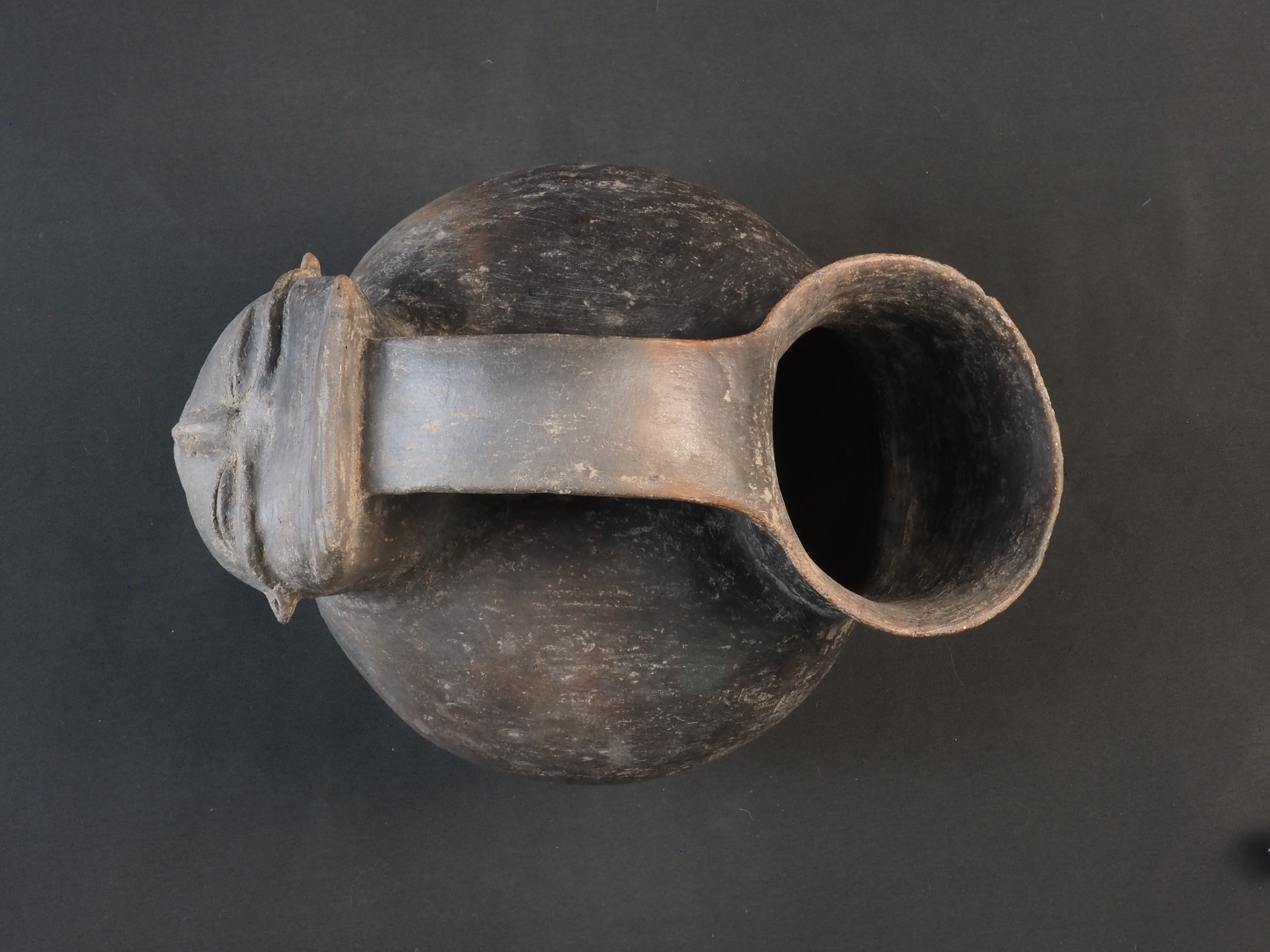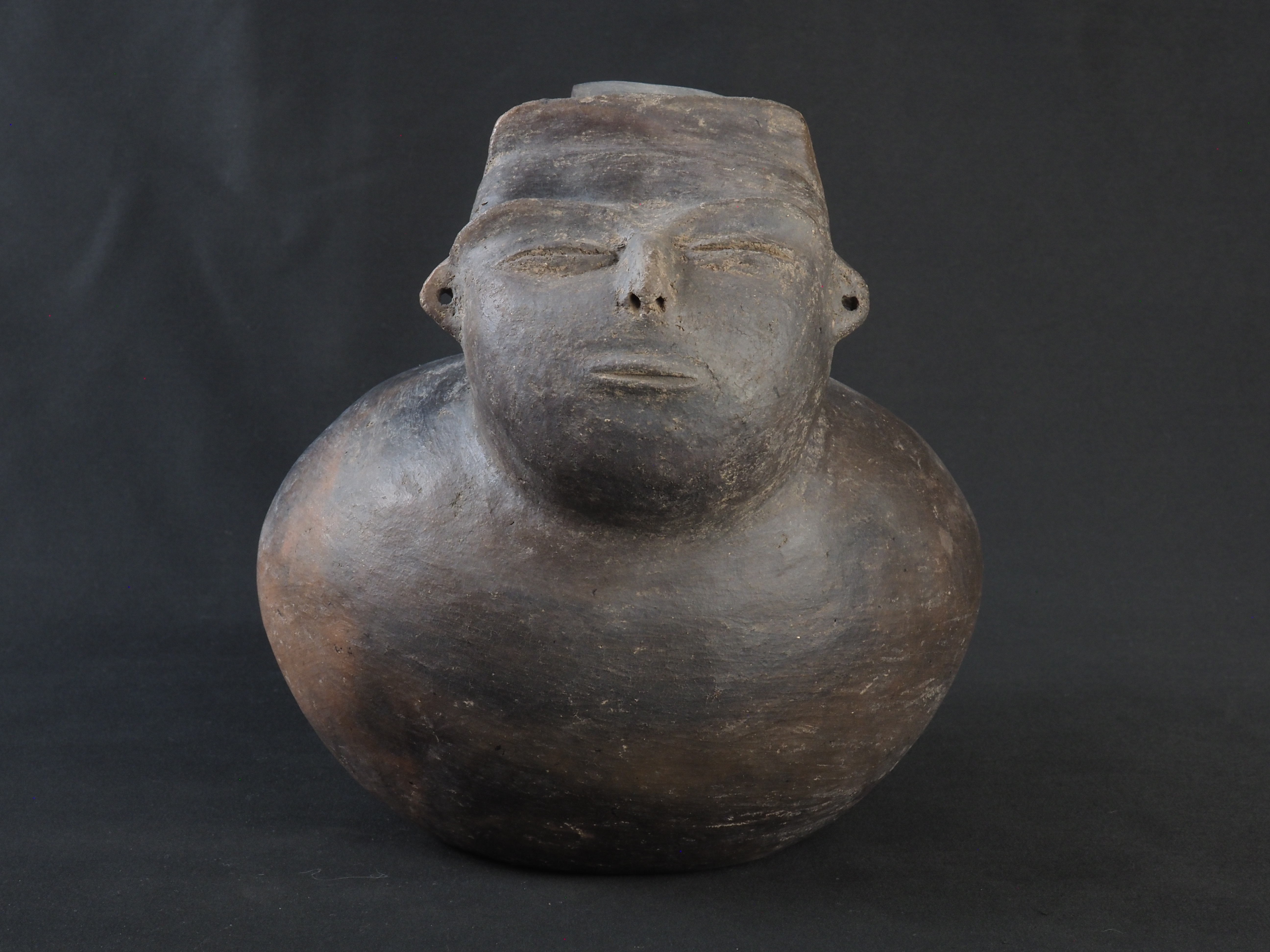 Objeto de superficie de color negro, posee decoración antropomorfa realizada en la misma materialidad y técnica que el cuerpo, unida al cuello desde la parte trasera de la cabeza de la figura hasta el labio de la botella. Técnica: Arcilla modelada, alisada y pulida. Morfología: Contenedor asimétrico de estructura restringida con cuello hiperboloide y labio evertido. Posee un asa puente plana horizontal entre el labio y un protubero antropomorfo emplazado en el otro extremo del cuerpo, perfil compuesto y cuerpo elipsoide horizontal con base plana.