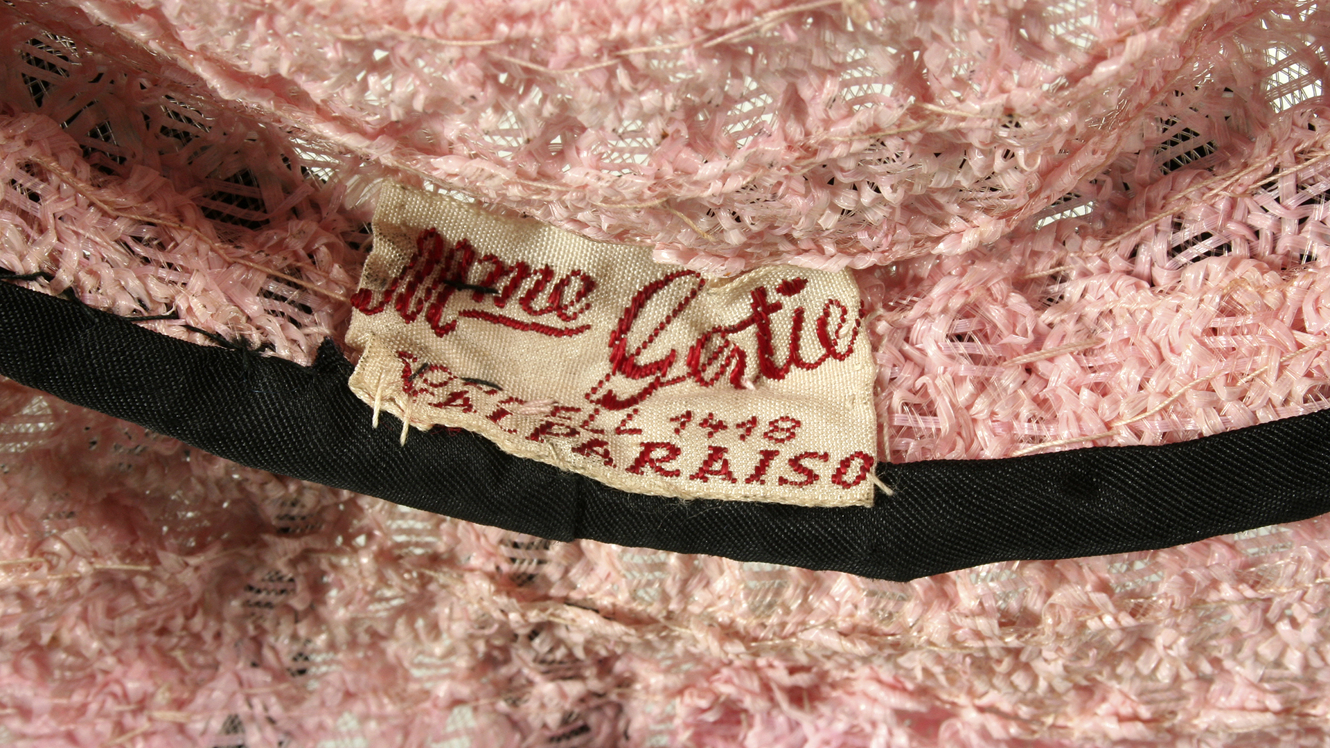 dc.description | dc.description | Pink woven straw hat with white tulle featuring black dots on the crown, a band with a black ribbon ending in a bow at the back, and a wavy black edge on the brim. Brand Mme. Gertie, Condell 1418 Valparaíso. Chilean manufacture. | |