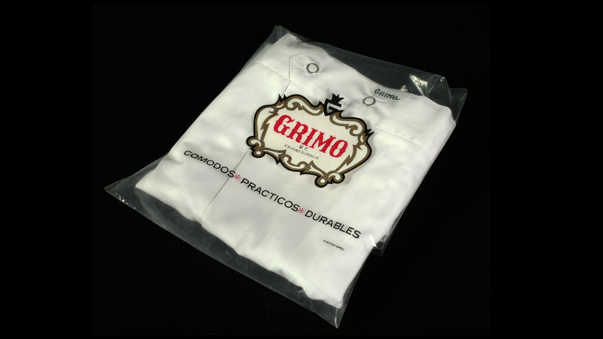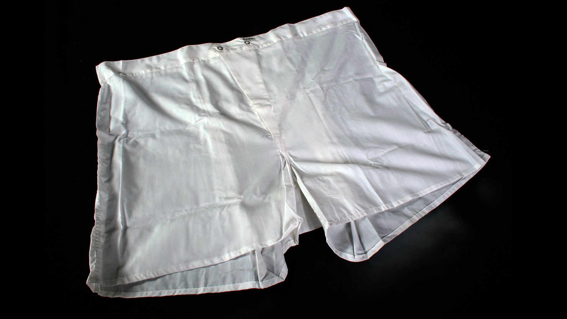 White boxer shorts with waist snaps, 'GRIMO' brand. Packaged in a plastic bag.