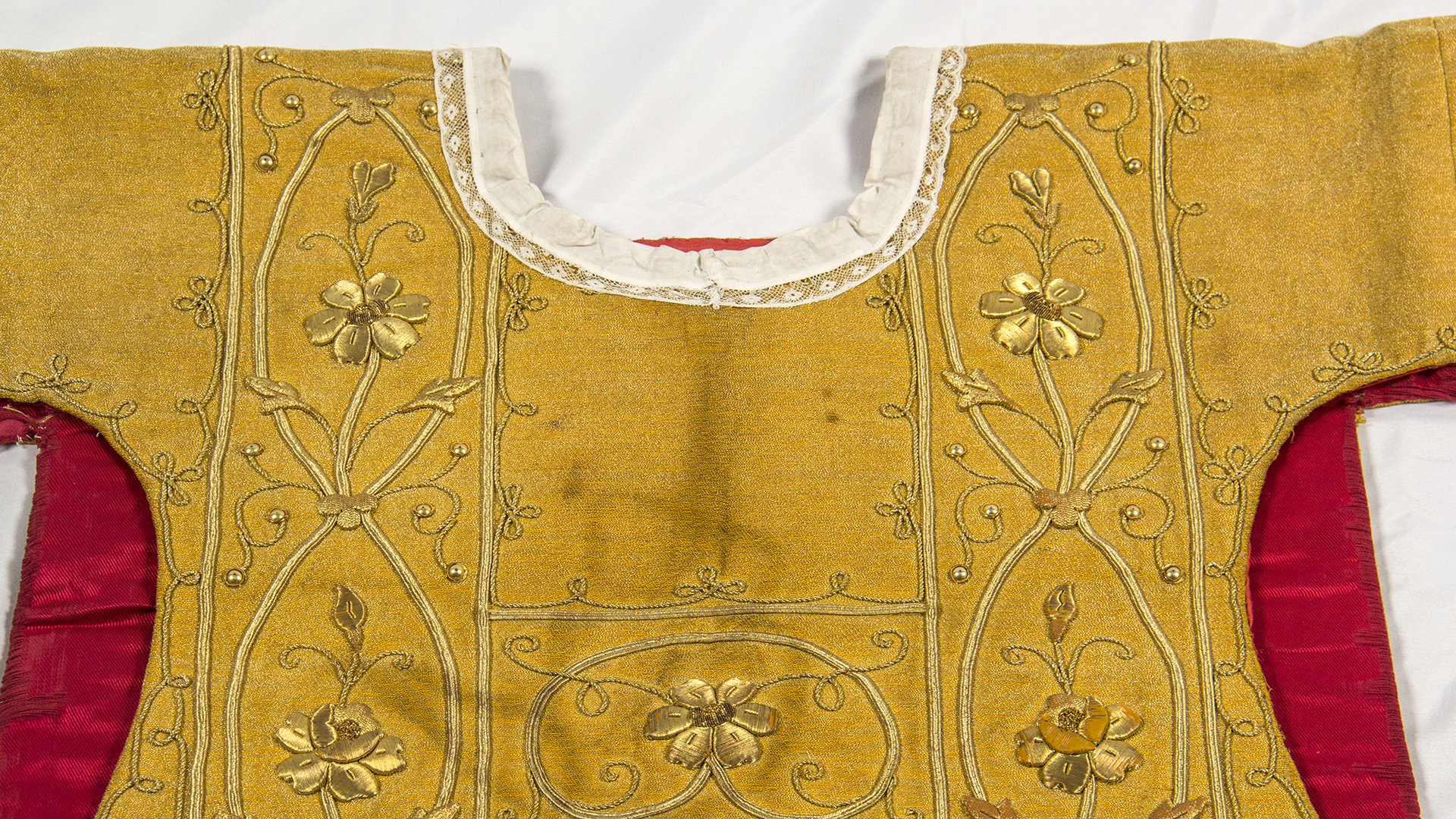 Golden metallic mesh with embroidered metallic golden flowers, rounded neckline adorned with white lace and a red lining. Frontal embroideries showing signs of oxidation, damp stains, and fraying of the inner fabric.
