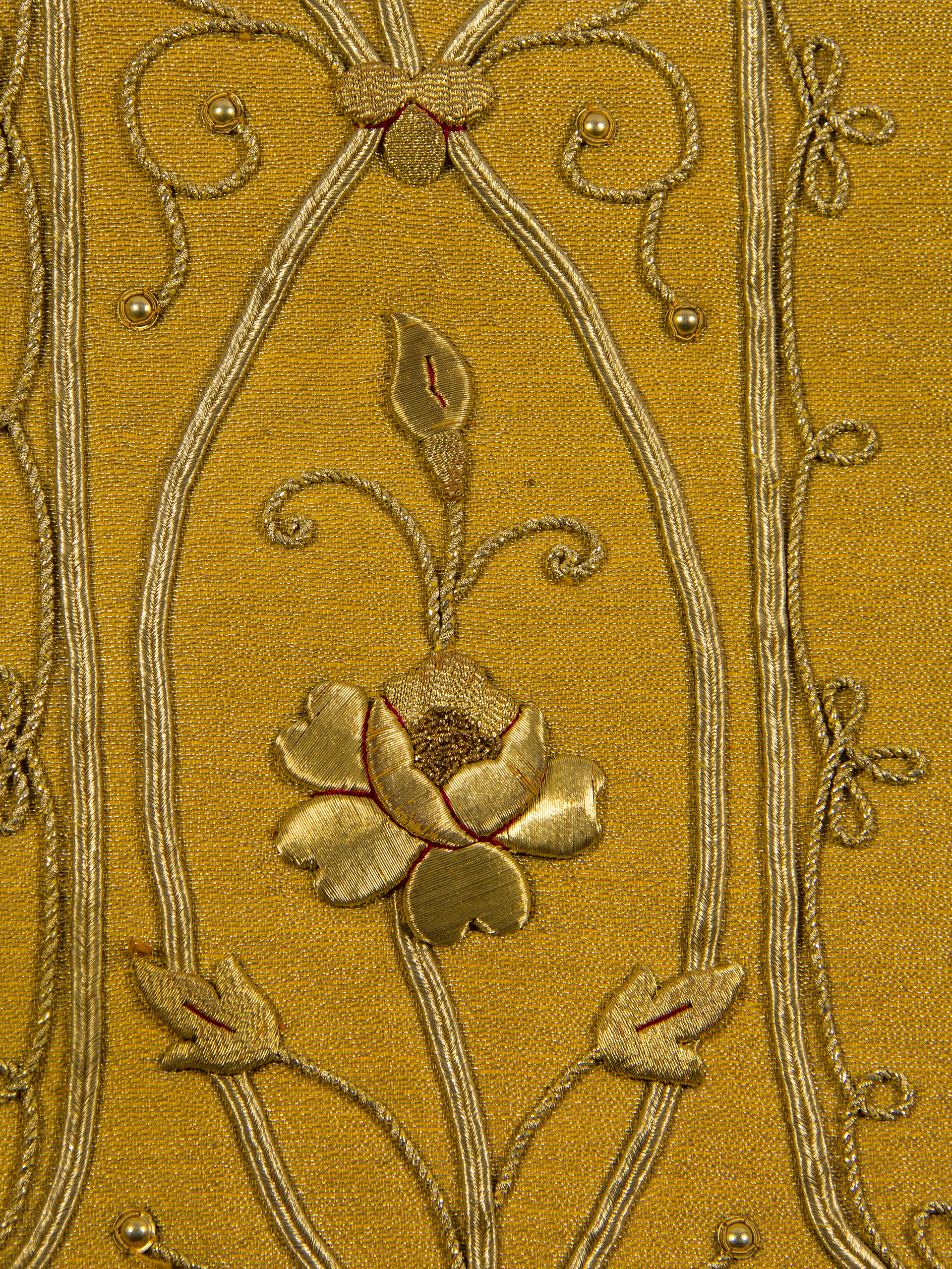 Tela metálica dorada con flores bordadas doradas metálicas, cuello redondo con blonda blanca y forro rojo. Bordados frontales en proceso de oxidación, manchas de humedad y desfibración de la tela interior