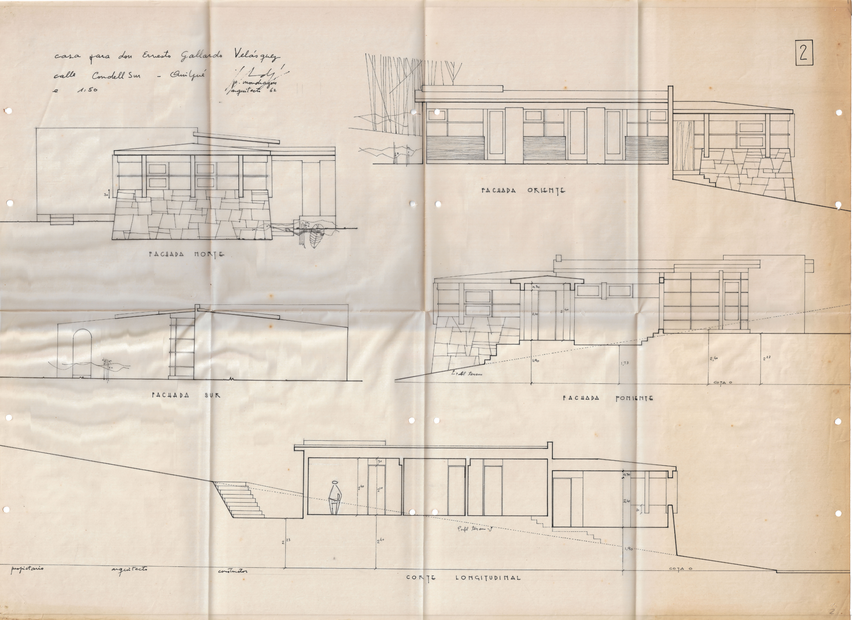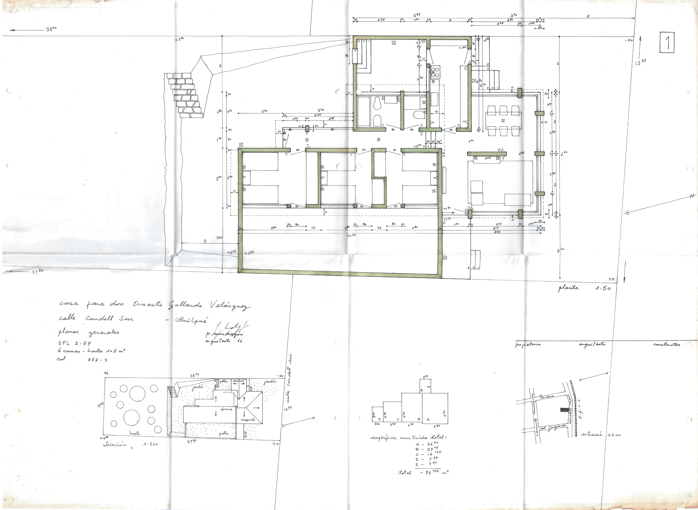 El proyecto correspondiente a la casa de don Ernesto Gallardo Velásquez reúne un conjunto de planos arquitectónicos y constructivos que describen la vivienda en detalle. Incluye los planos generales, donde se presenta la planta en escala 1:50 junto con la situación y ubicación del inmueble en escala 1:4000; las fachadas, que muestran todas las orientaciones de la casa y un corte longitudinal, también en escala 1:50; y dos láminas de detalles de cimientos, una con la estructura en escala 1:10, que especifica cimientos, pilares y dinteles, y otra que incorpora los detalles de puertas y ventanas tipo X en escala 1:50. En conjunto, los planos permiten apreciar tanto la distribución general como los aspectos constructivos fundamentales de la vivienda.