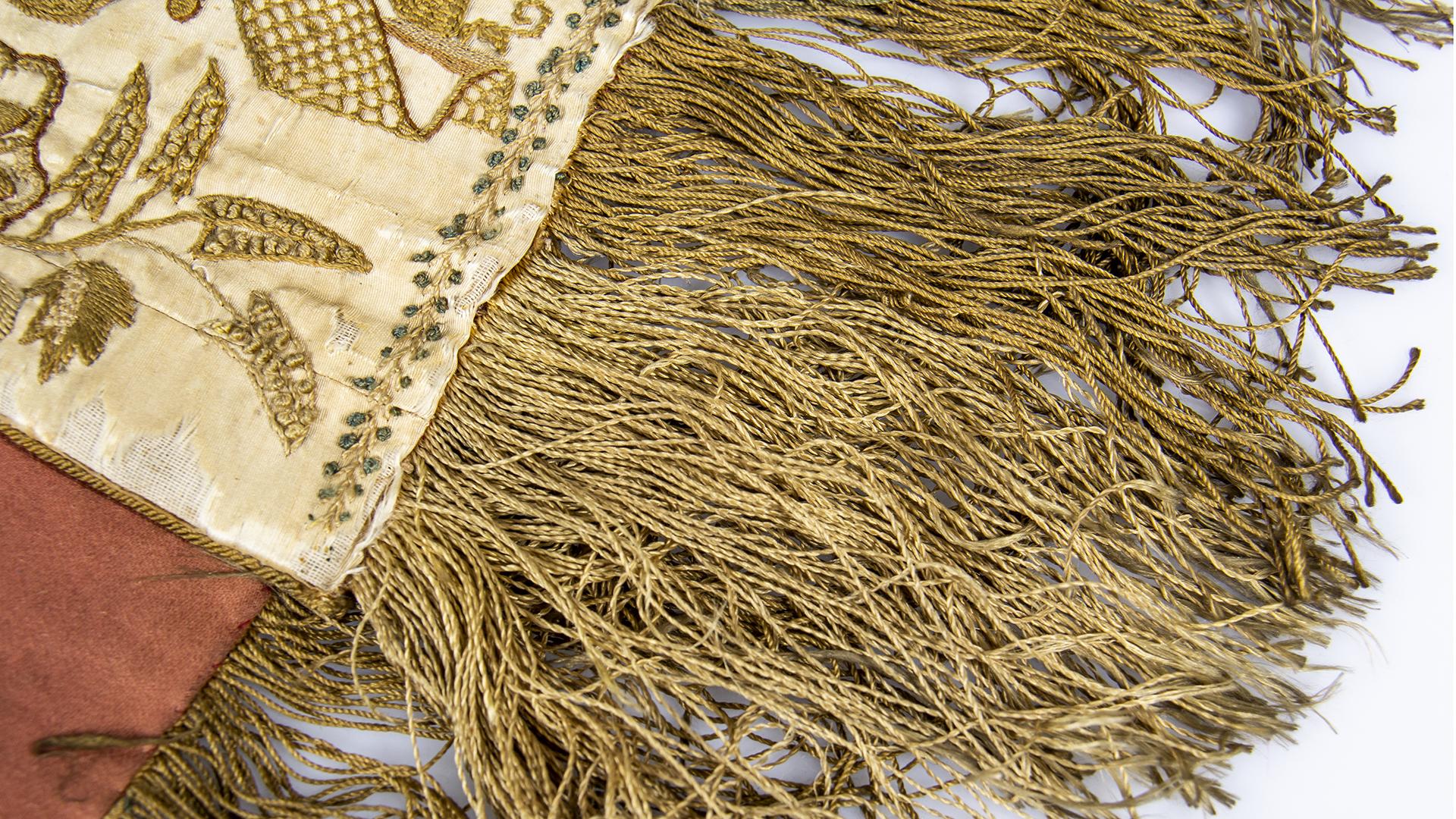 Raw satin with golden floral embroidery and blue writings, long golden fringes at the ends.