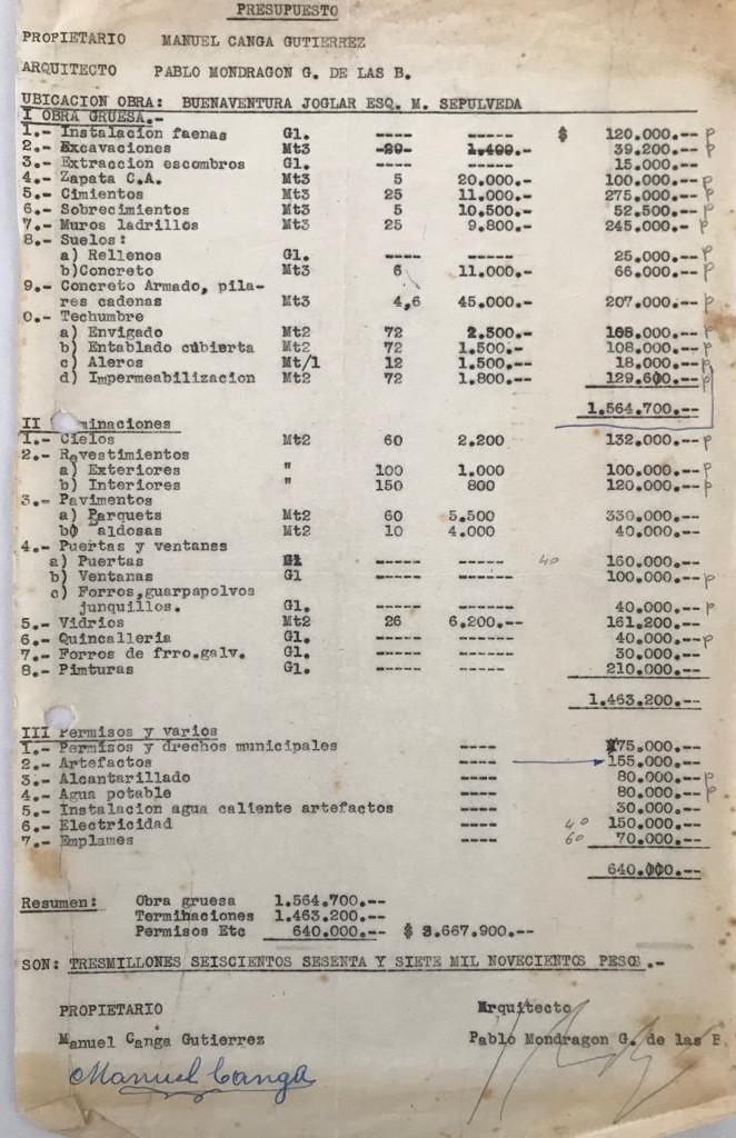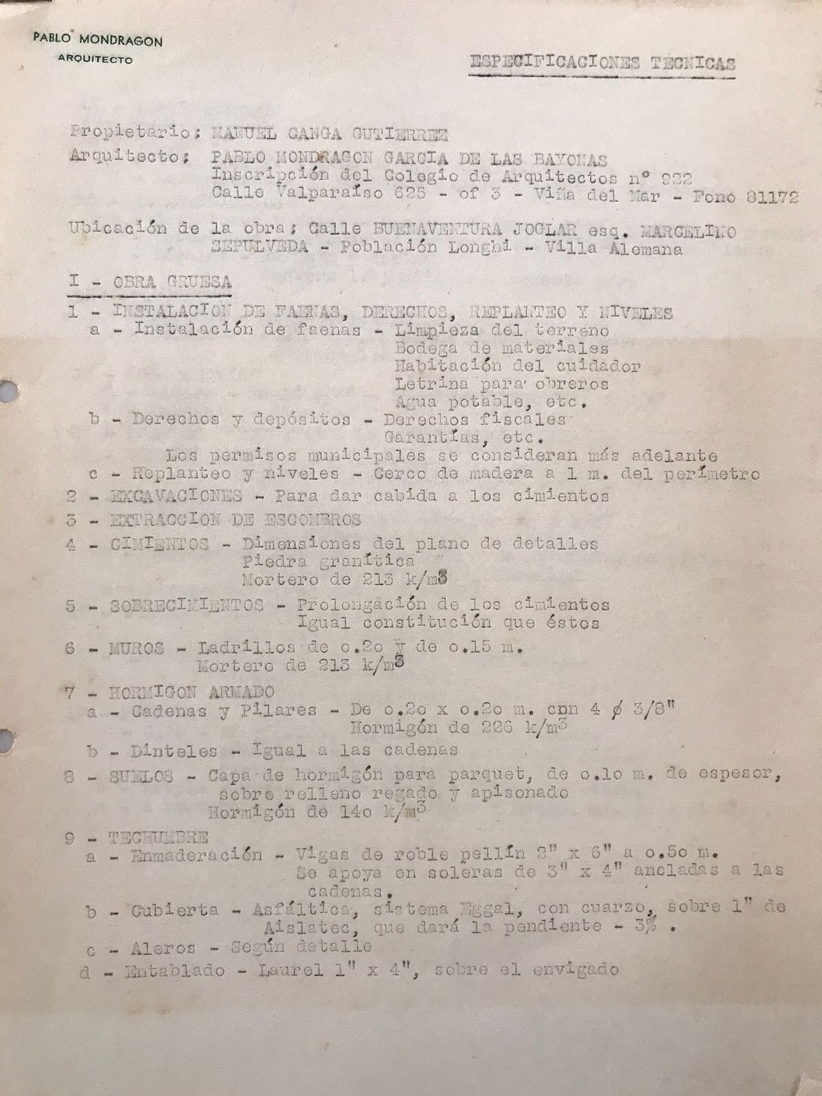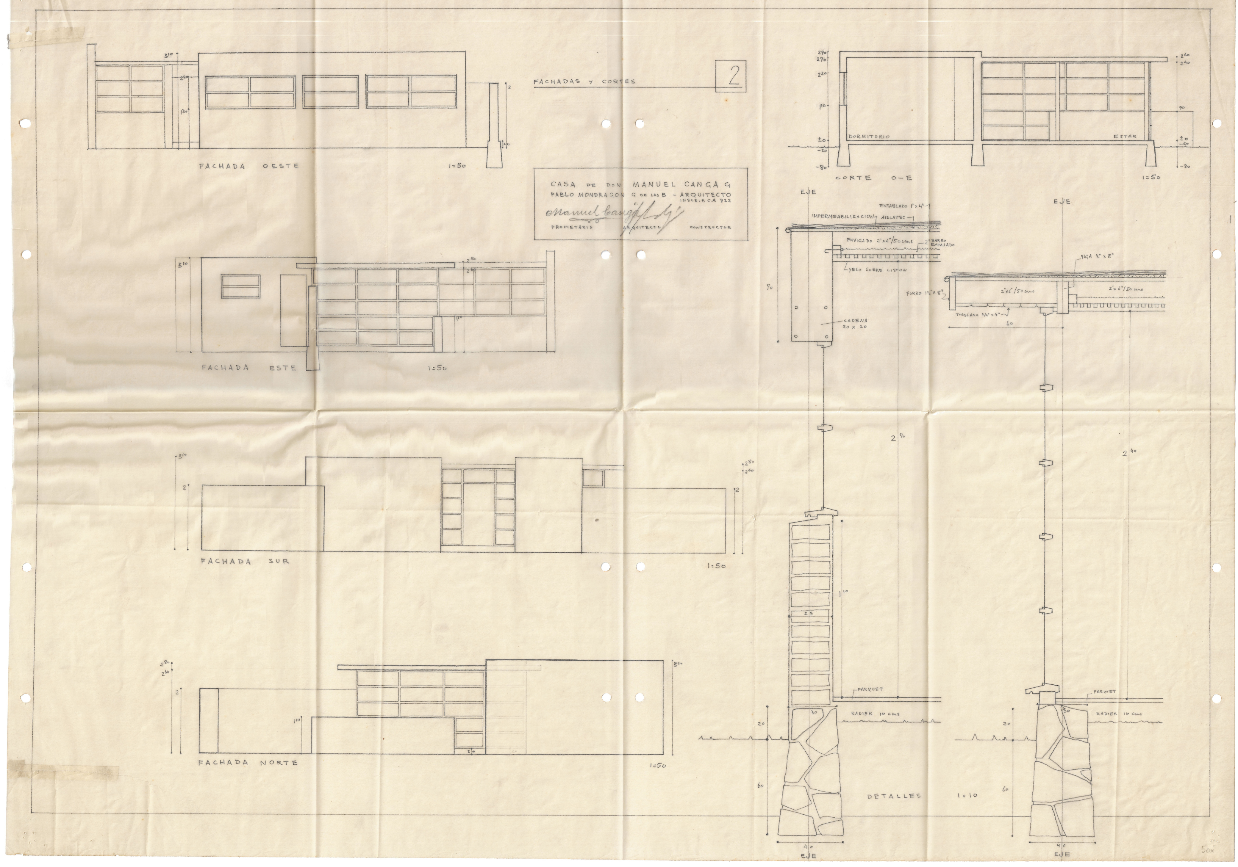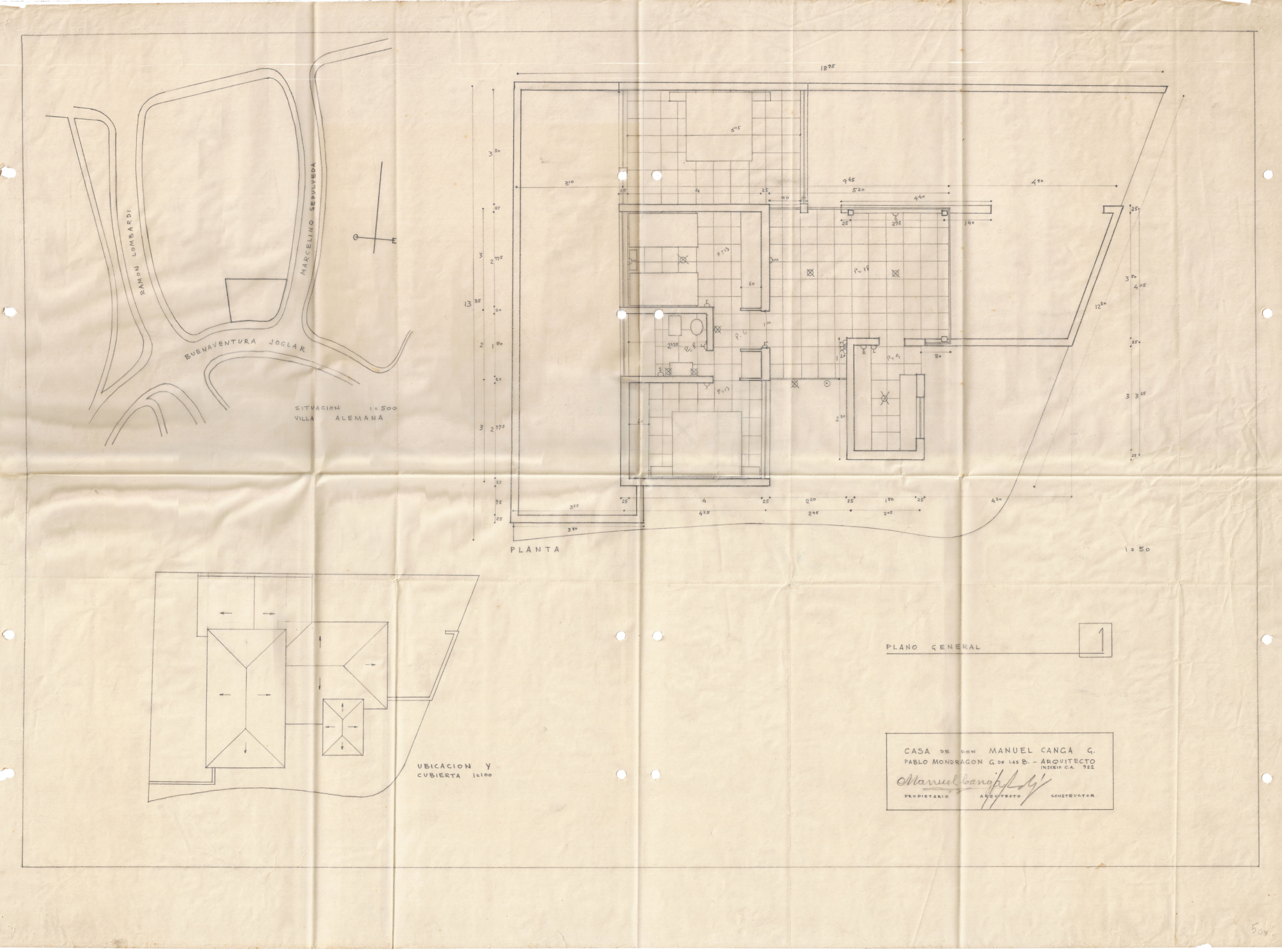 El proyecto de la casa Manuel Ganga G., ubicada en Villa Alemana, incluye un plano general en escala 1:50, donde se aprecian los detalles de la planta. También incorpora la ubicación del inmueble en escala 1:500. En el plano siguiente se presentan las fachadas en diferentes orientaciones en escala 1:50. Además, se adjuntan el presupuesto y las especificaciones técnicas de la obra.