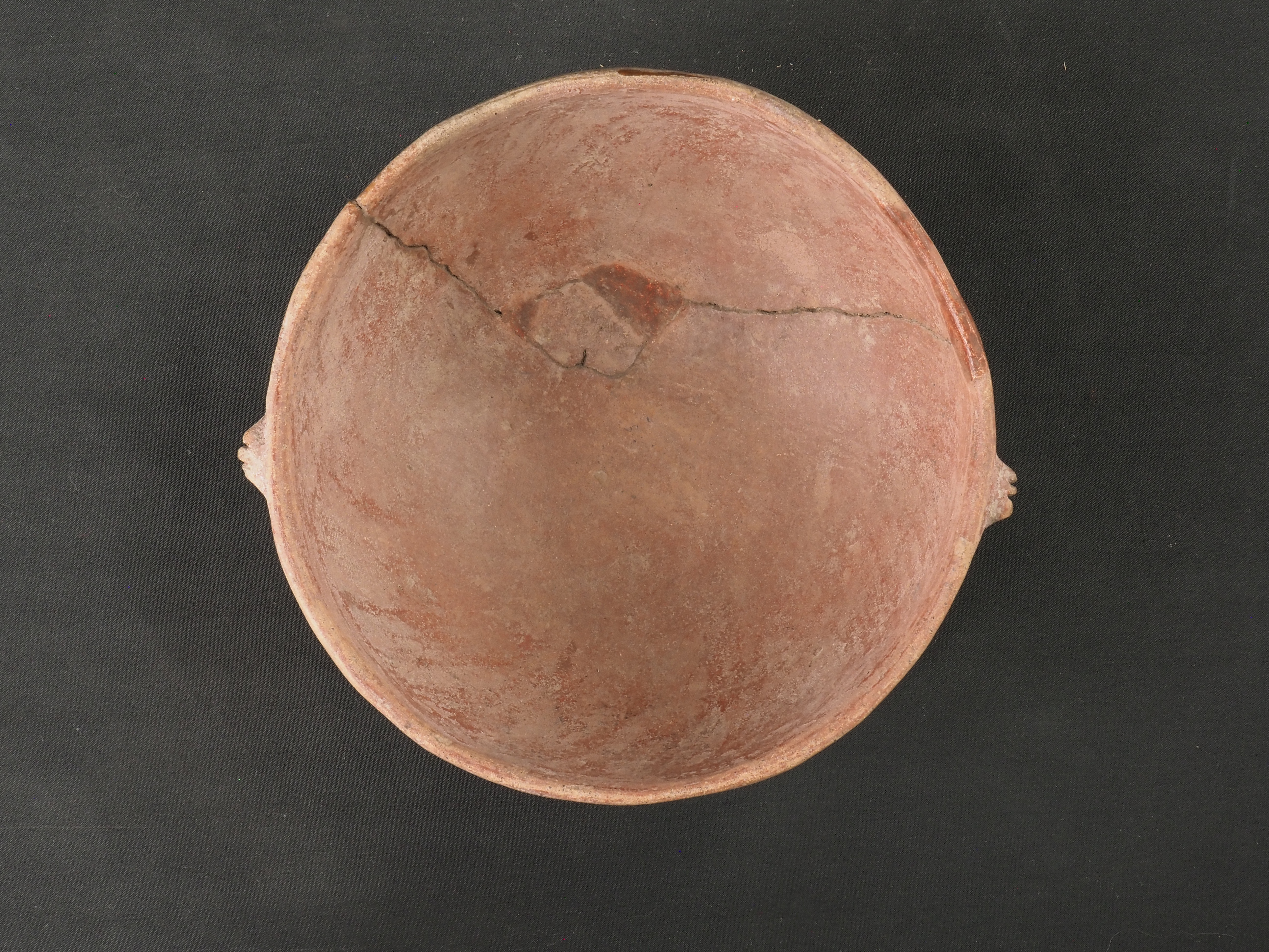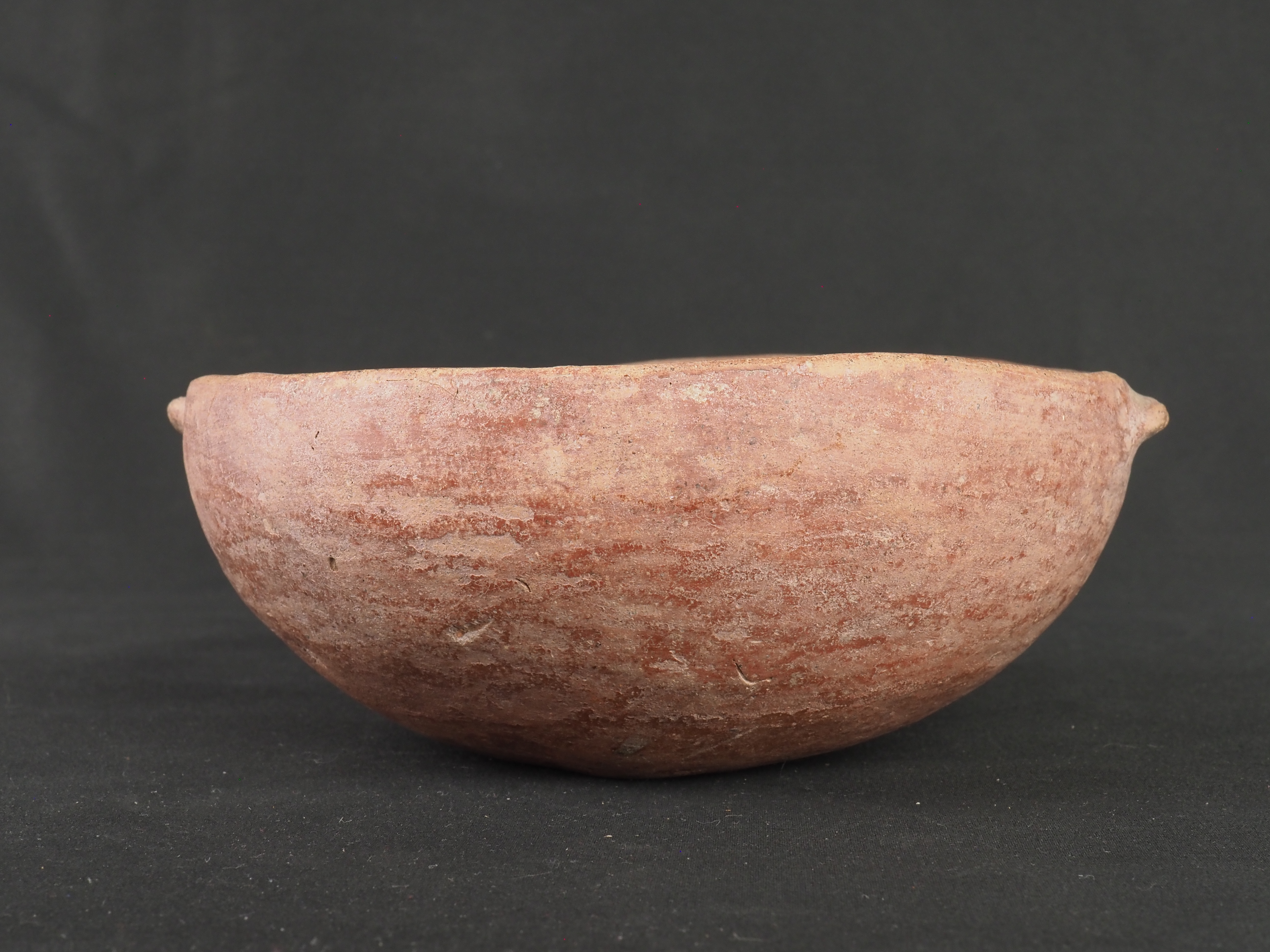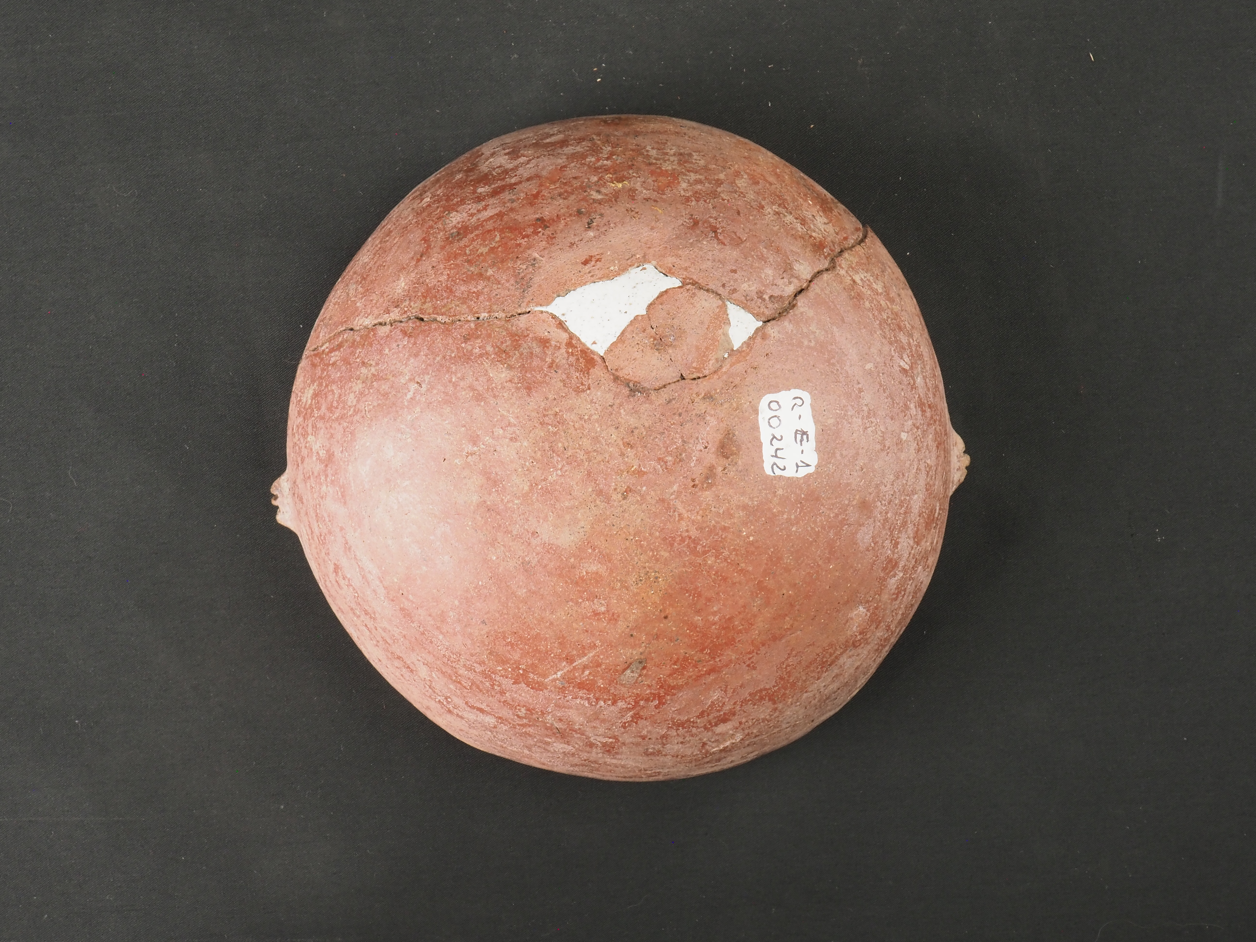 Contenedor abierto, rojo engobado. Posee dos mamelones a manera de asas en el exterior cerca del labio. Técnica: Arcilla modelada, alisada, pulida y bruñida. Cerámica engobada policroma. Morfología: Objeto simétrico de estructura no restringida, perfil simple, cuerpo esférico, borde invertido, labio redondeado y base curva. La unidad estructural del objeto se presenta en fragmentos unidos.