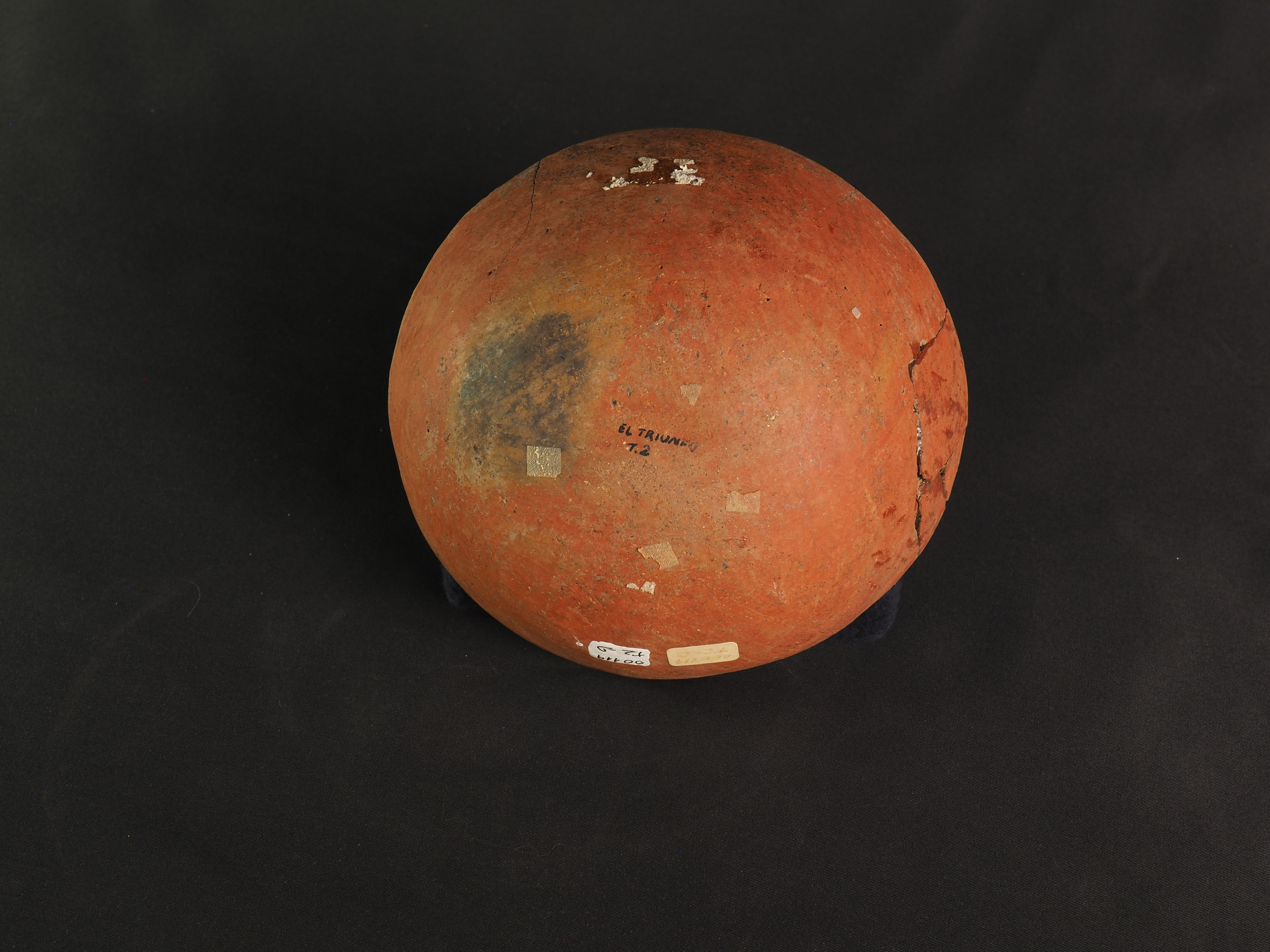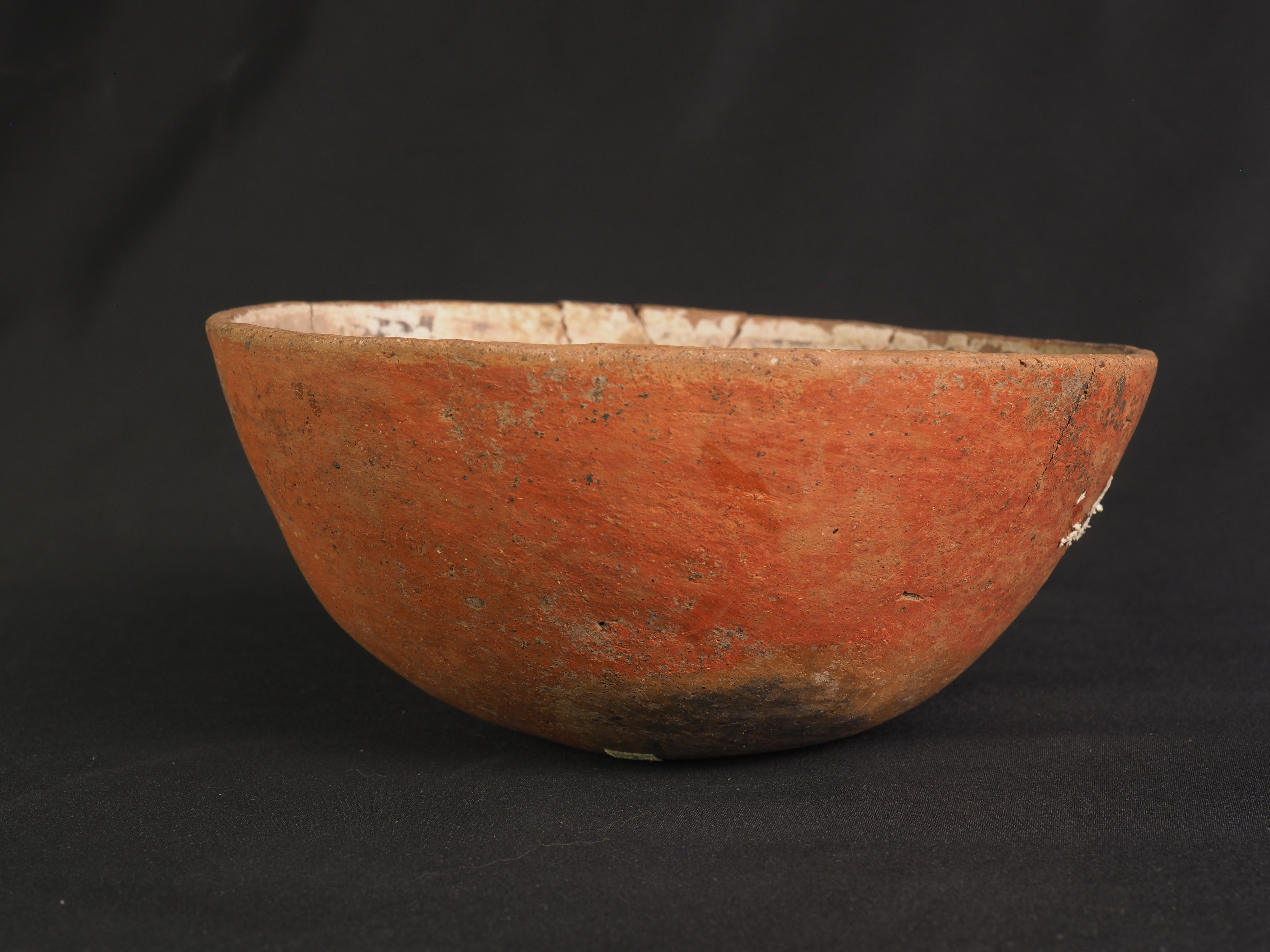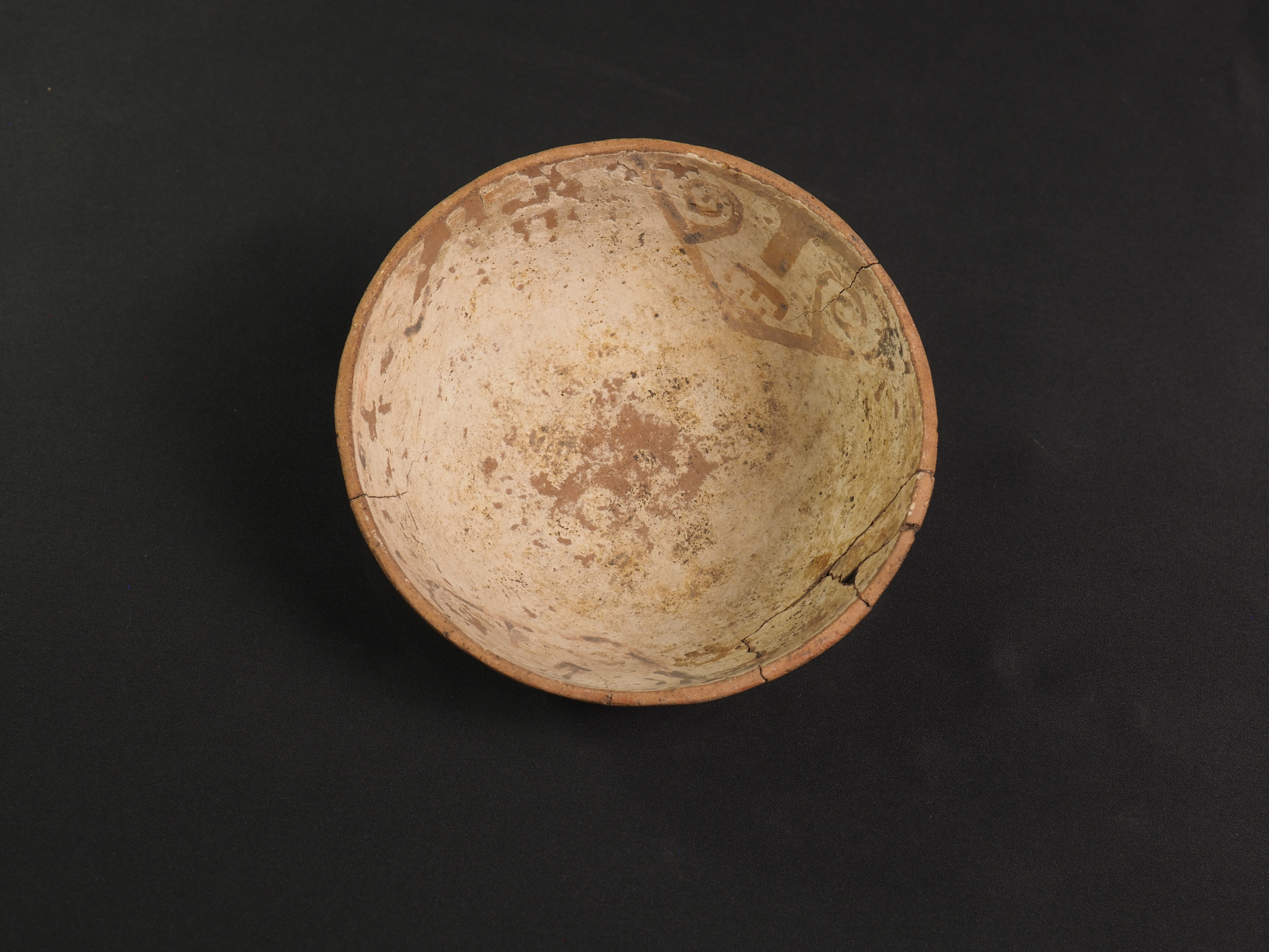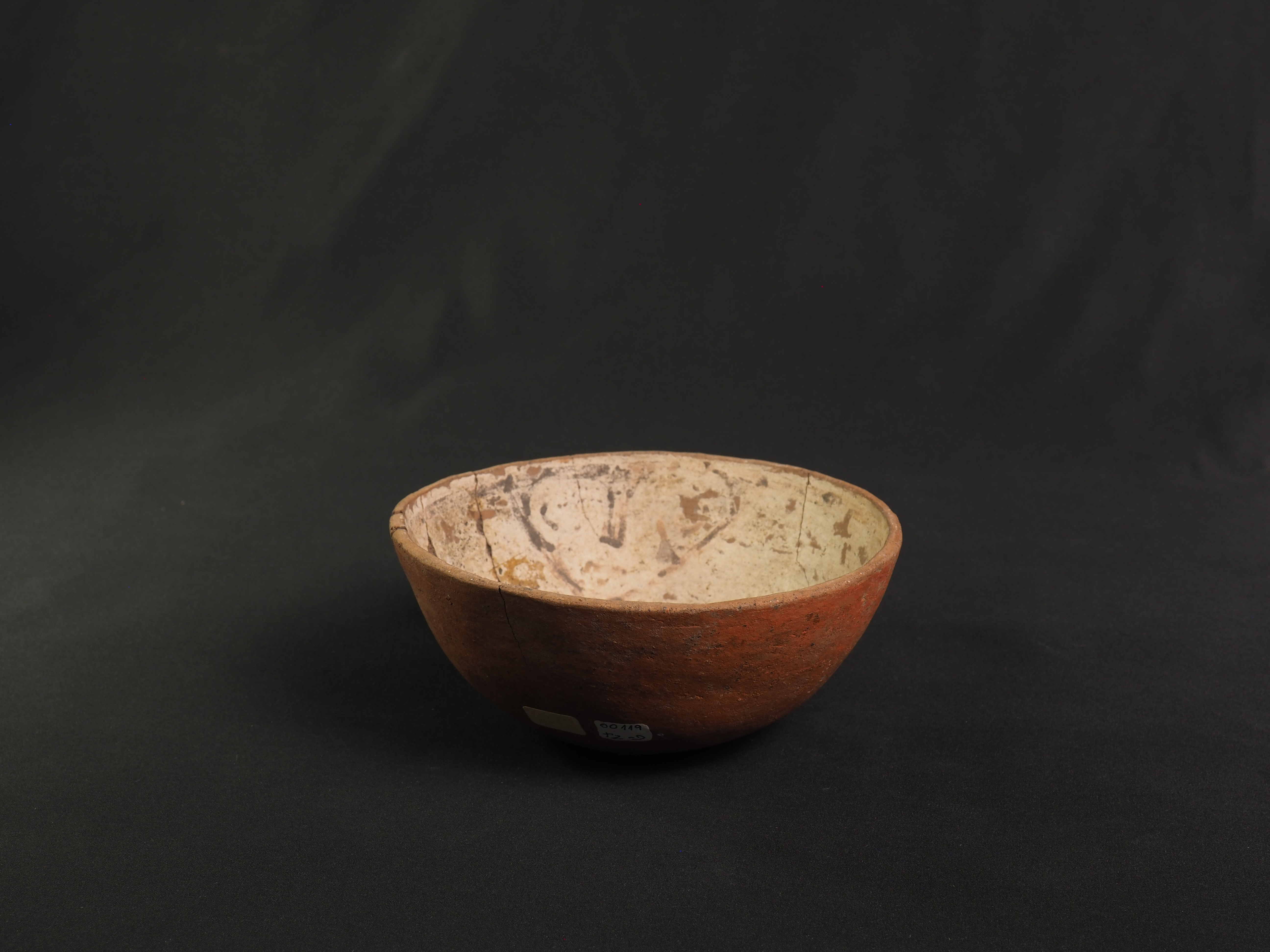 Contenedor abierto, rojo engobado en exterior y engobe blanco en interior sobre el que es posible apreciar un rostro zoomorfo en pigmento rojo, que lo vincula a la cultura Copiapó. Técnica: Arcilla modelada, alisada, pulida y bruñida Cerámica engobada policroma. Morfología: Objeto simétrico de estructura no restringida, perfil simple, cuerpo esférico, borde invertido, labio redondeado y base curva. La unidad estructural del objeto se presenta en fragmentos unidos con sección faltante en el borde.