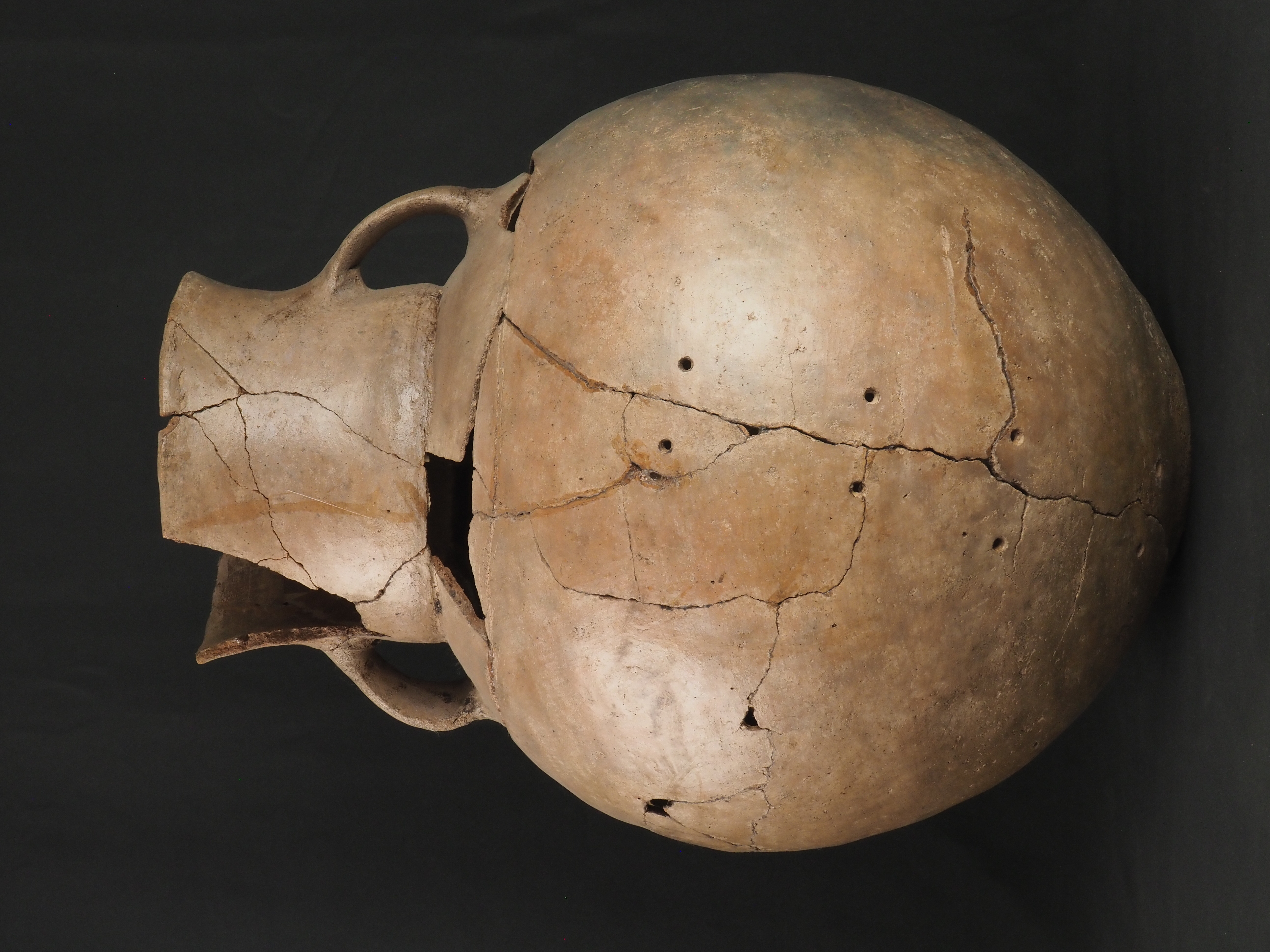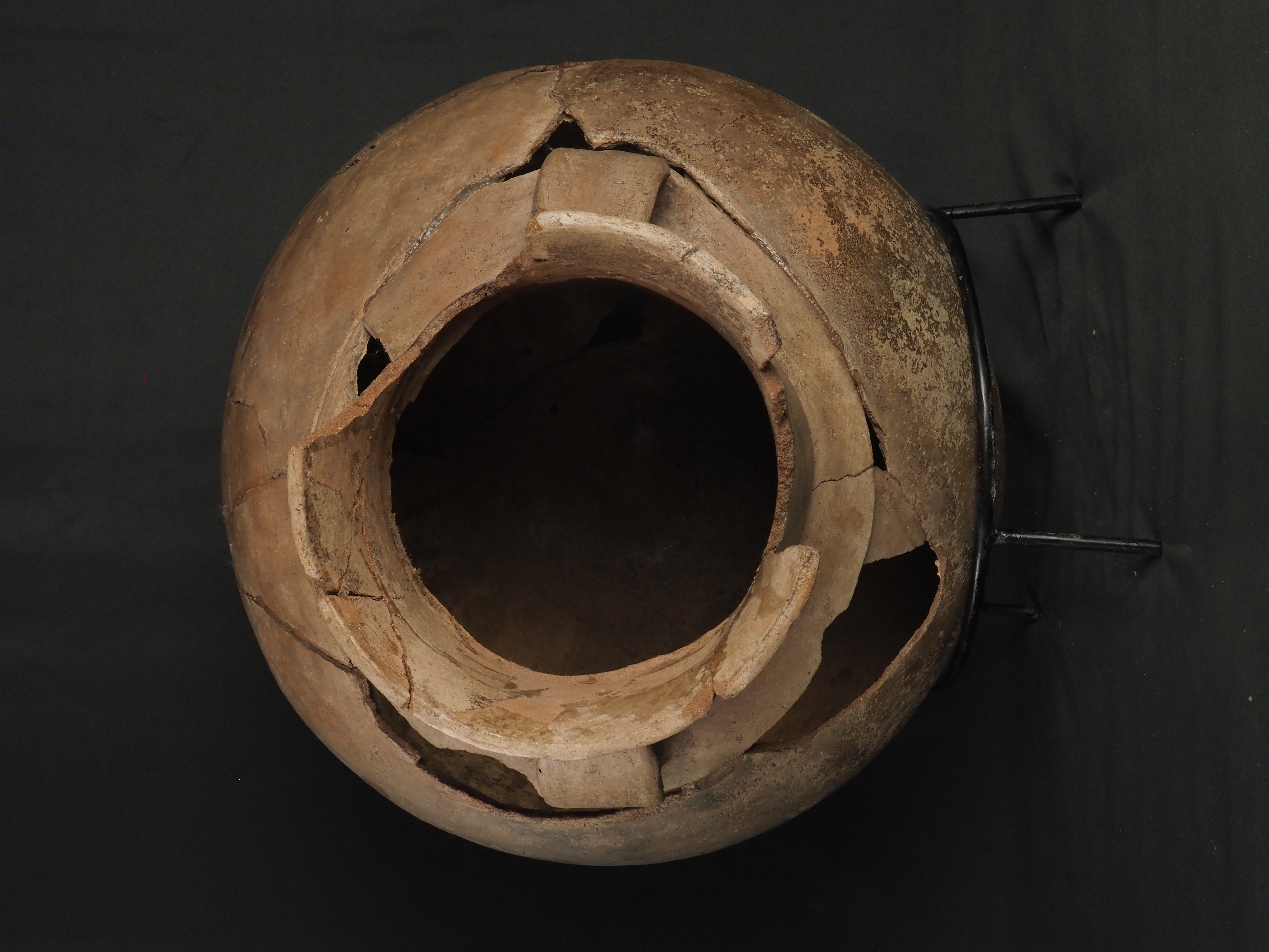 Contenedor monócromo grisáceo, no presenta adiciones. Técnica: Arcilla modelada, alisada, pulida, bruñida. Morfología: Objeto simétrico de estructura restringida, perfil compuesto, cuerpo esférico, cuello hiperboloide, borde invertido, labio redondeado, dos asas verticales de arco planas elipsoidales emplazadas entre el cuello y el cuerpo y base cóncava. La unidad estructural del objeto se presenta en fragmentos unidos con secciones faltantes por contexto arqueológico de hallazgo y, además, pequeños agujeros esféricos realizados en contexto de uso para restauración de valores utilitarios.