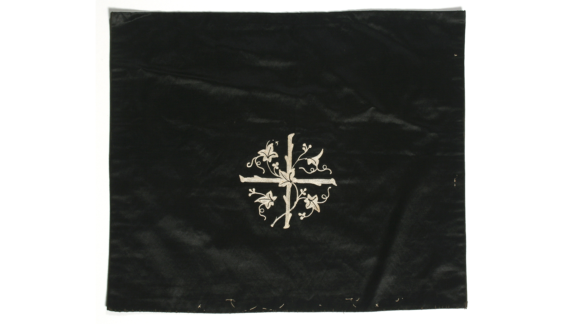 Black satin with rustic cross with embroidered flowers in gray at the center. Remnants of embroideries on the edges.