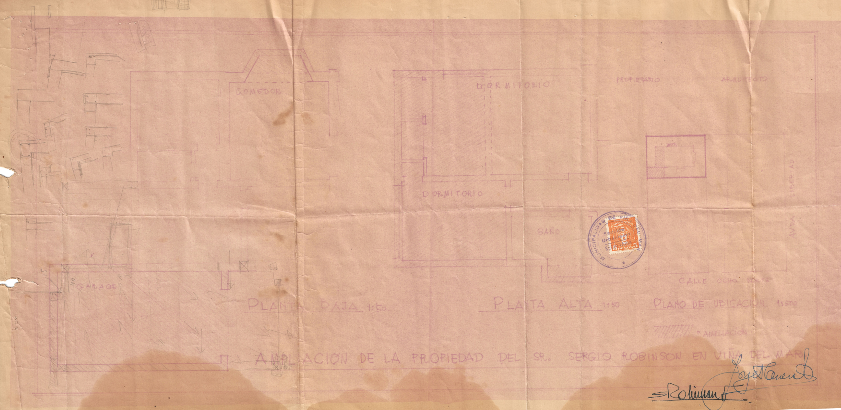 Casa Sergio Robinson, ubicada en Ocho Norte, Viña del Mar, e incluye el Plano 1, compuesto por un plano de ubicación en escala 1:500 junto con las fachadas y las plantas alta y baja de la vivienda. Además, se incorporan cuatro planos adicionales que registran una ampliación posterior realizada a la propiedad por el arquitecto Pablo Mondragón, y cuatro croquis de la fachada, elaborados desde diferentes orientaciones.