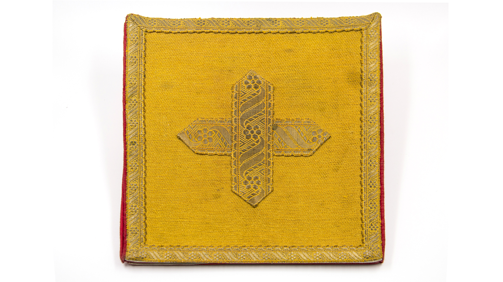 Golden lamé with golden ribbon on the edges, forming a cross in the center.