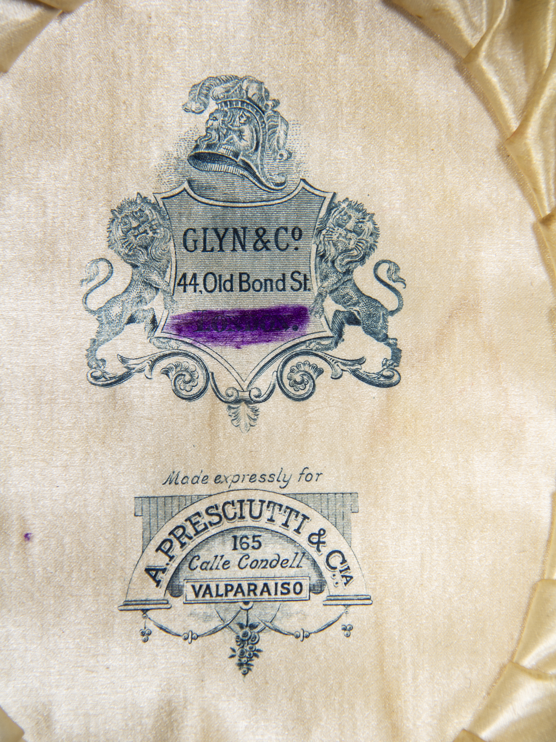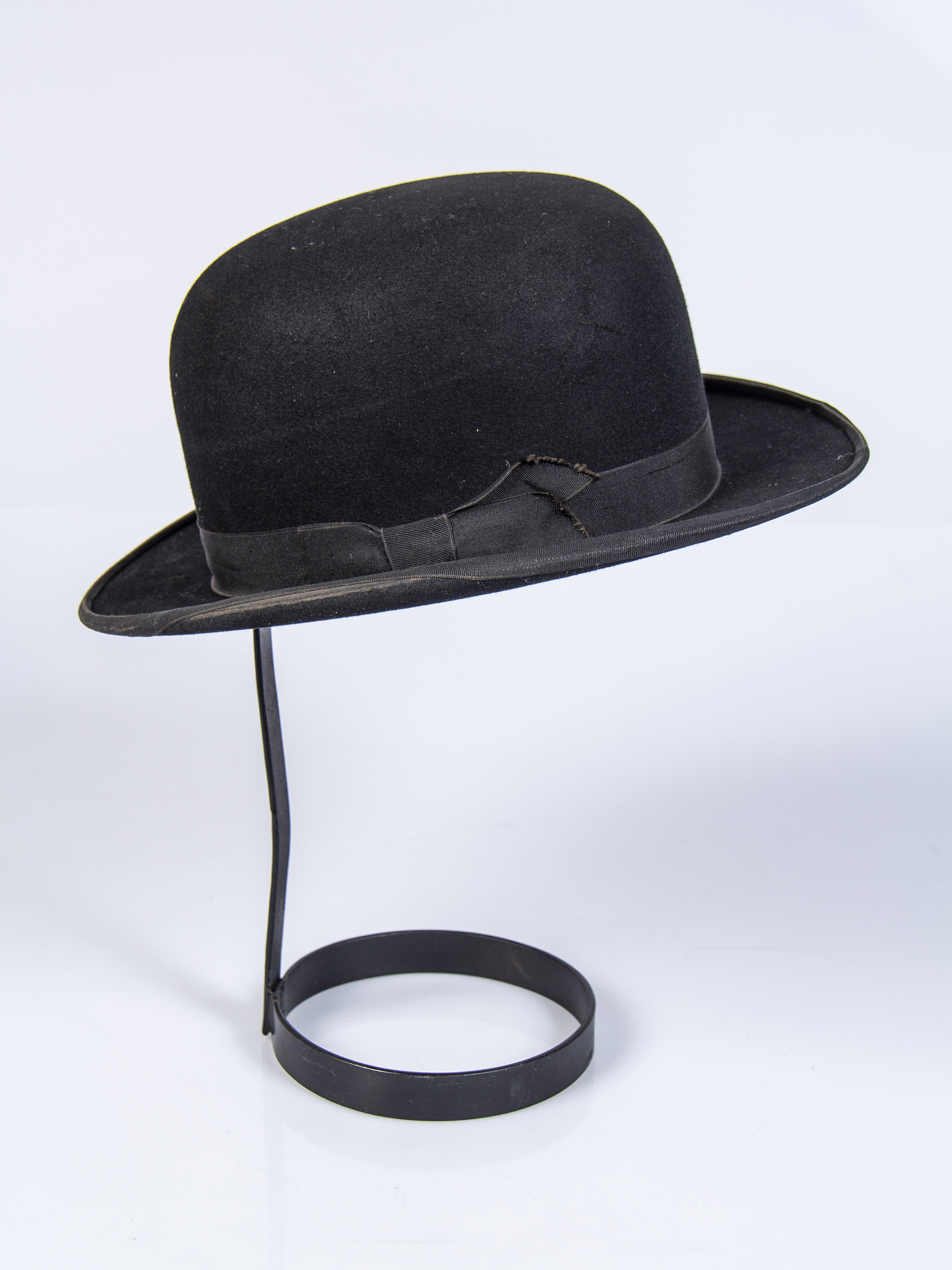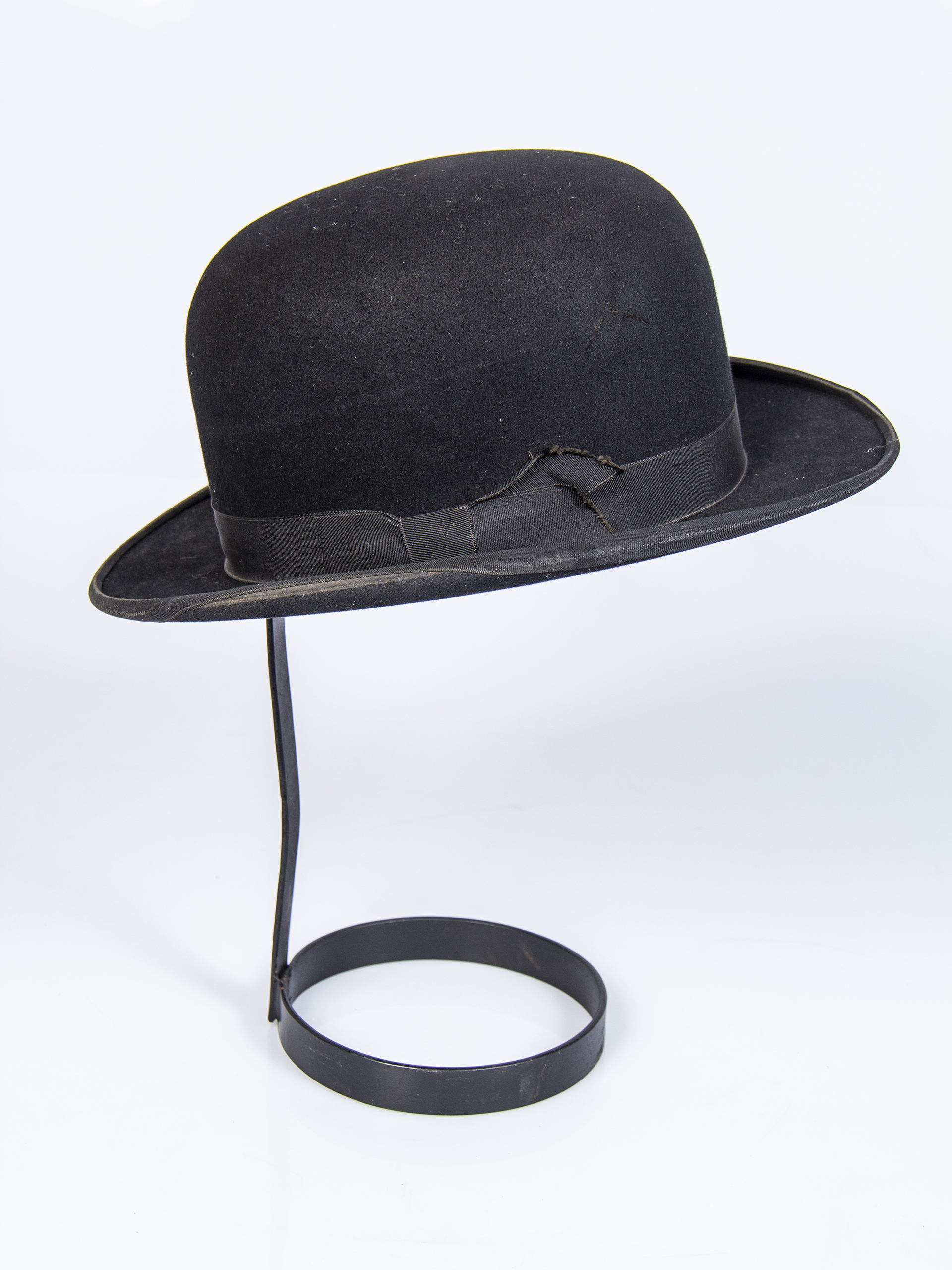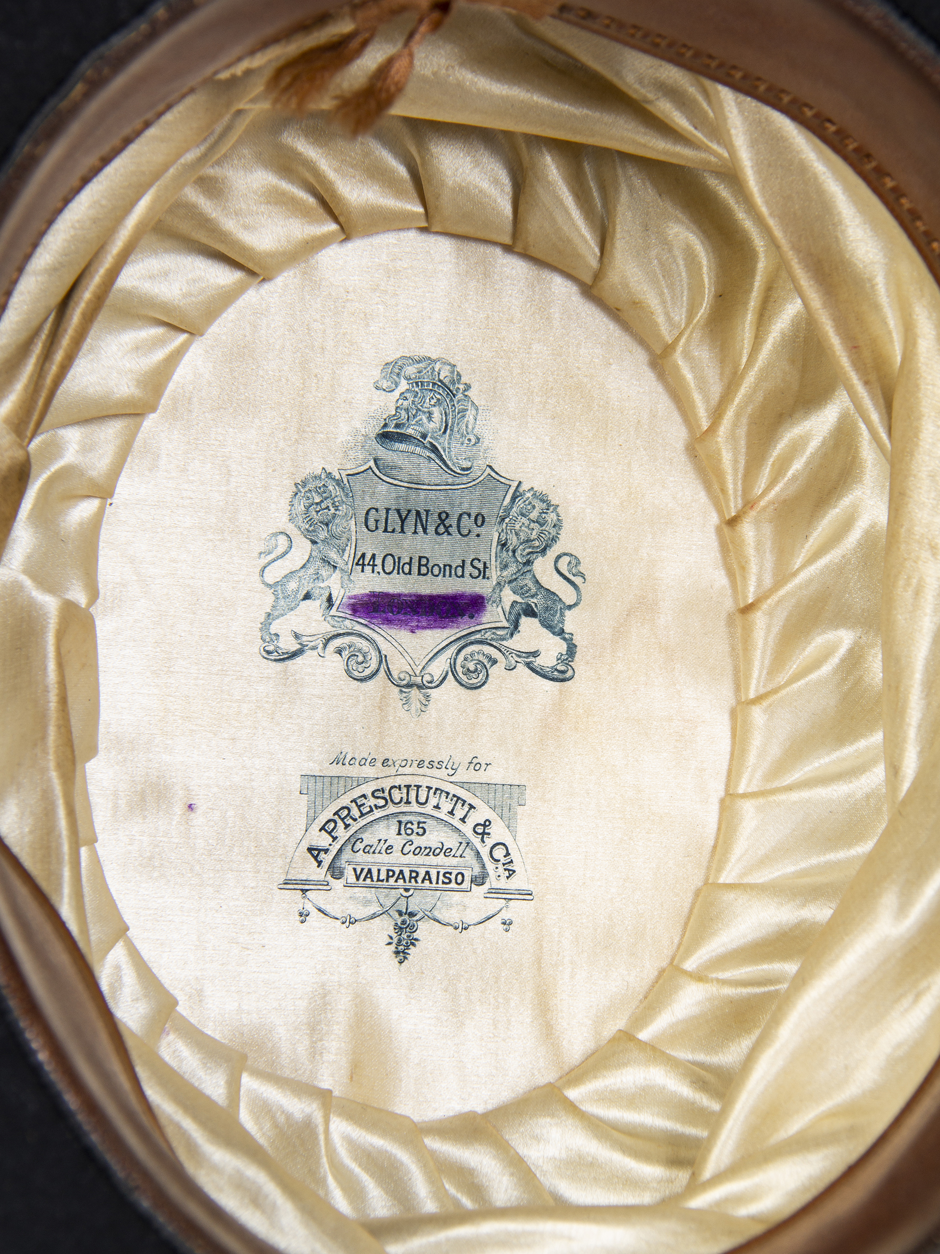 Sombrero de hombre tipo bombín de fieltro negro con cinta negra en la banda. Fabricado exclusivamente en Londres en fábrica Glyn & Co., que se ubicaba en 44 Old Bond St.para A. Presciutti & Cía., sombrerería chilena ubicada en calle Condell 165, Valparaíso.