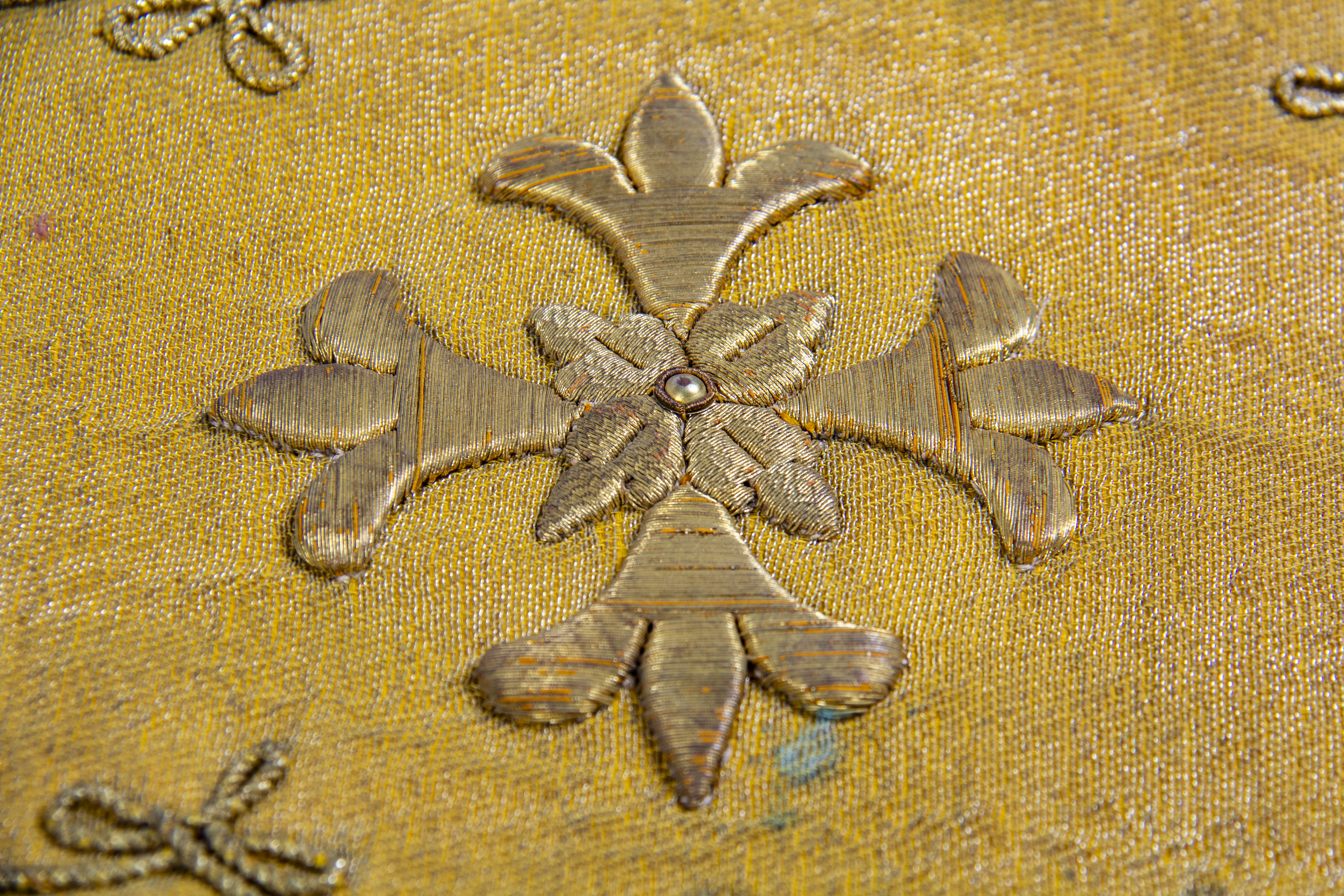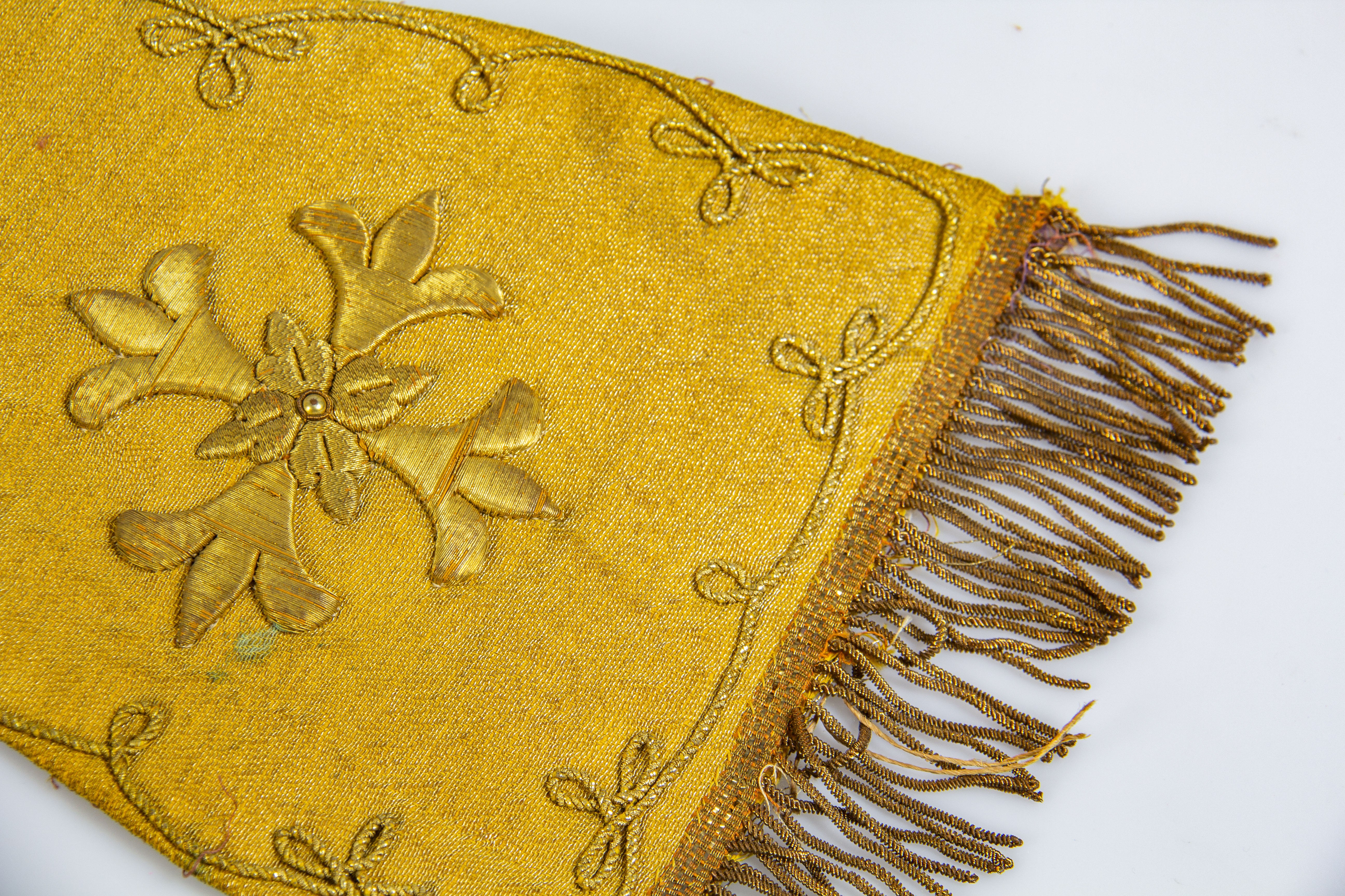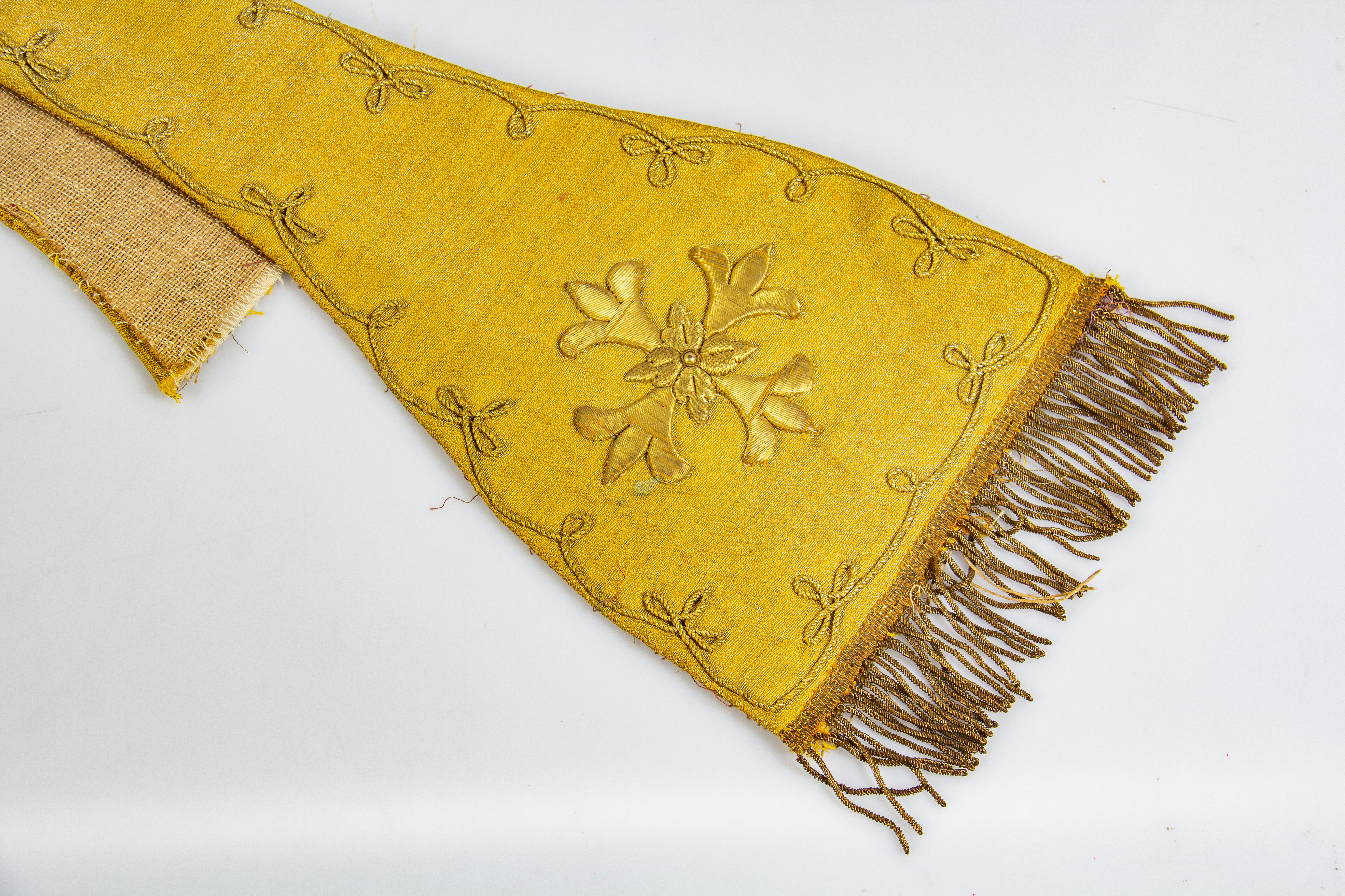 Tela metálica dorada con bordado flor de lis y flequillos cortos en extremo, orlas bordadas en contorno. Posee un gran faltante en su extremo y tiene manchas de suciedad.