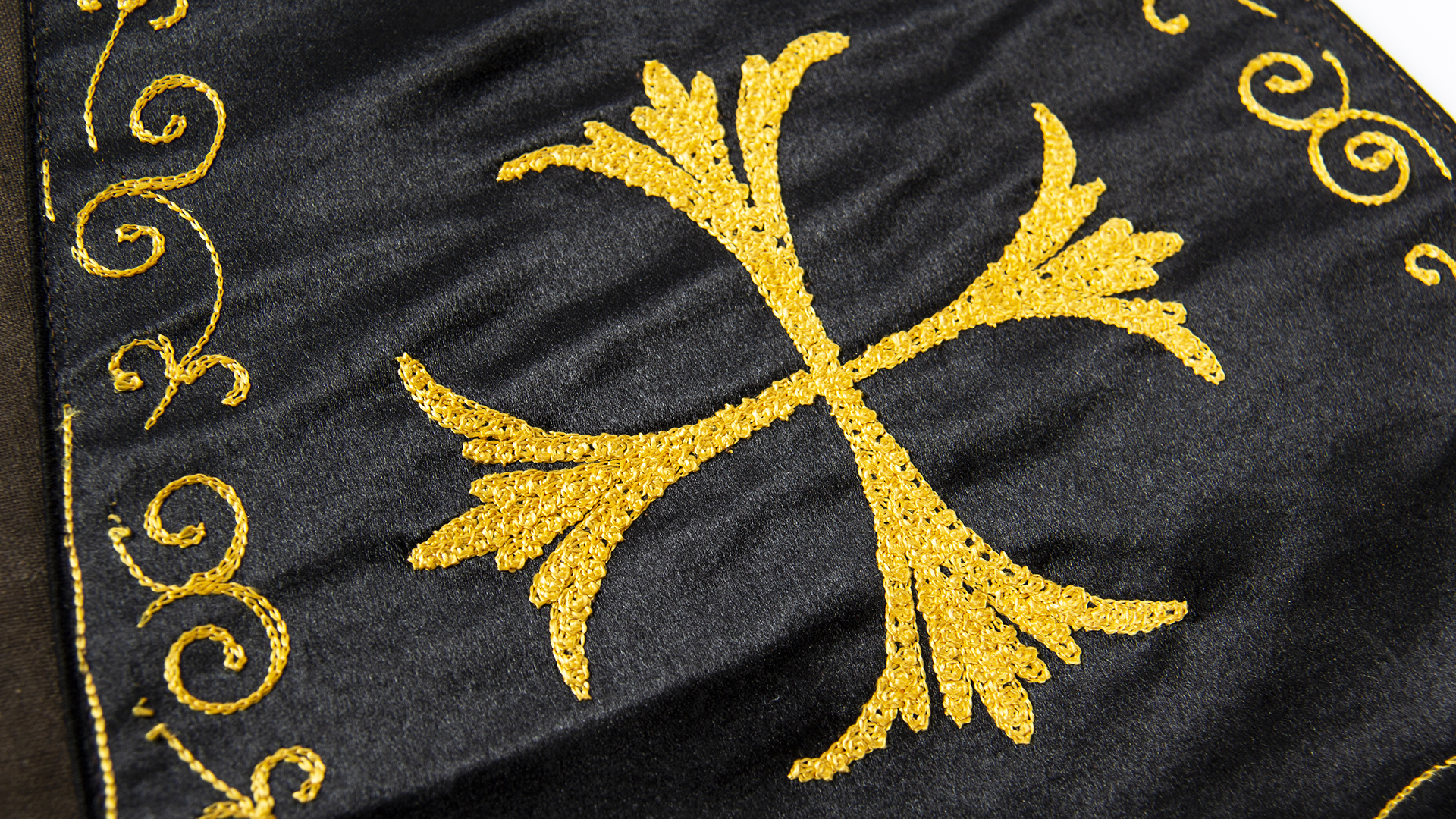 dc.description | dc.description | Black satin flared shape with golden embroidered cross at the ends and edges. | |