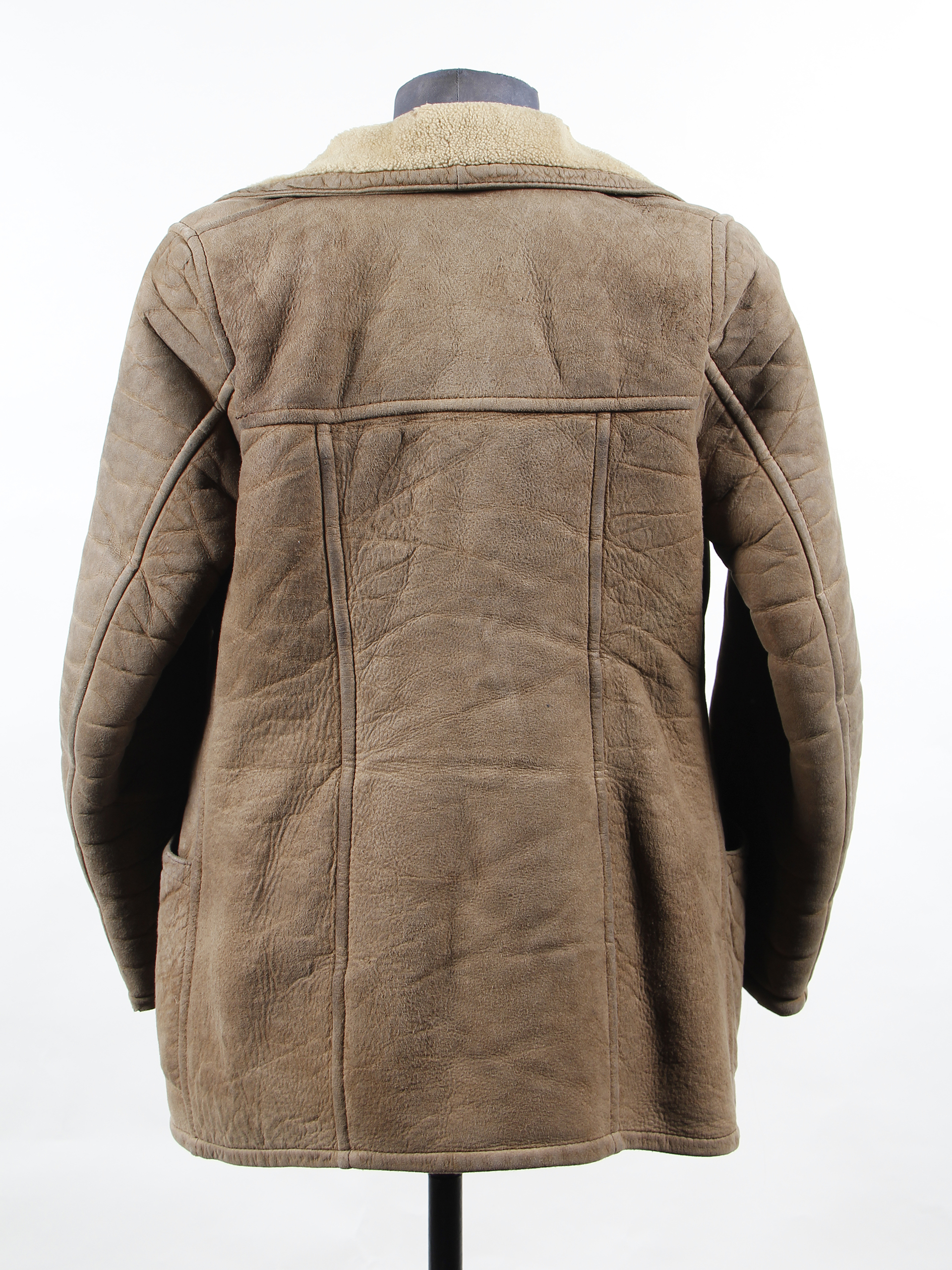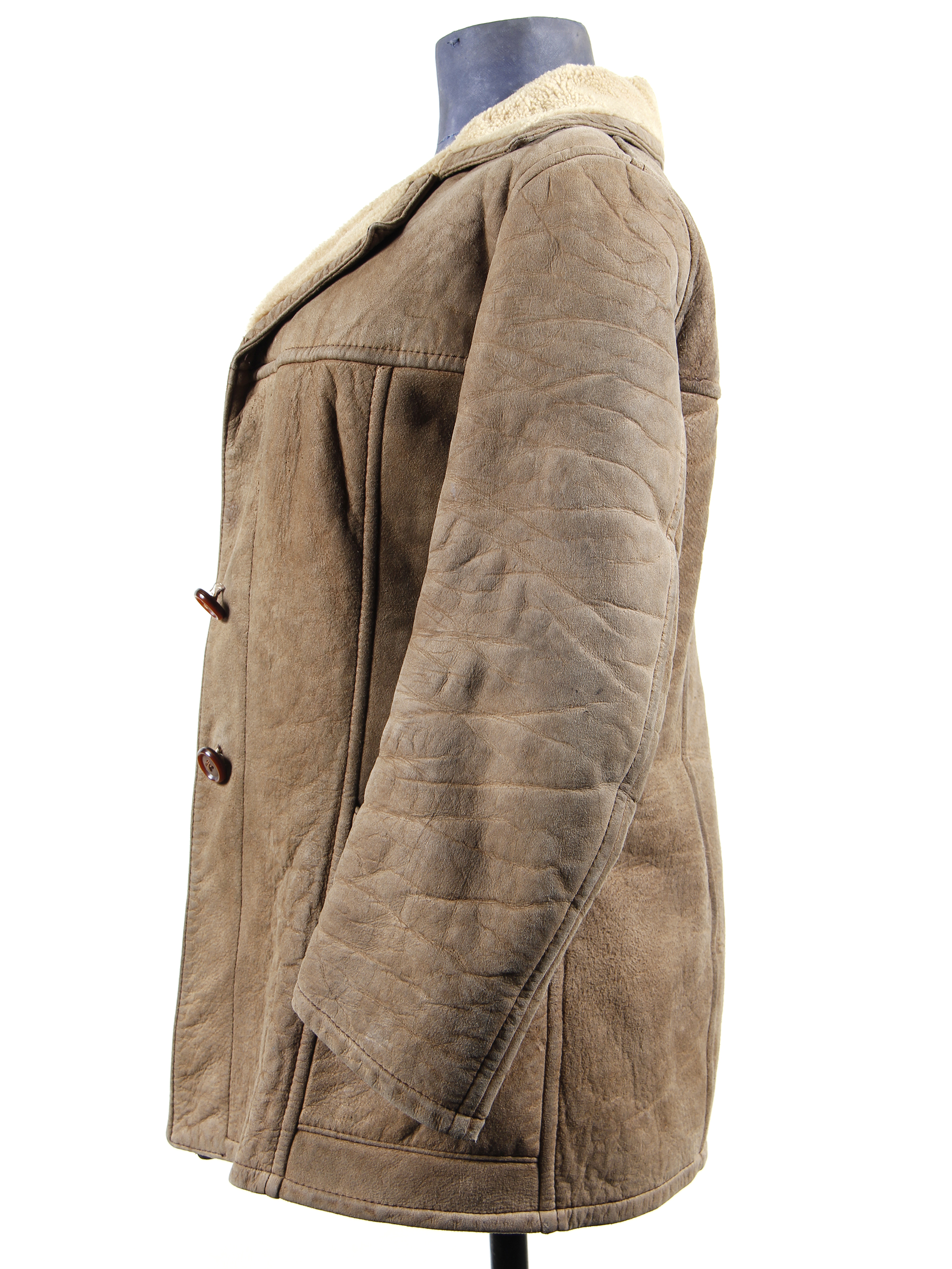 Women's shearling jacket made of natural leather, synthetic sheepskin lining, lapel collar, and 3 brown buttons. There is a patched tear on the upper part of the right sleeve, and the top button is missing. Tailored by Carmen Gloria Gómez, who had a fur shop in Santiago located on Los Conquistadores Street with Carlos Casanueva.