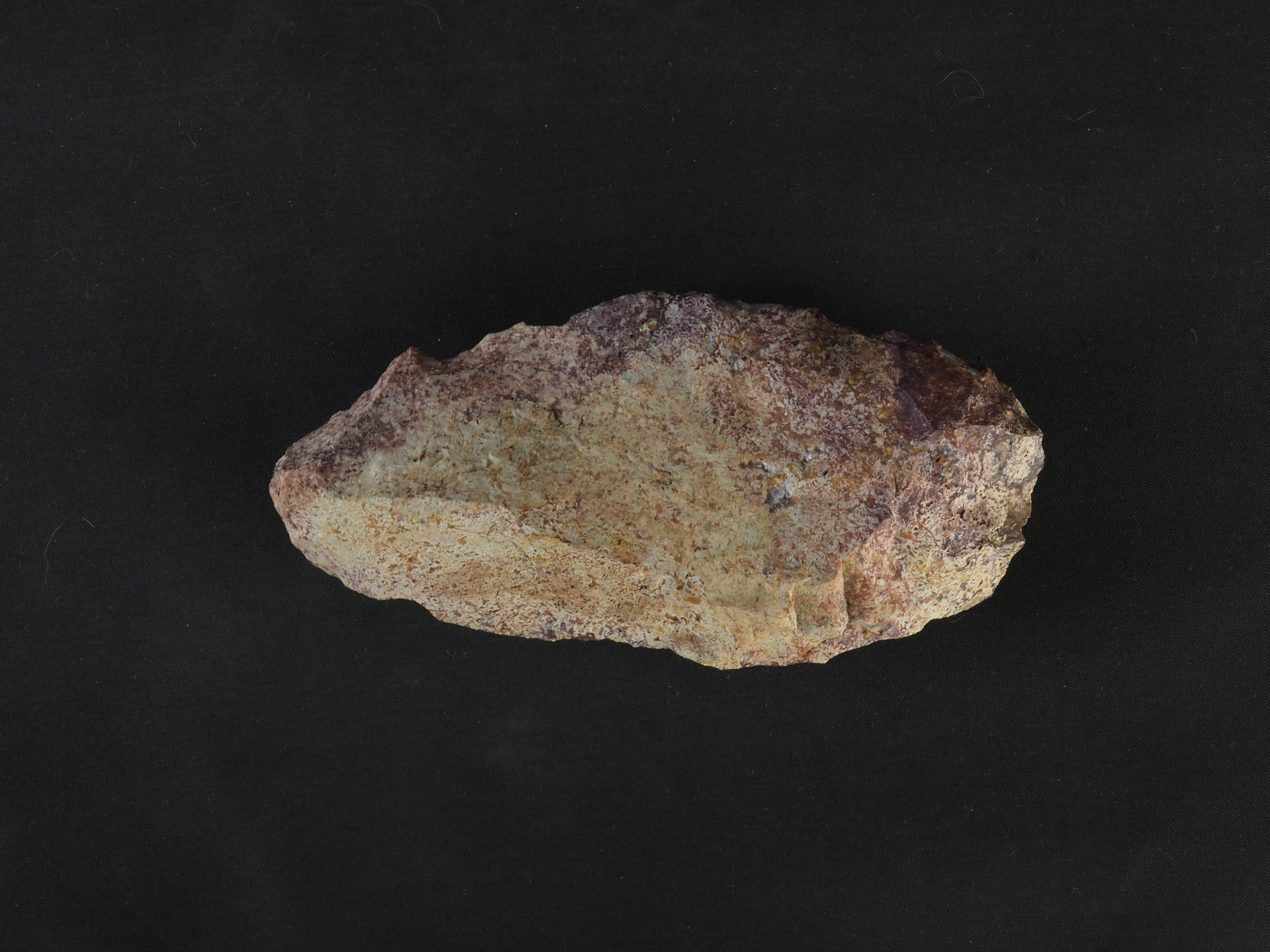 Objeto bifacial tallado con percutor duro de aristas rectificadas, caras talladas y cantos aguzados. Posible herramienta de corte. Técnica: Tallado con percutor y aristas rectificadas. Morfología: Objeto lítico de forma lanceolada, base redondeada, extremo distal terminante en punta y talla bifacial.