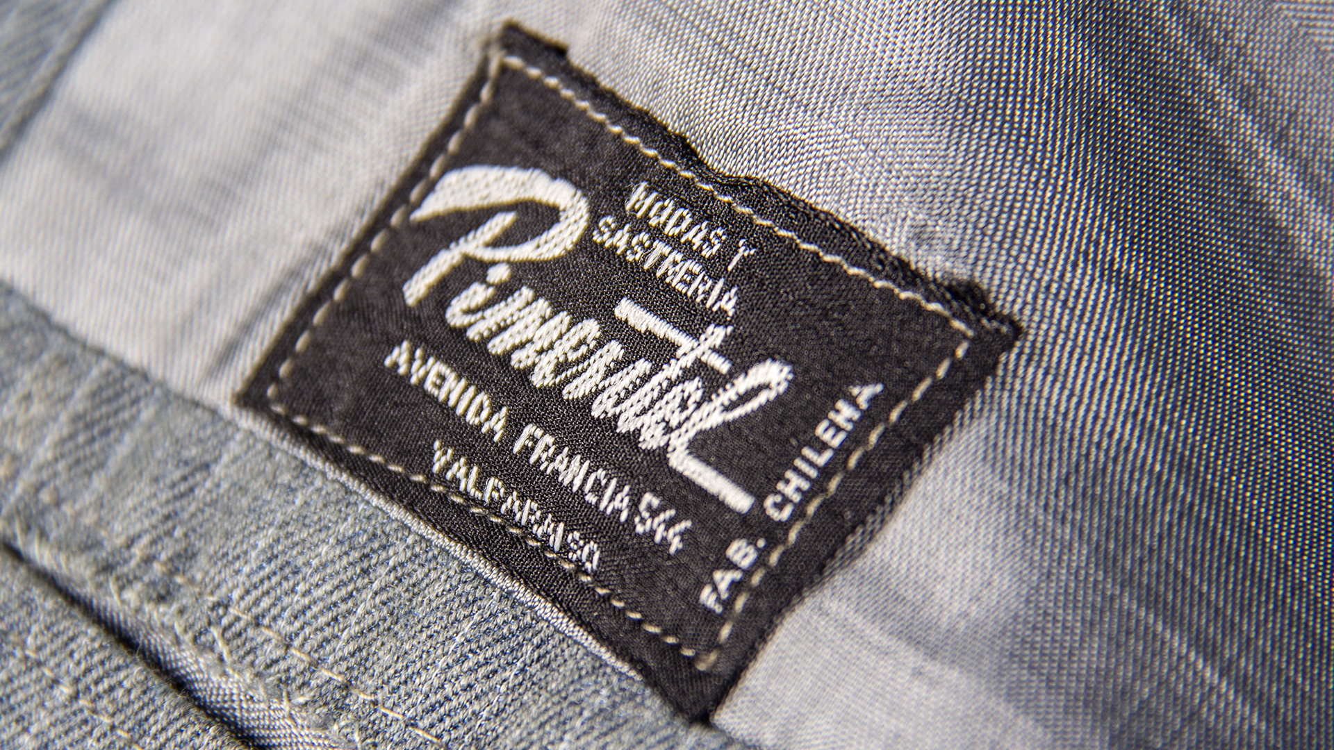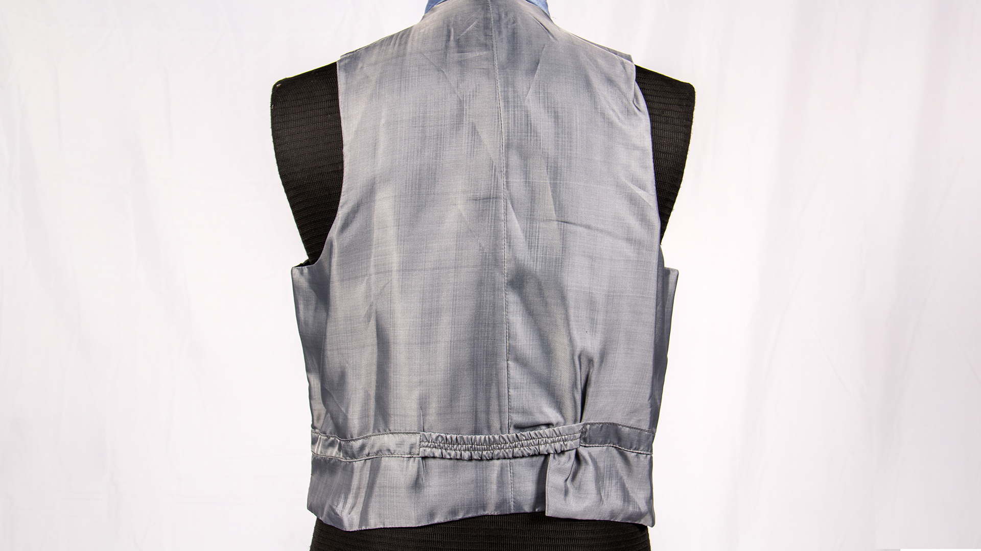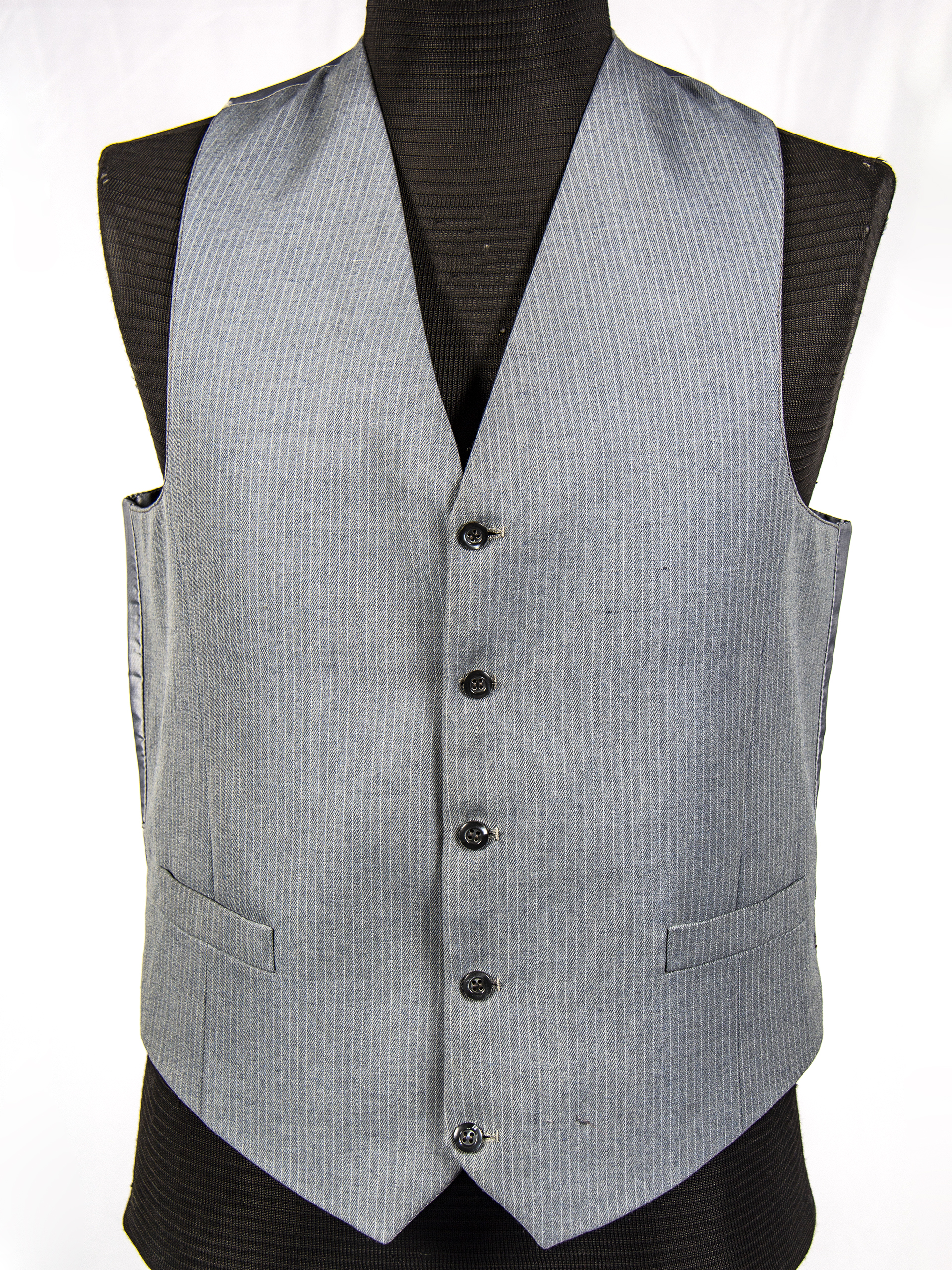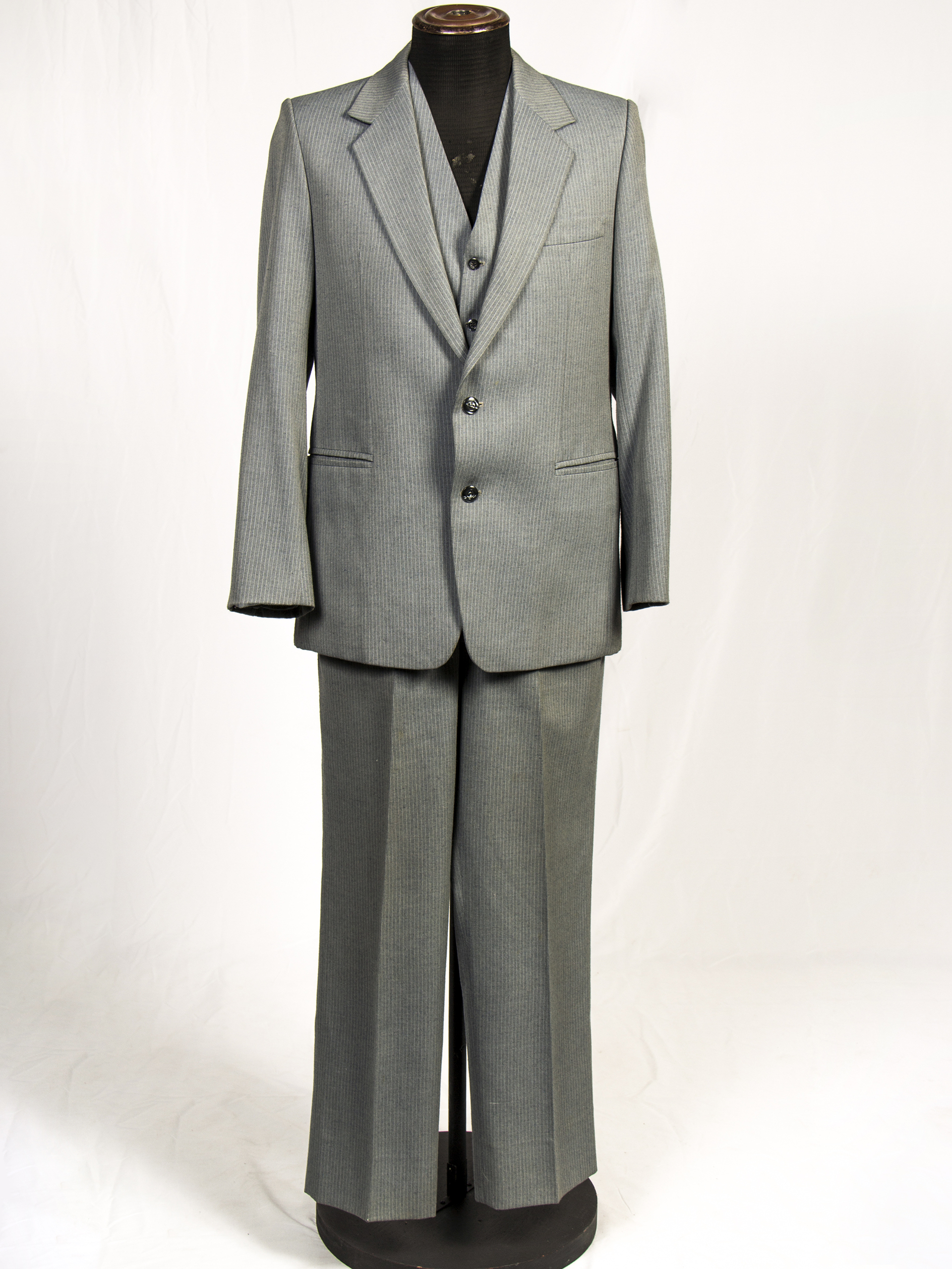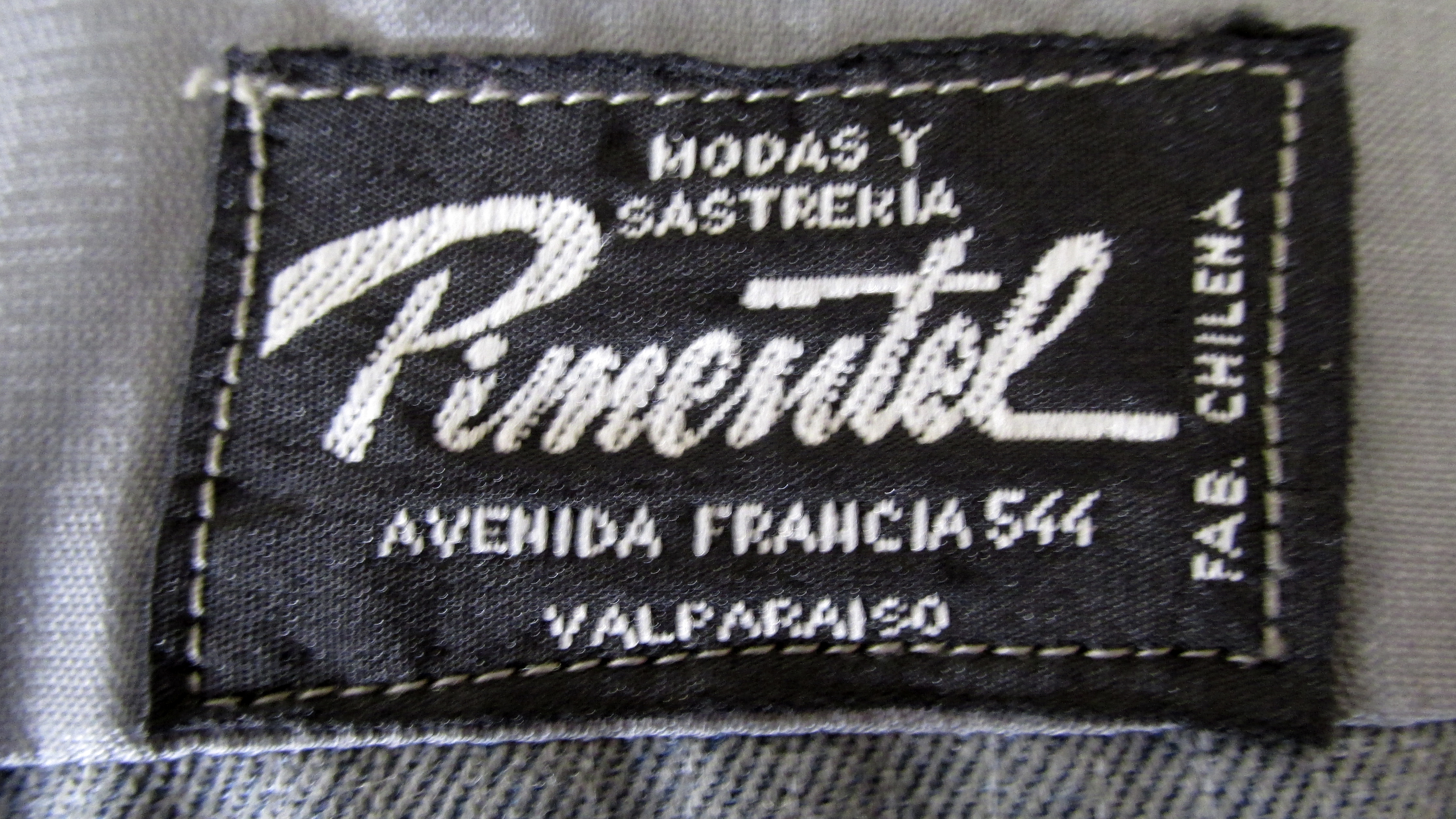 Gray three-piece suit. Trousers, gilet, and jacket, brand 'Modas y Sastrería Pimentel,' Av. Francia 544 - Valparaíso. Chilean manufacture.