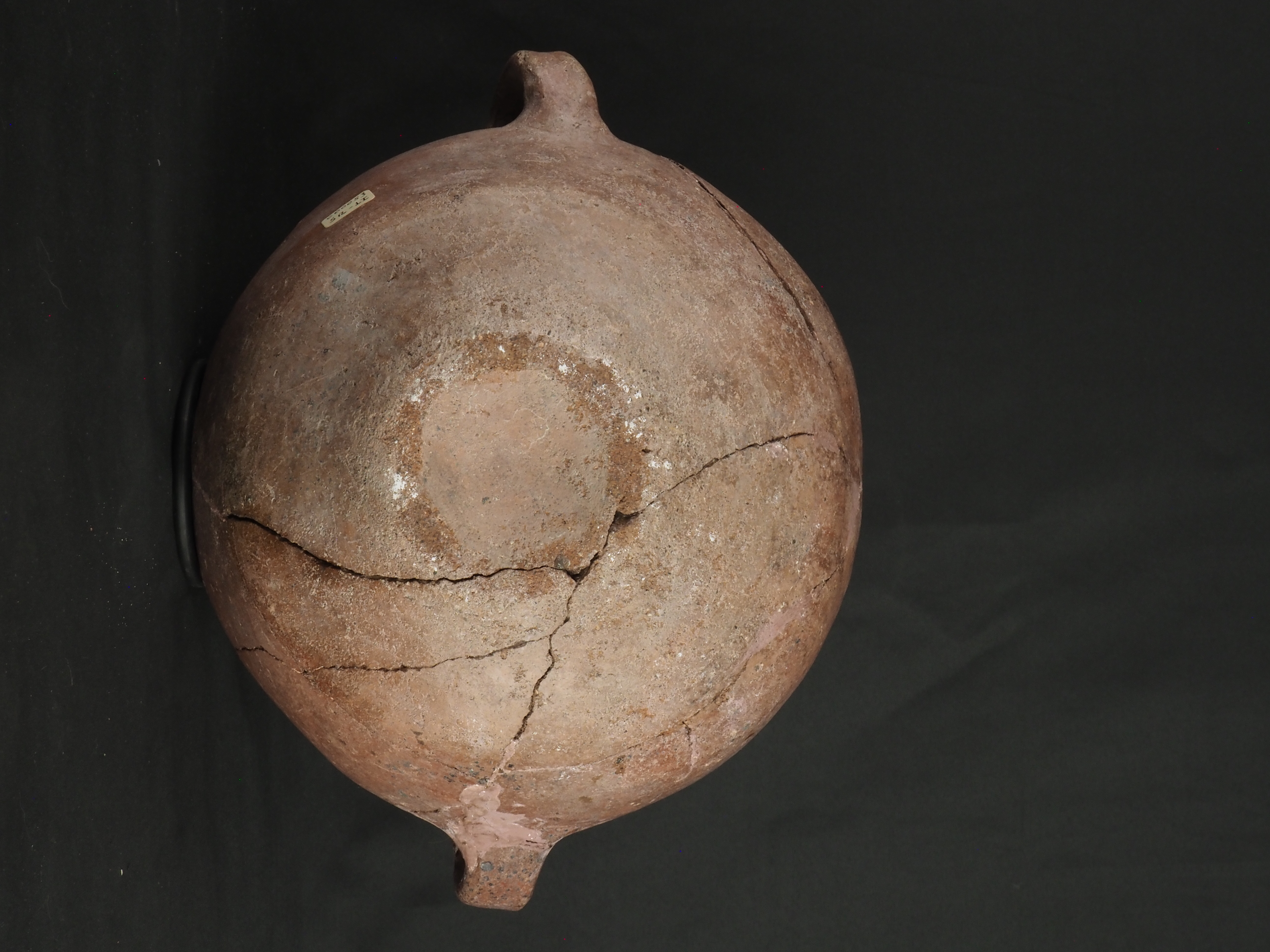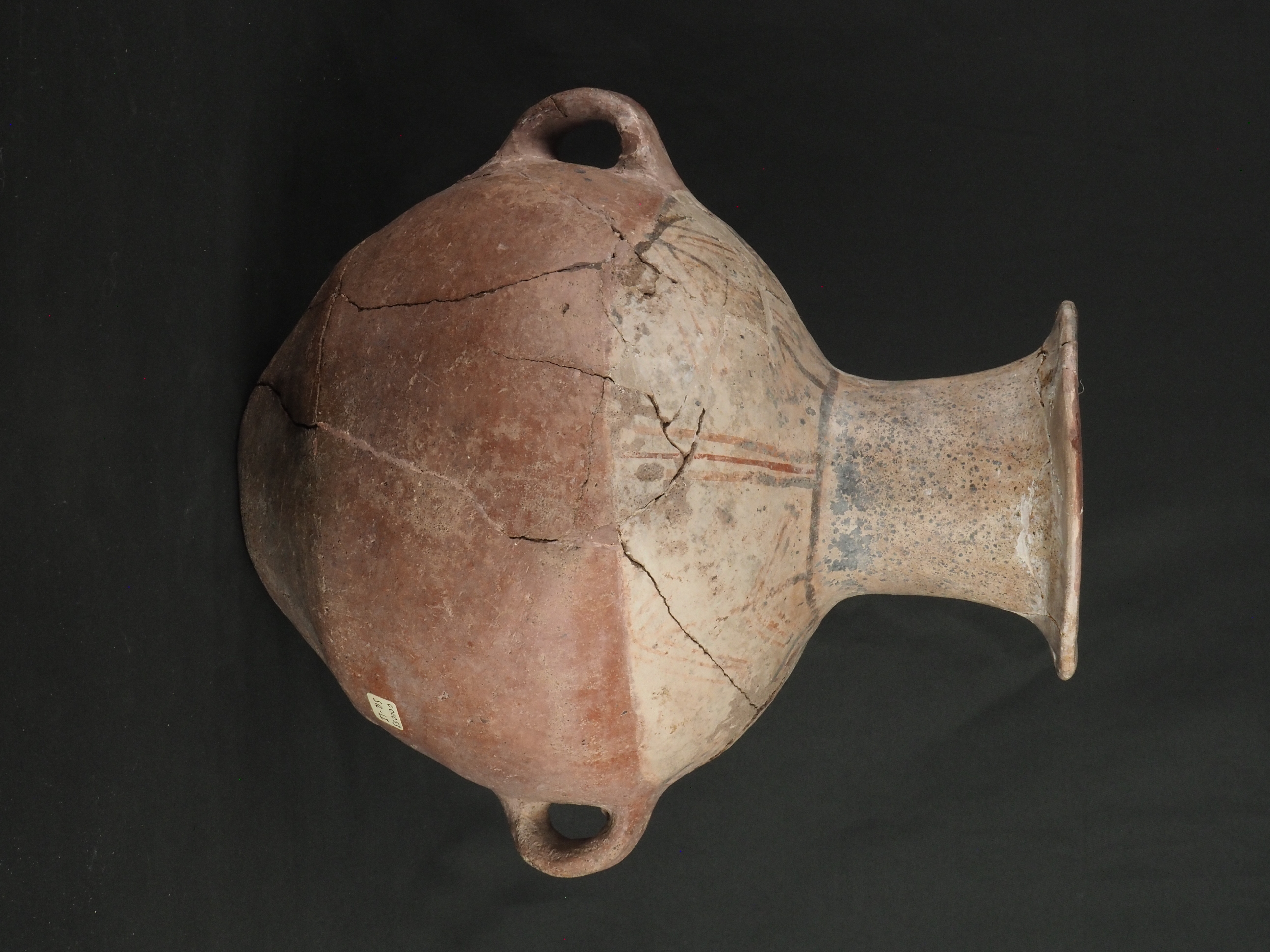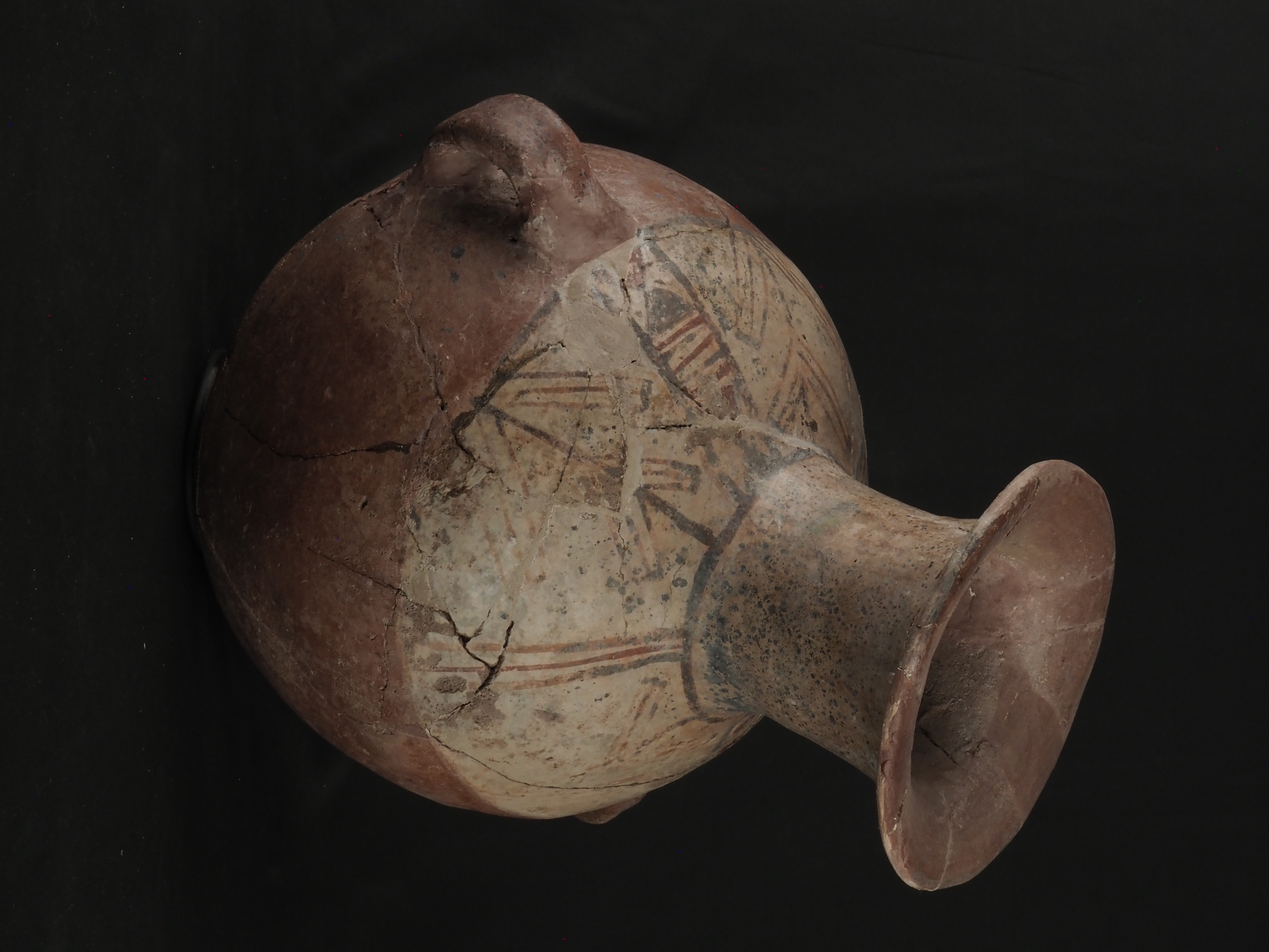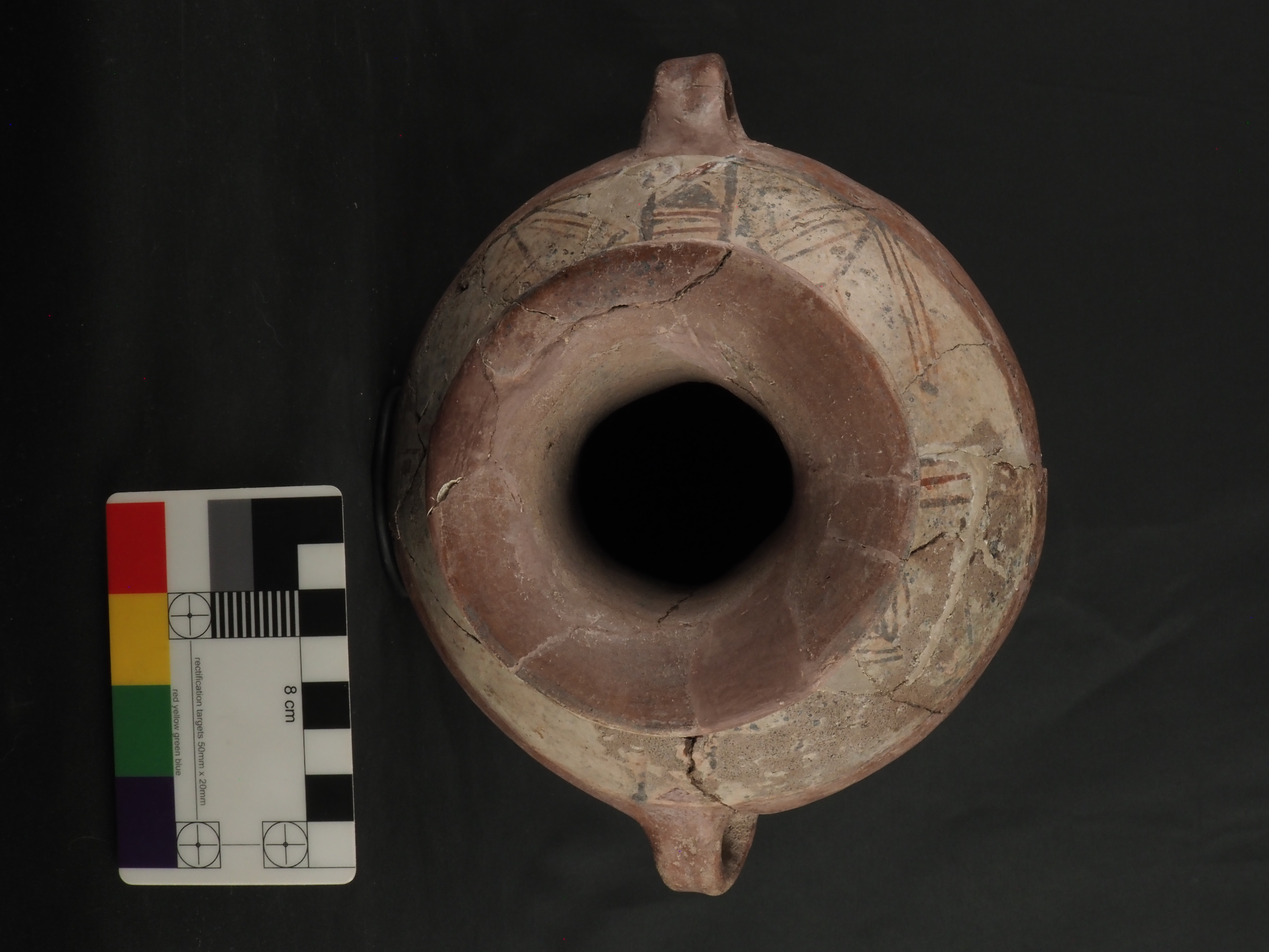 Objeto rojo engobado en la base exterior y en el borde interno del cuello. Posee engobe blanco en mitad superior del cuerpo sobre la que se distingue decoración geométrica fugitiva en pigmento rojo. Técnica: Arcilla modelada, alisada, pulida, bruñida. Cerámica engobada. Morfología: Objeto simétrico, restringido con cuello. De perfil inflectado, cuerpo esférico, cuello hiperboloide, borde hiperevertido, labio redondeado y base plana. Posee dos asas de arco lisas, verticales, sección subcircular emplazadas en el cuerpo. La unidad estructural del objeto se presenta en fragmentos unidos, con secciones faltantes sobre las que se evidencia reintegración volumétrica y cromática.