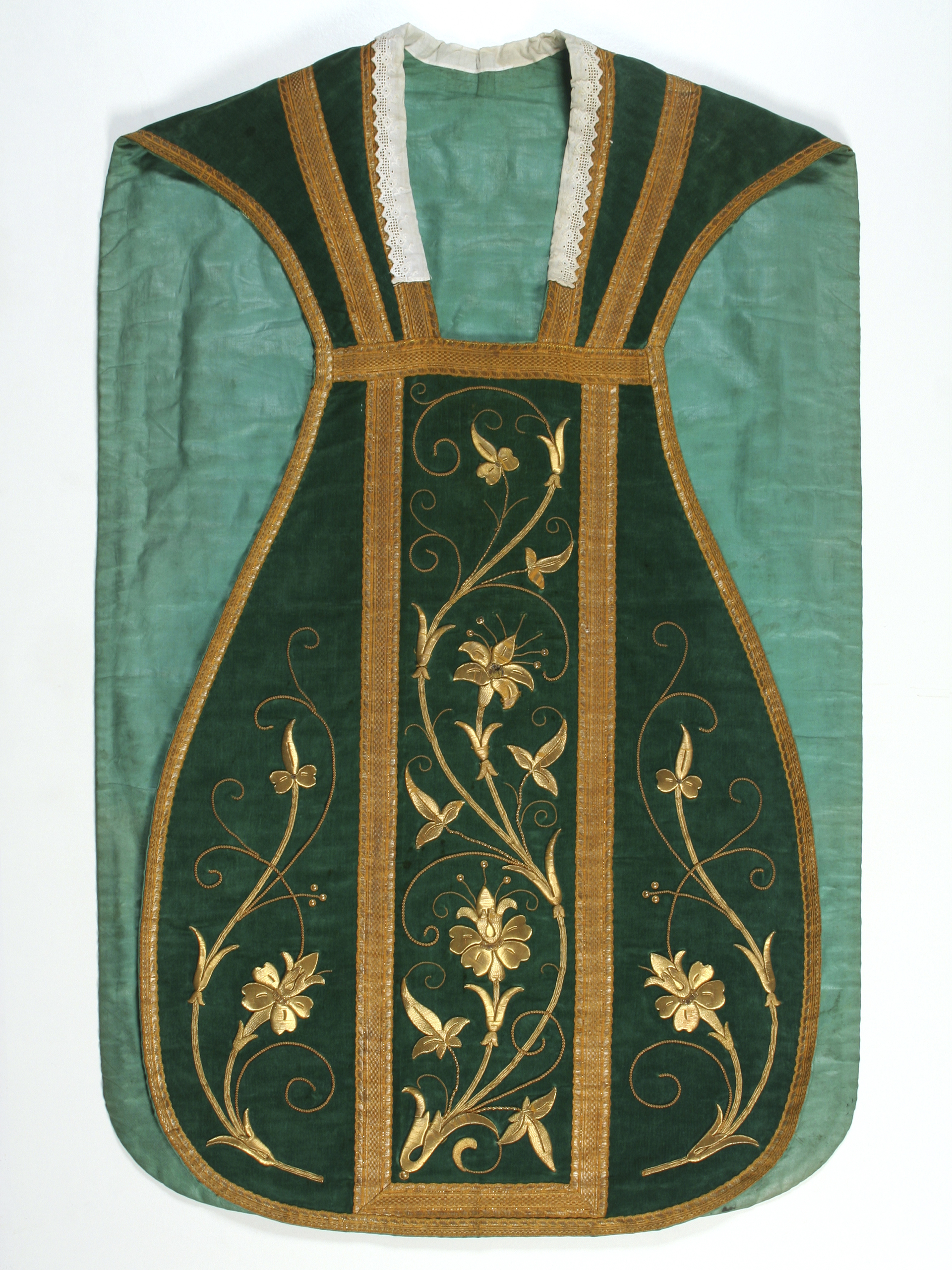 Green Chasuble, plush, embroidered flowers and cross on the back with metallic golden thread, golden trim on edges, and white lace on the collar.