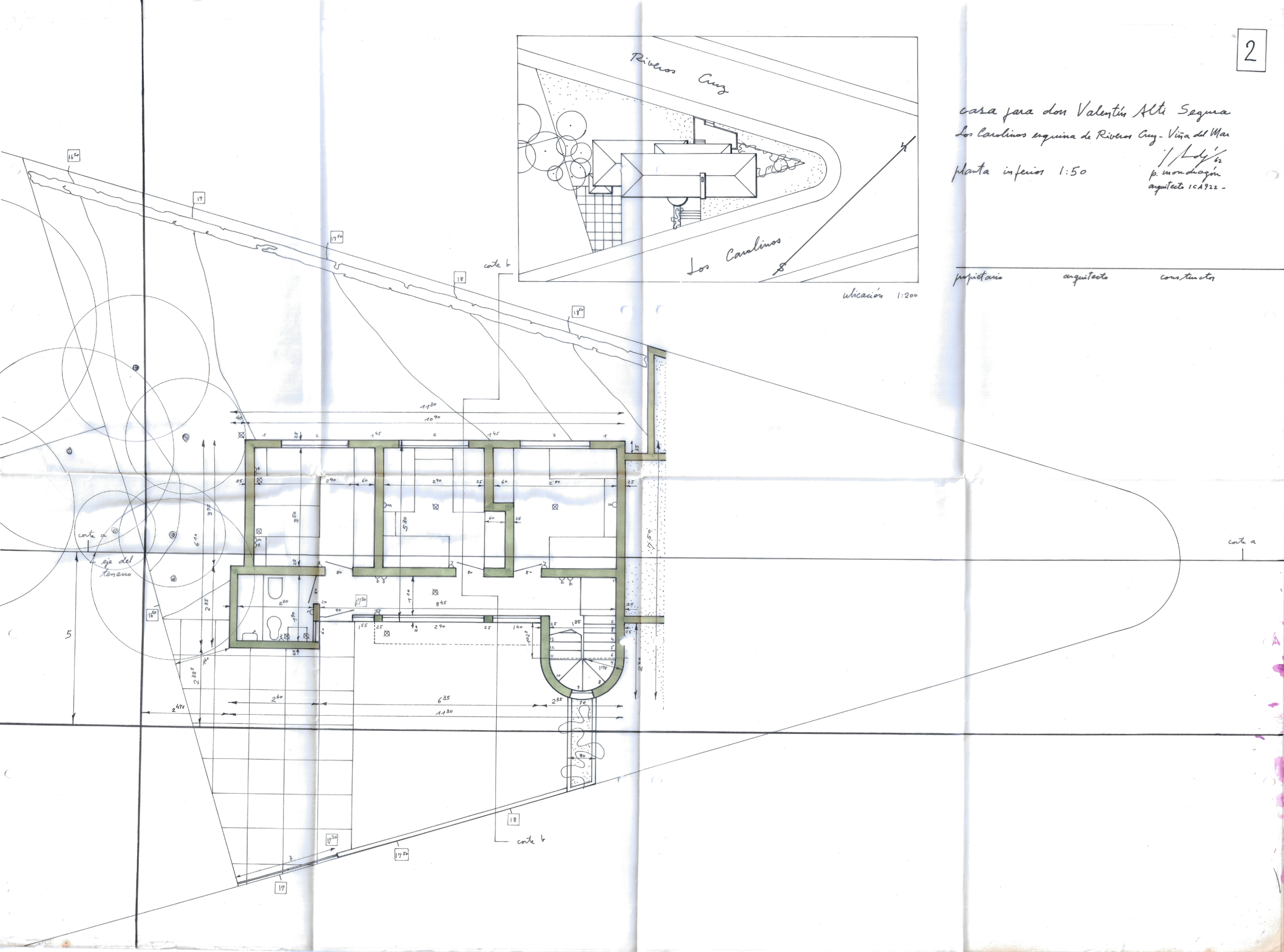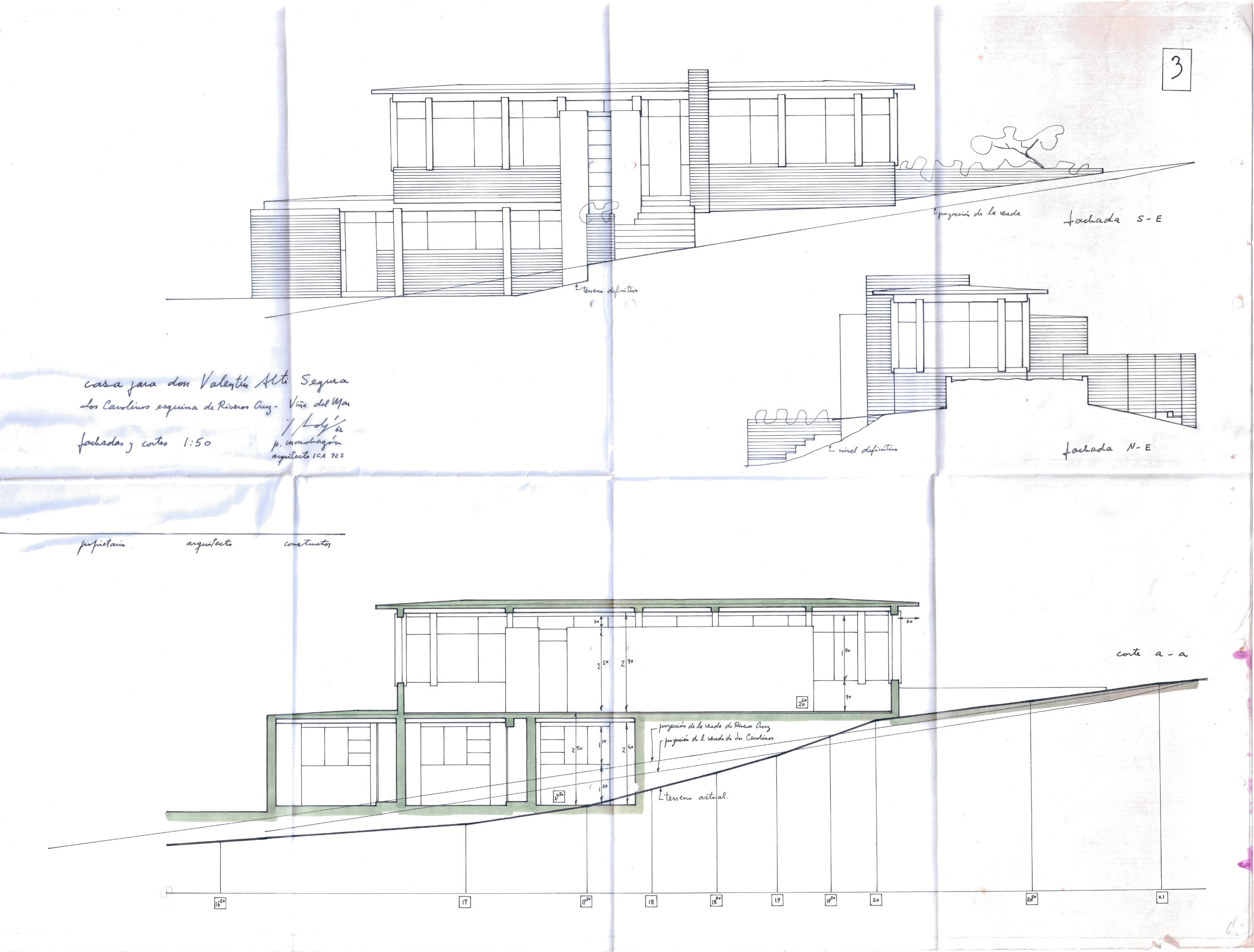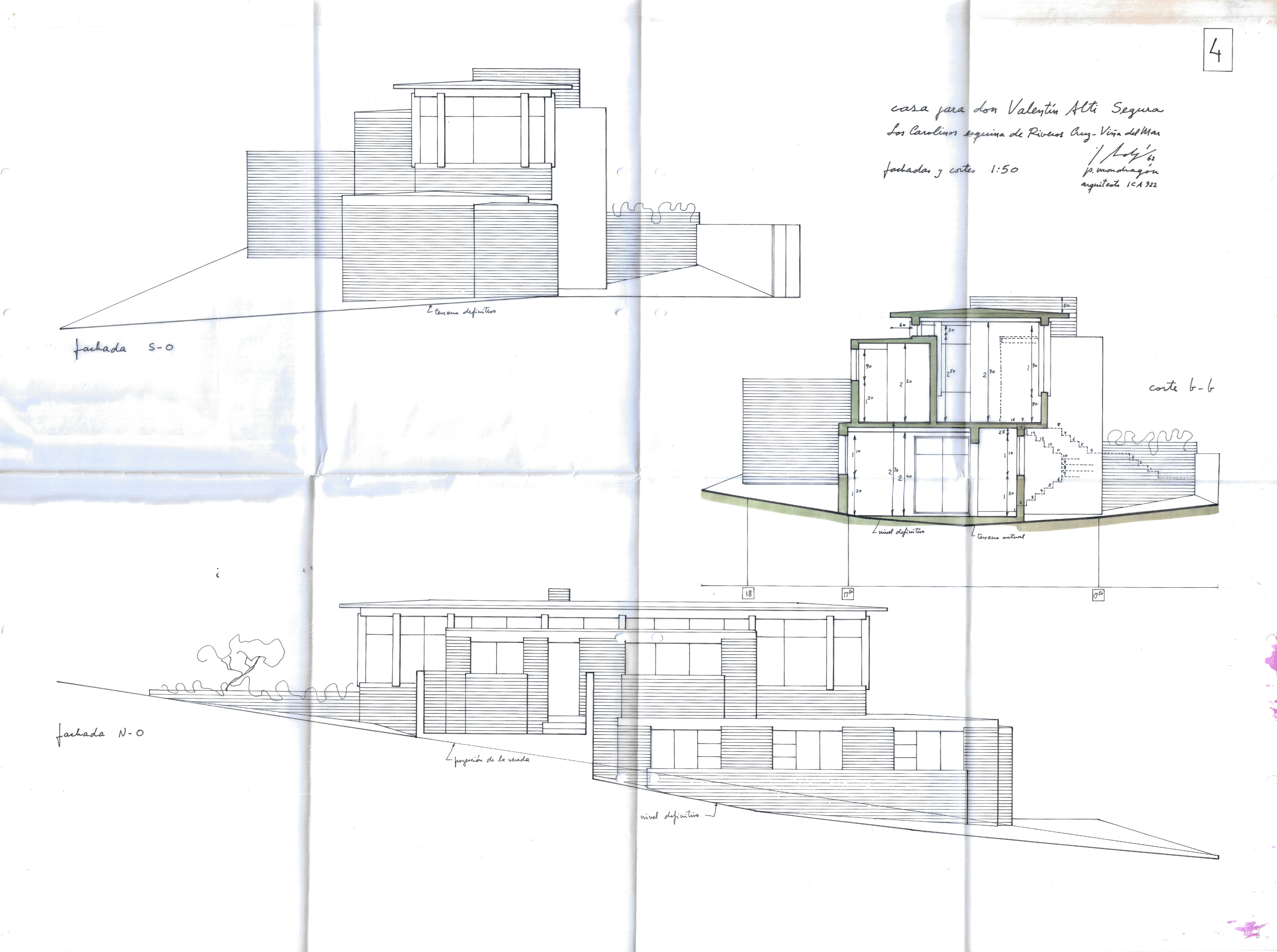 El proyecto Casa para Don Valentín Alti Segura, ubicado en Los Carolinos, esquina de Riveros Cruz, en la comuna de Viña del Mar, está compuesto por cuatro planos. El primero corresponde a la planta superior, presentada en escala 1:50 e incluye además su situación y ubicación general en escala 1:5000. El segundo plano muestra la planta inferior, acompañada de la situación y ubicación en escala 1:200 y la planta en escala 1:50. El tercer plano incorpora una planta adicional también trabajada en escala 1:50, mientras que el cuarto plano reúne la fachada suroeste y noreste, junto con un corte arquitectónico, todo en escala 1:50.