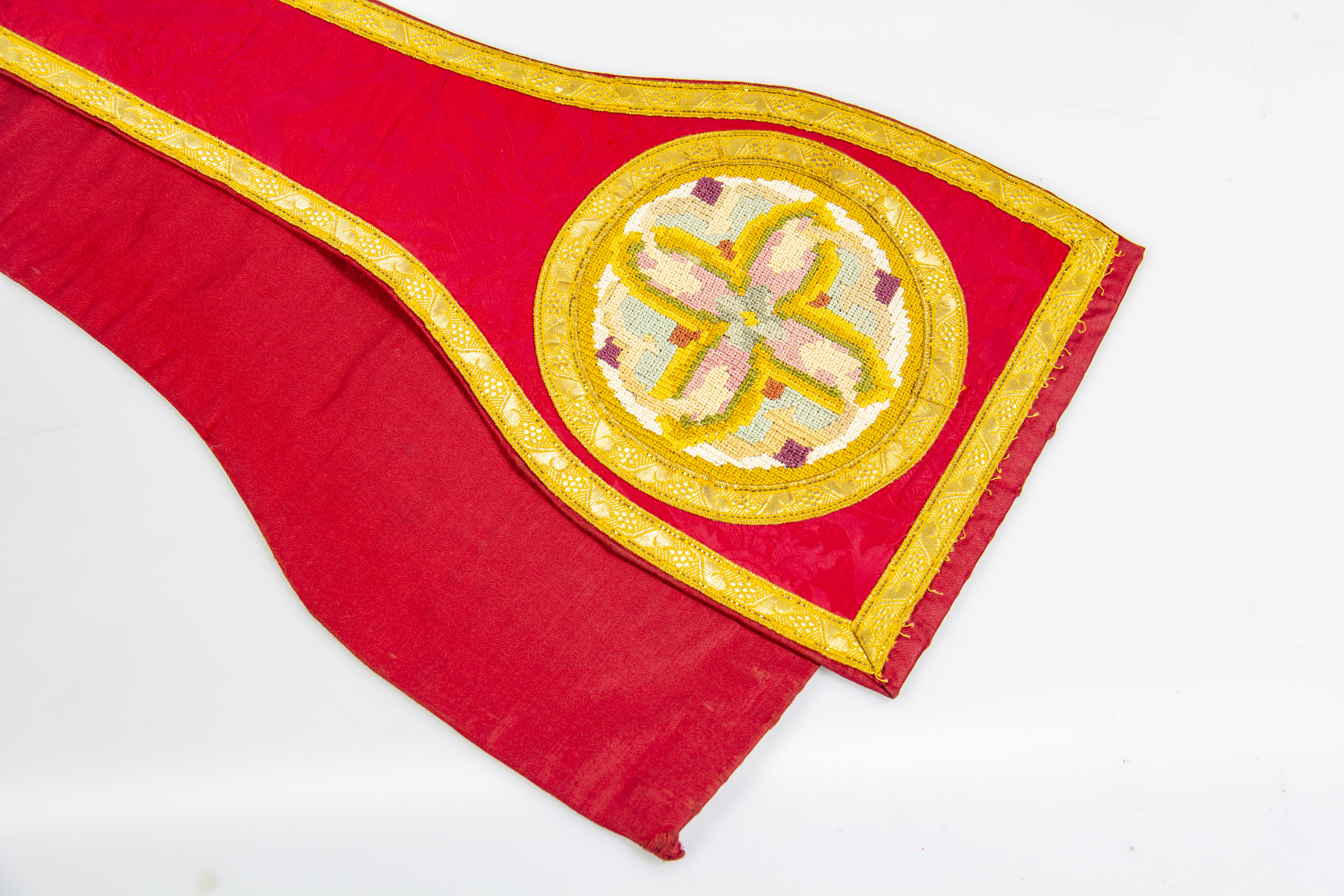 dc.description | dc.description | Red Damask with embroidered cross-stitch application at the ends, golden ribbon around the edges. White lace on the collar. | |