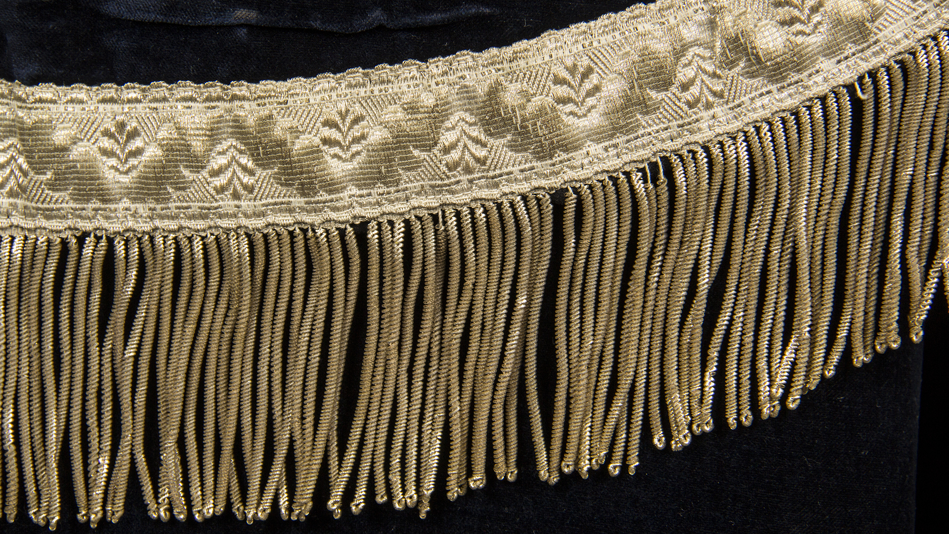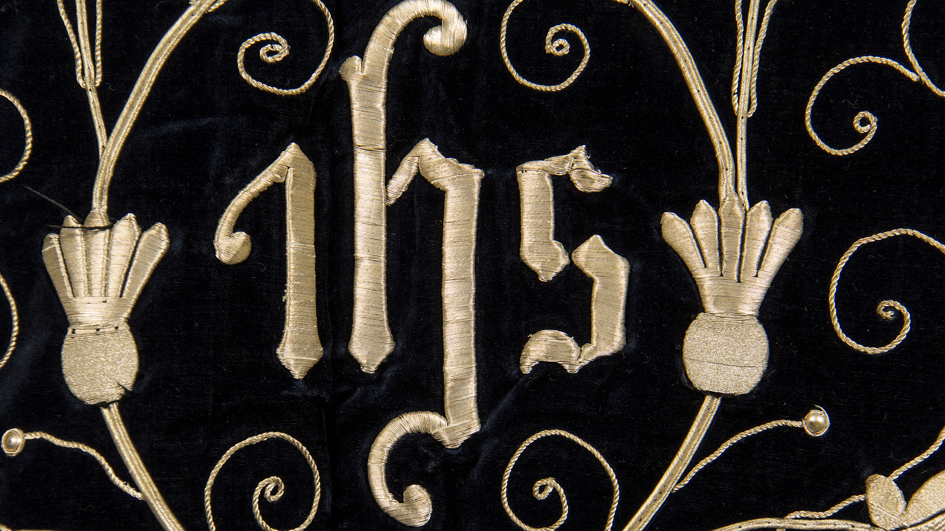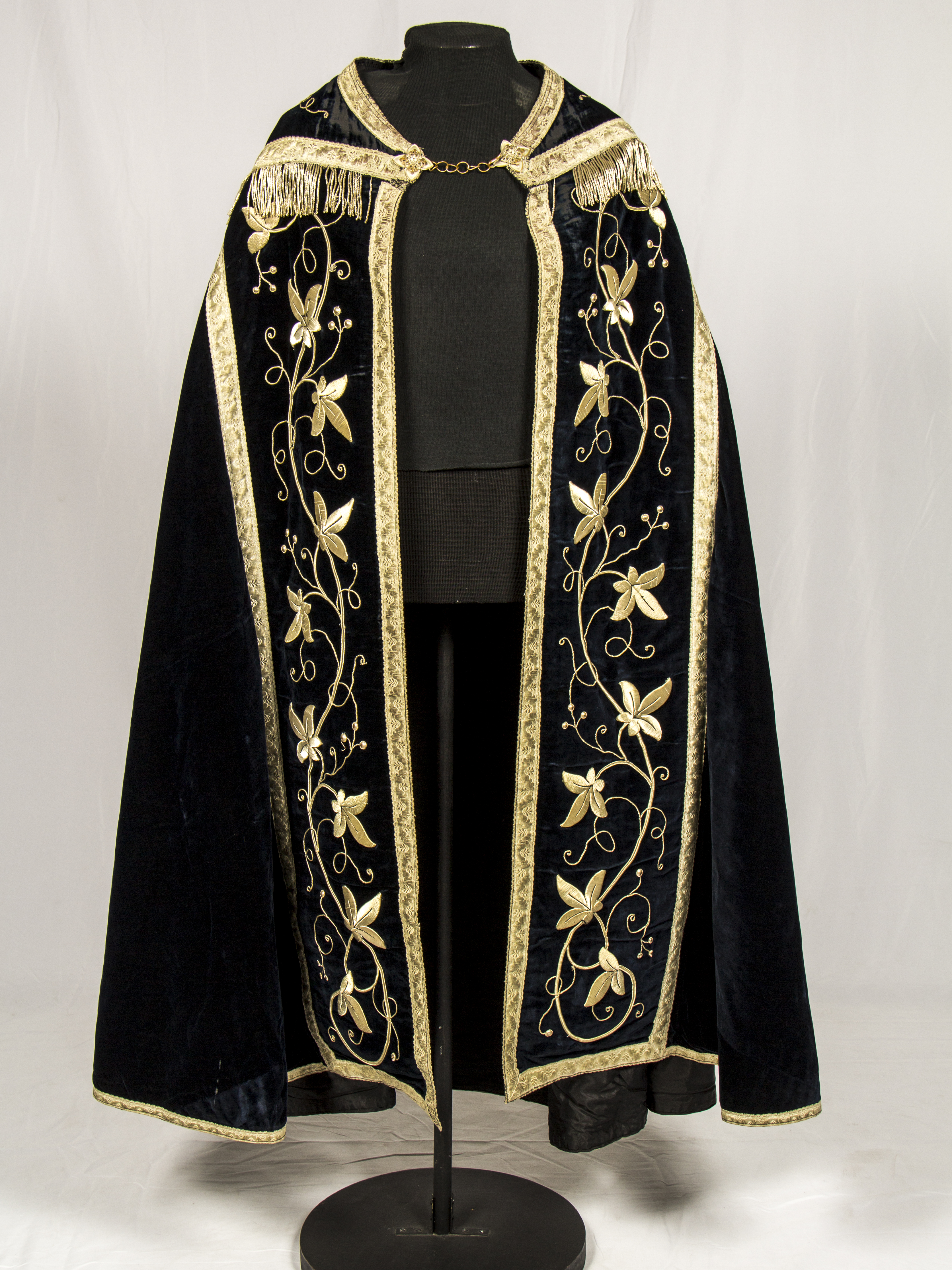 Black velvet with silver floral embroideries framed with metallic ribbons, on the back a embroidered christogram in the upper part and fringes on the edges.