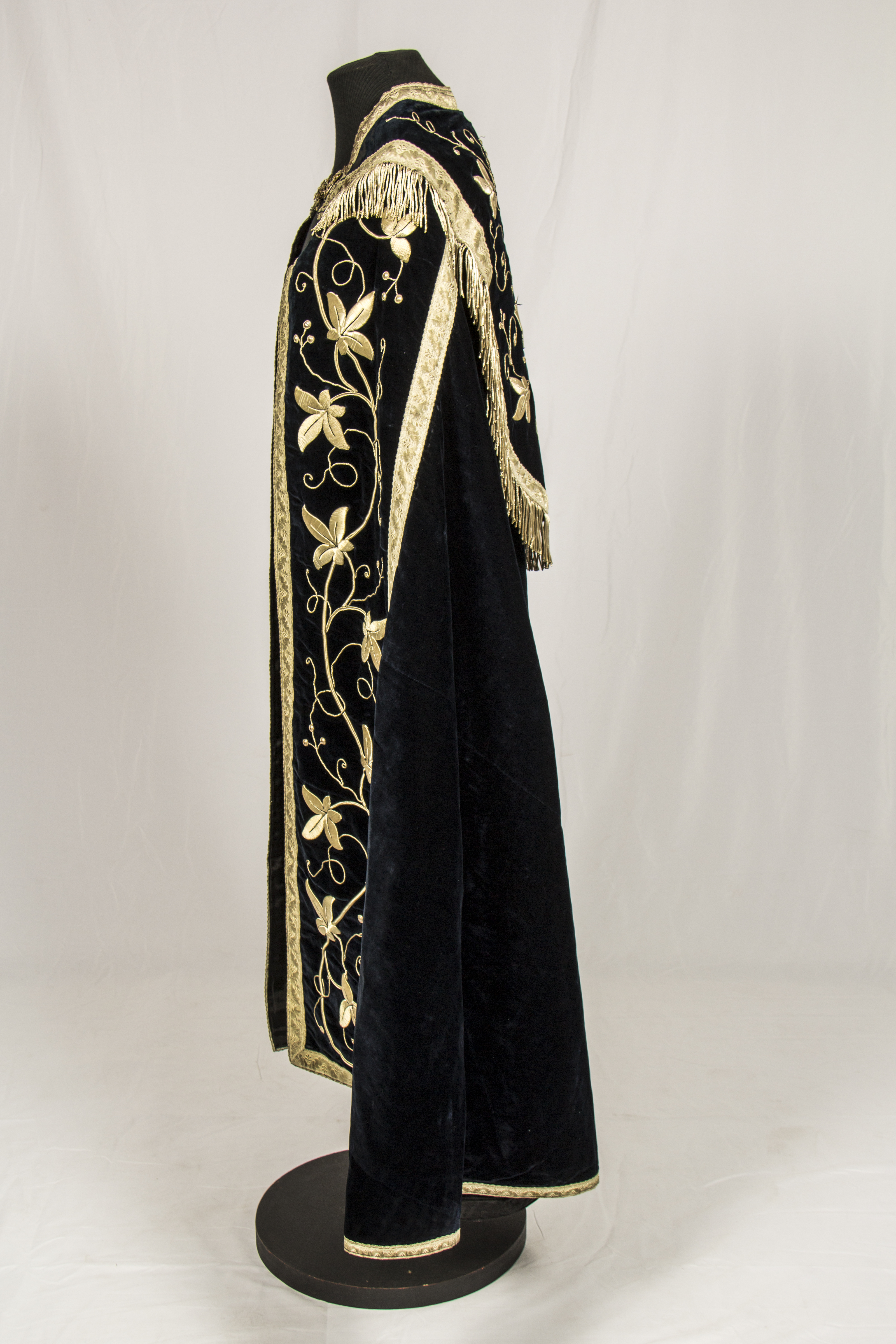 Terciopelo negro con bordados florales plateados enmarcadas con cintas metálicas, en espalda cristograma bordado en parte superior flequillos en contornos.