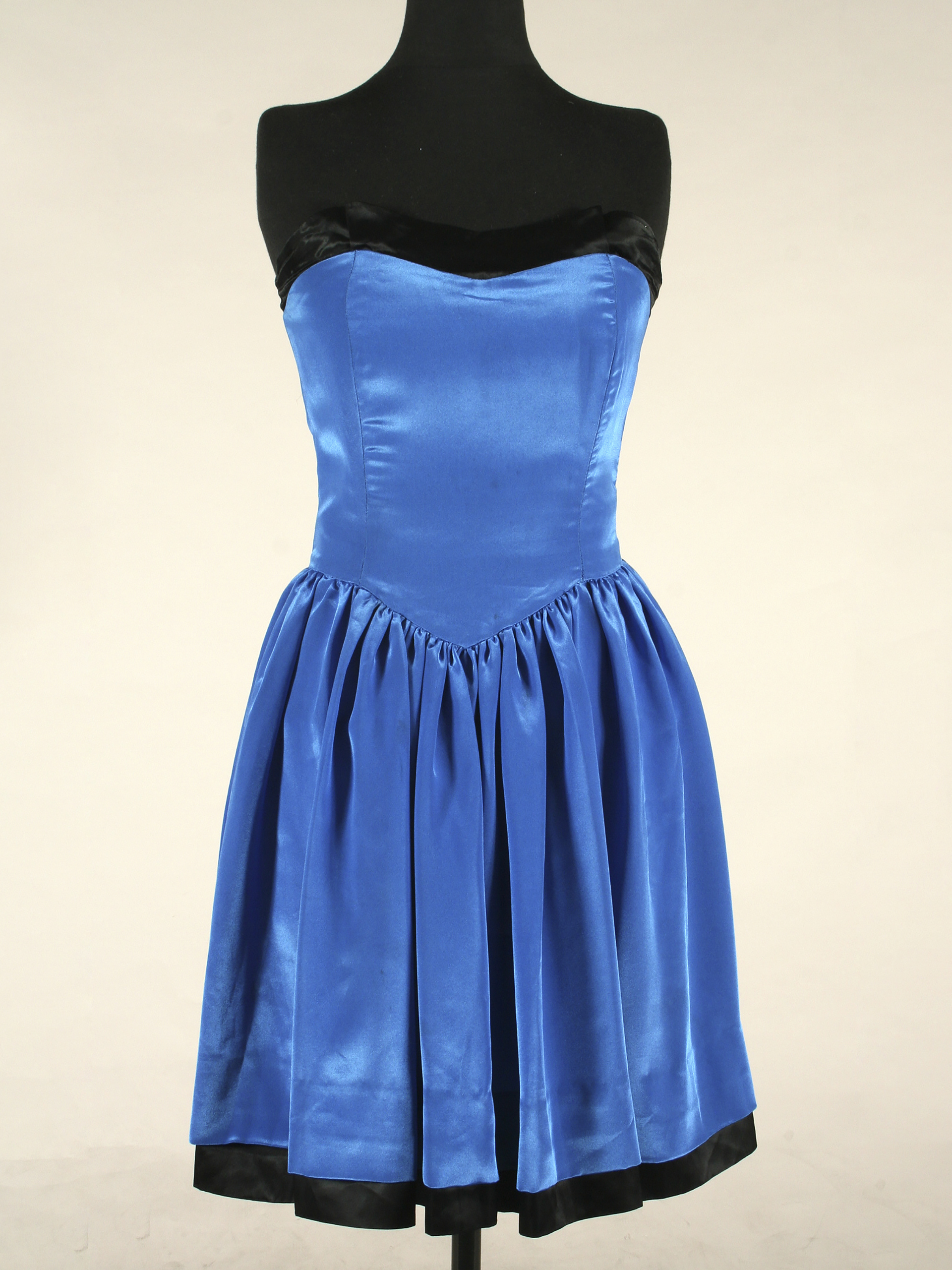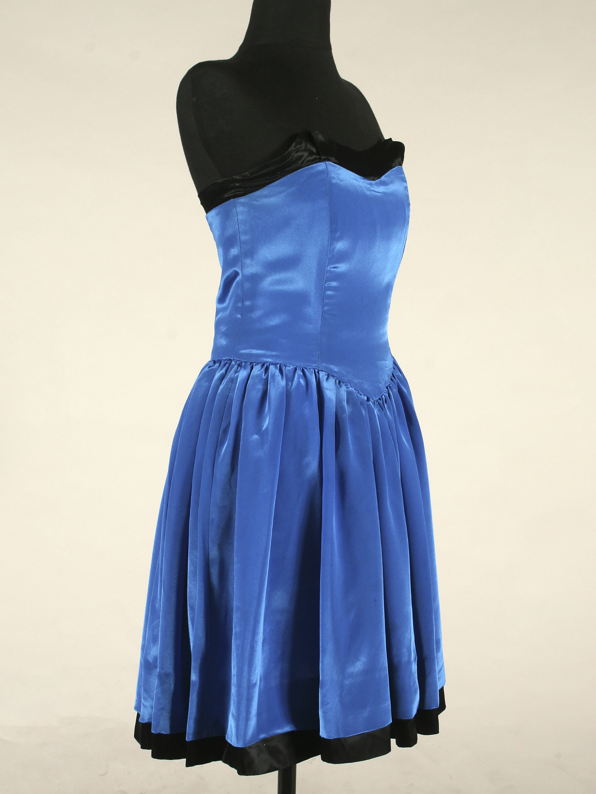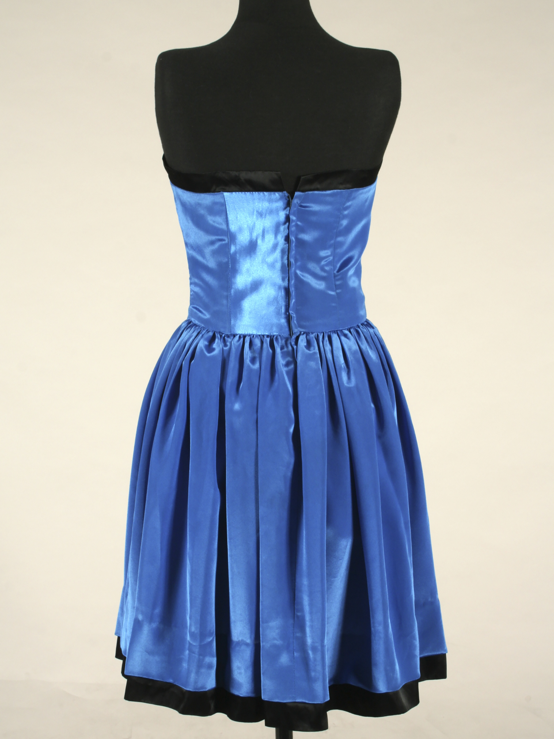Vestido sin hombros, de seda azul, con bordes negro en escote y falda, cierre en espalda, ajustado en cintura corte en punta y falda con pliegues. Hecho a medida.