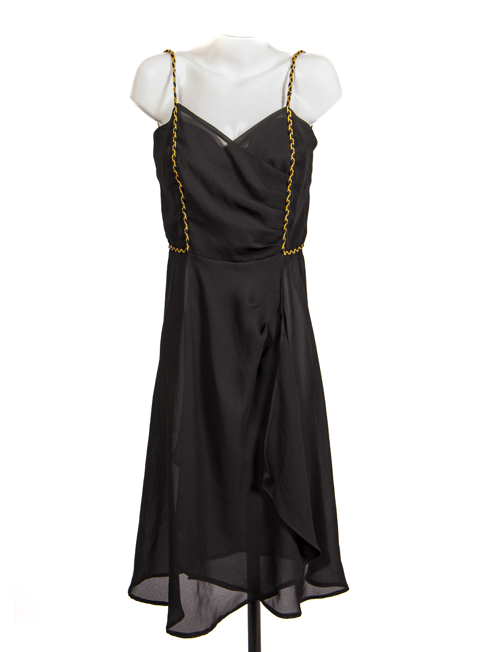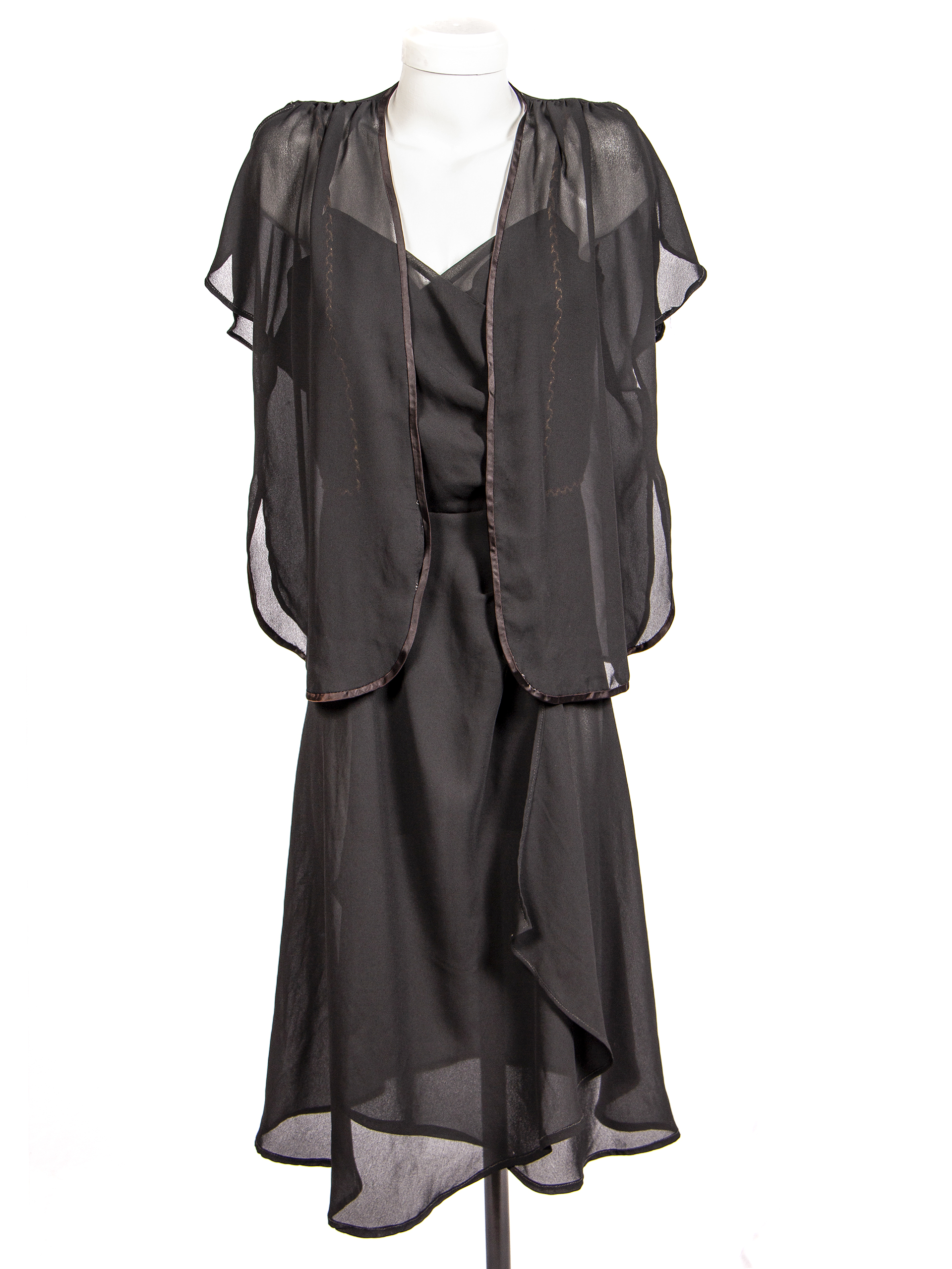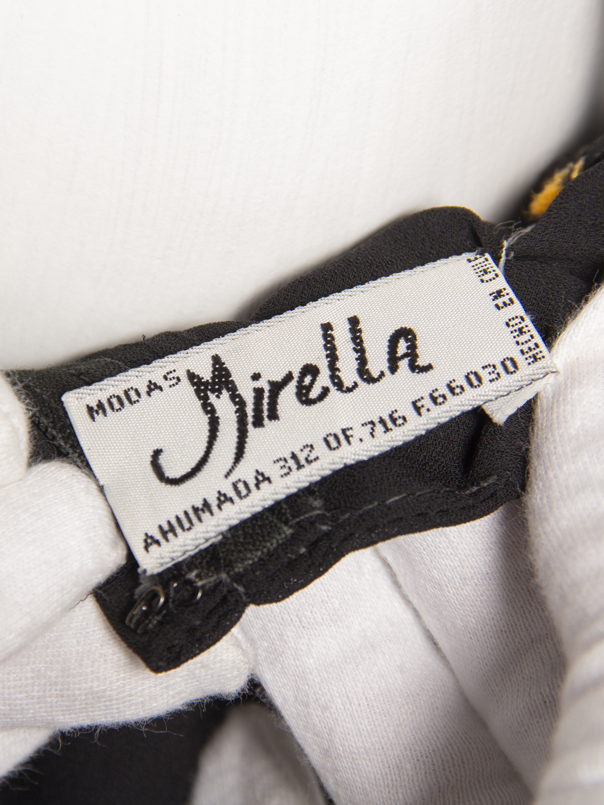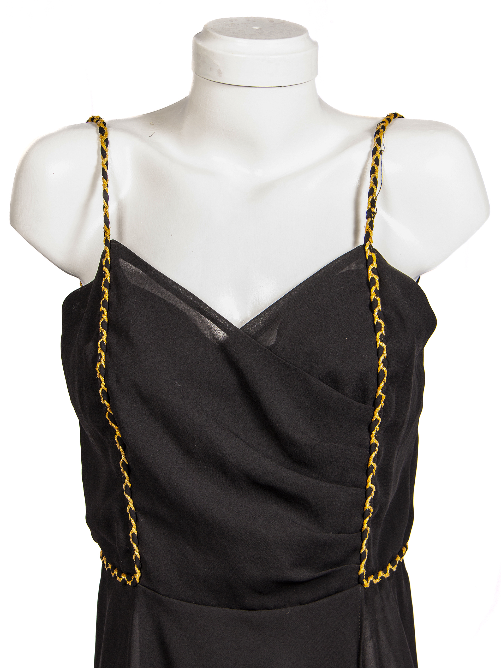 Vestido de fiesta de gasa negra, con tirantes dorados y chaqueta marca 'Modas Mirella' ubicada en Ahumada 312 of. 716, Santiago, fabricación chilena. Usado por Edda María Cannesa Ewoldt.