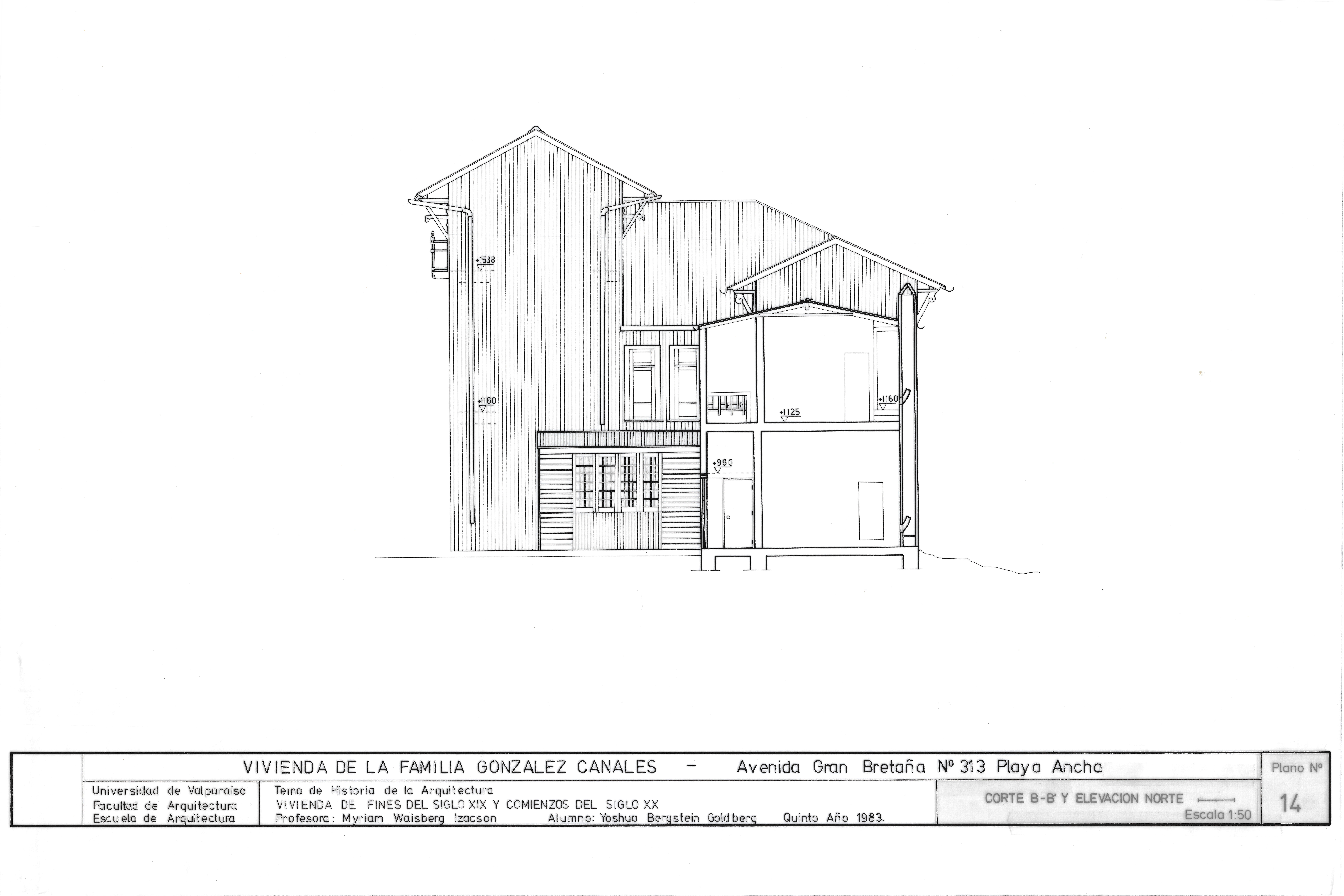 Plano no.18: elevación cuadra calle Whiteside, escala 1:100. Plano no.7: planta actual primer piso, escala 1:50. Plano no.14: corte B-B y elevación norte, escala 1:50. Plano no.11: elevación sur, escala 1:50. Plano no.11 elevación sur, escala 1:50.