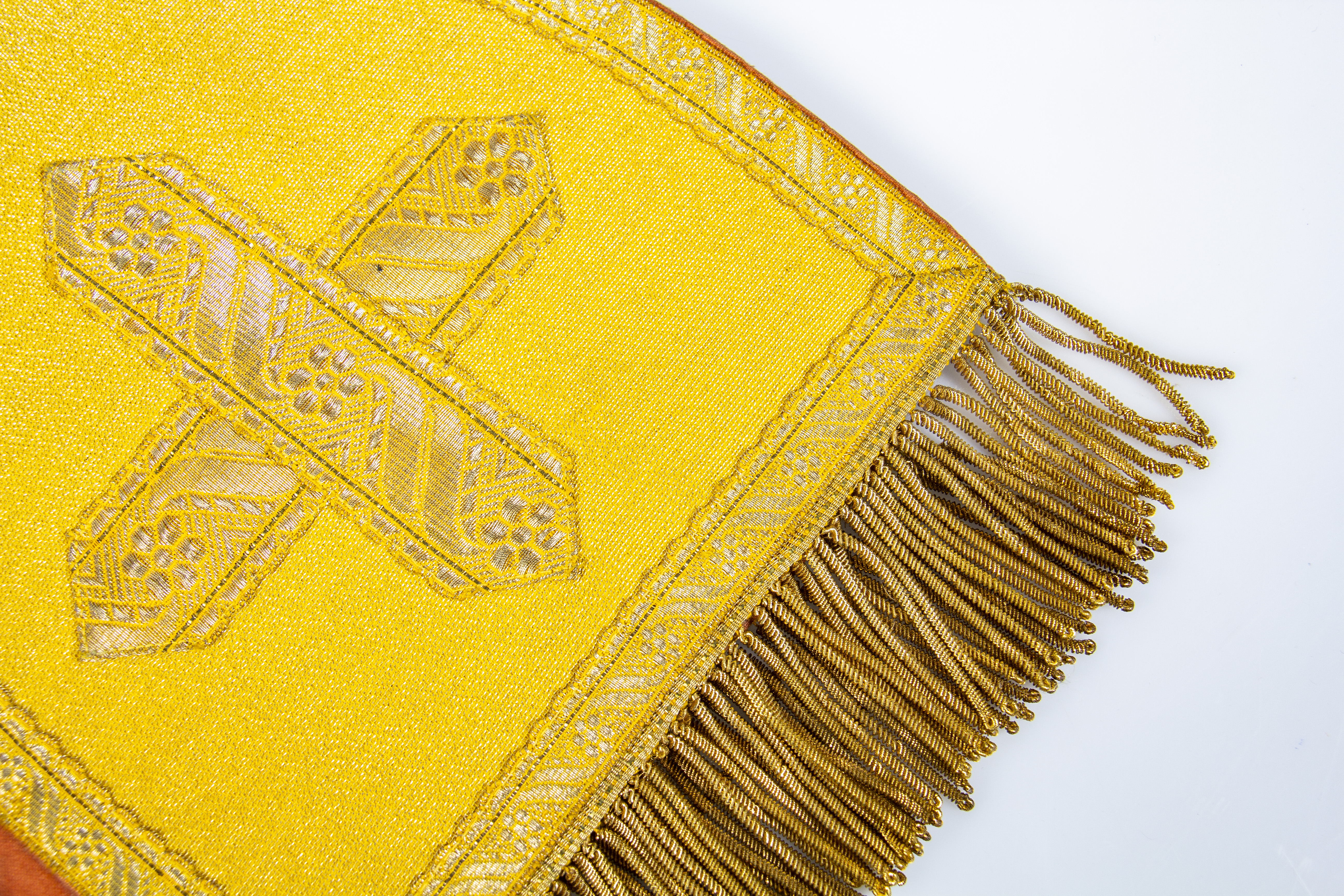 Lamé dorado con cinta dorada en contornos y formando cruz en extremos, flequillos dorados.