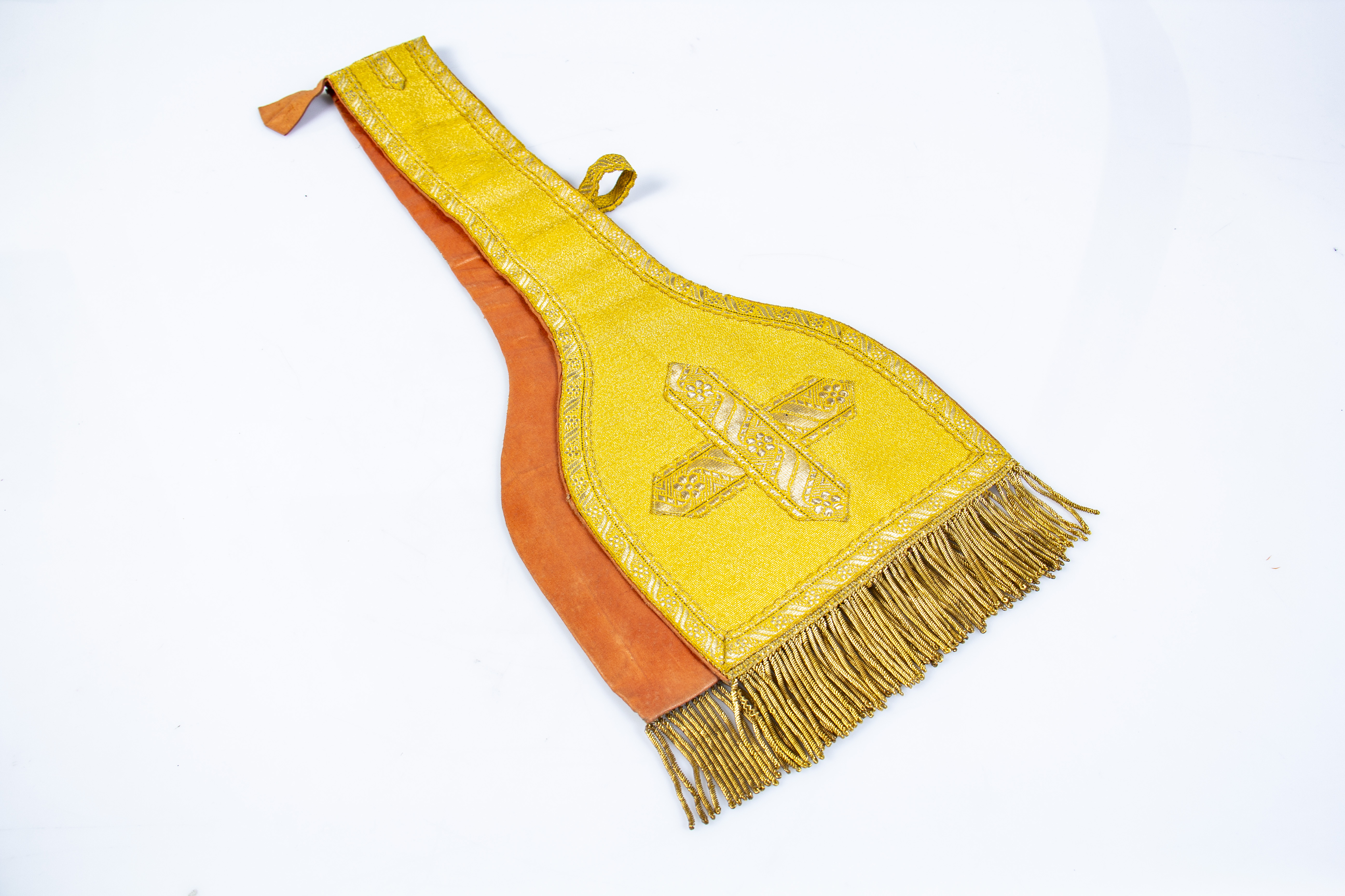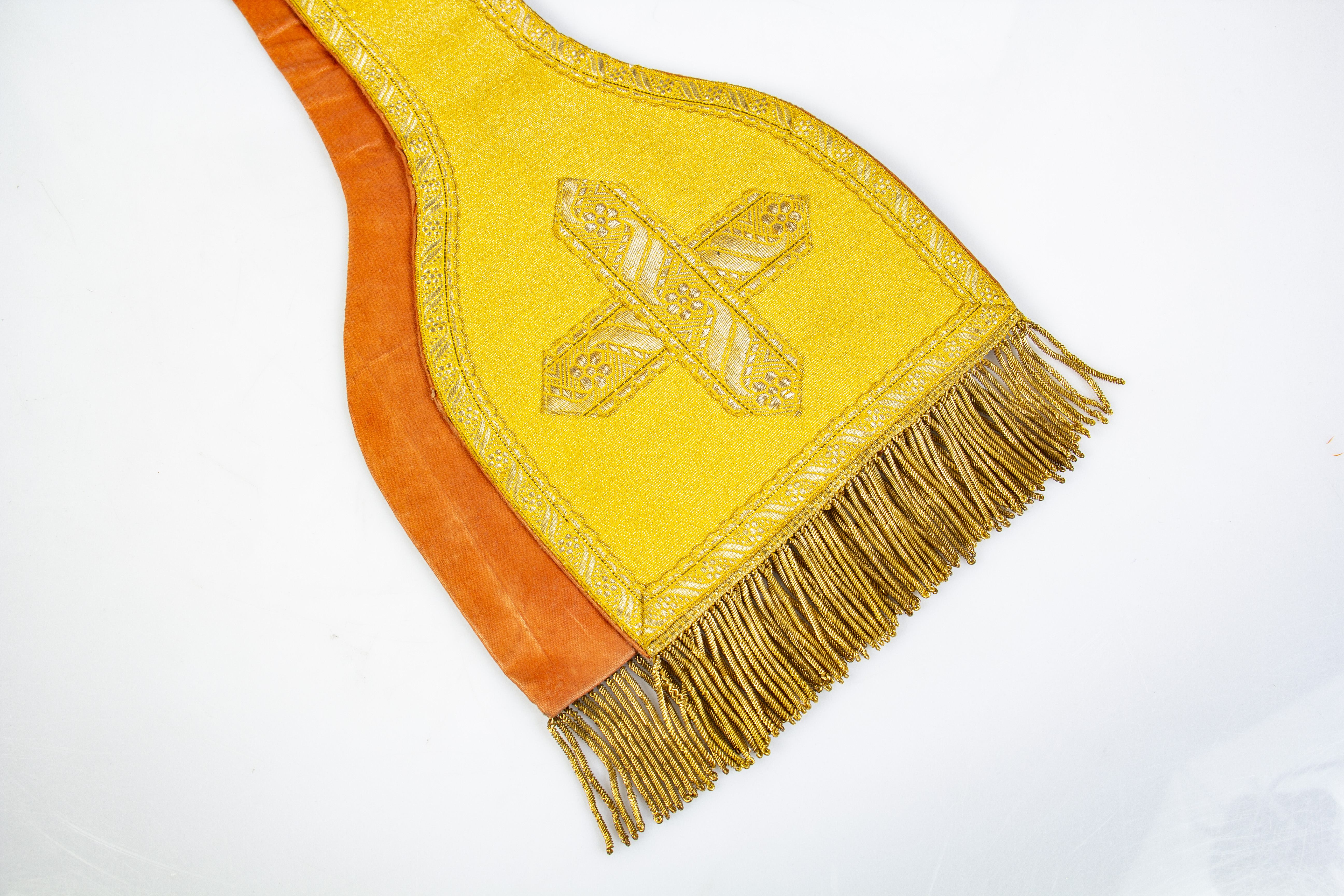 Golden Lamé with golden ribbon trim around the edges, forming a cross at the ends, and golden fringes.
