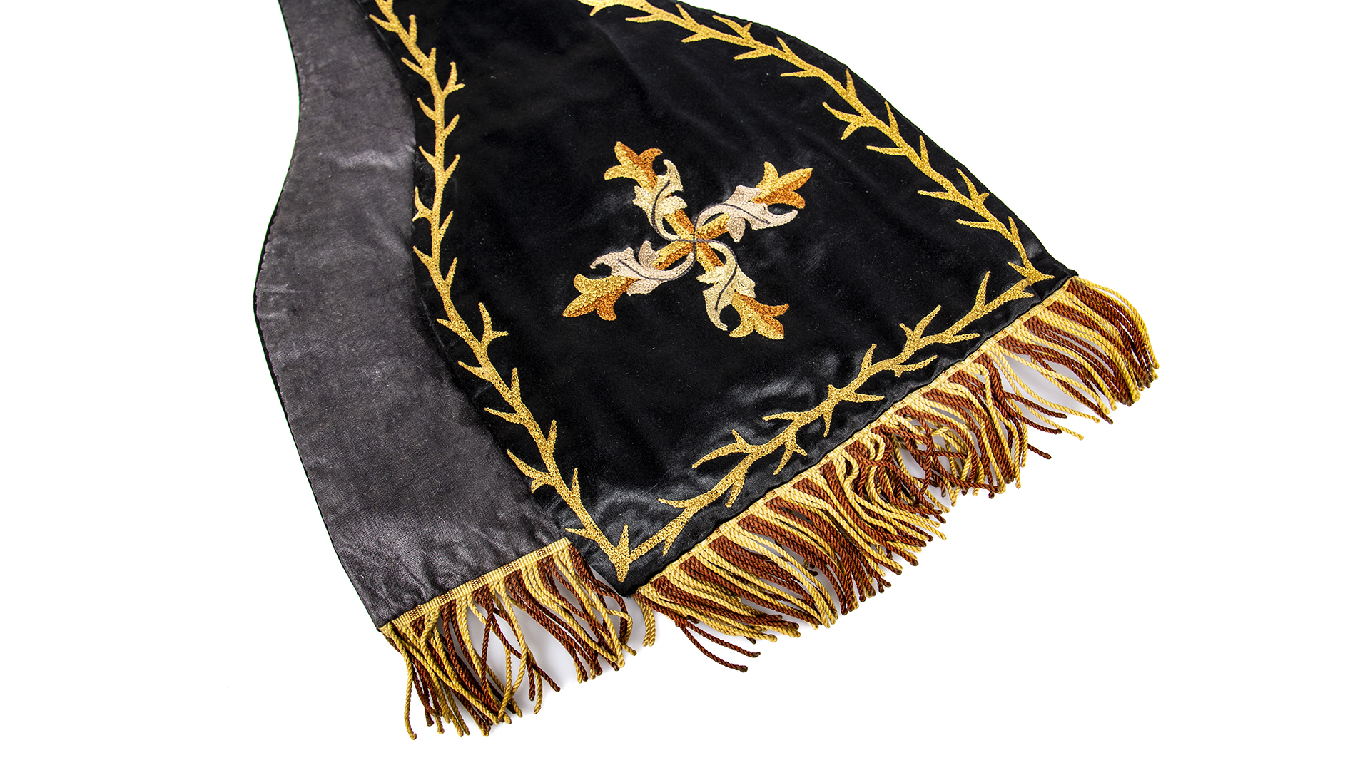 Black satin with brown embroidered Alcántara cross at the ends and thorn orlas on the edges. Brown and red fringes.