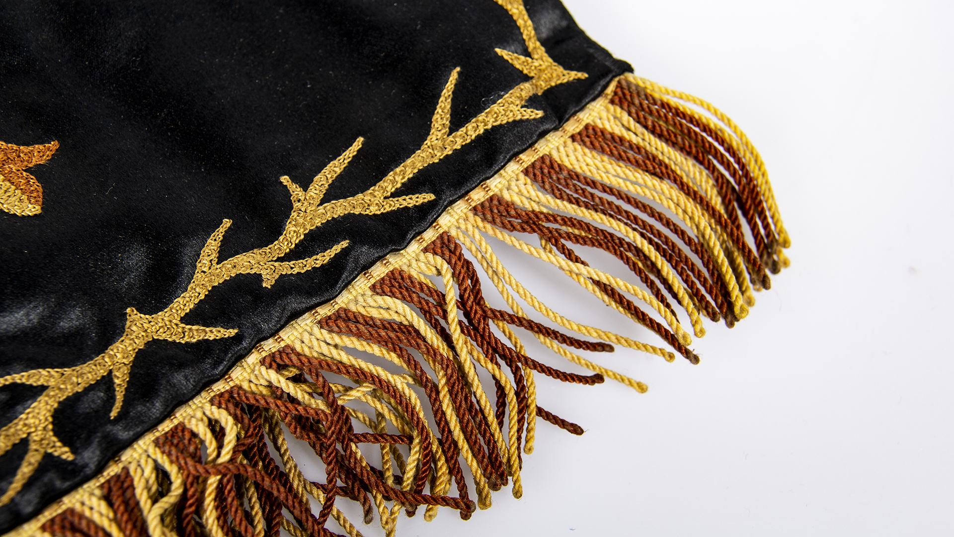 dc.description | dc.description | Black satin with brown embroidered Alcántara cross at the ends and thorn orlas on the edges. Brown and red fringes. | |