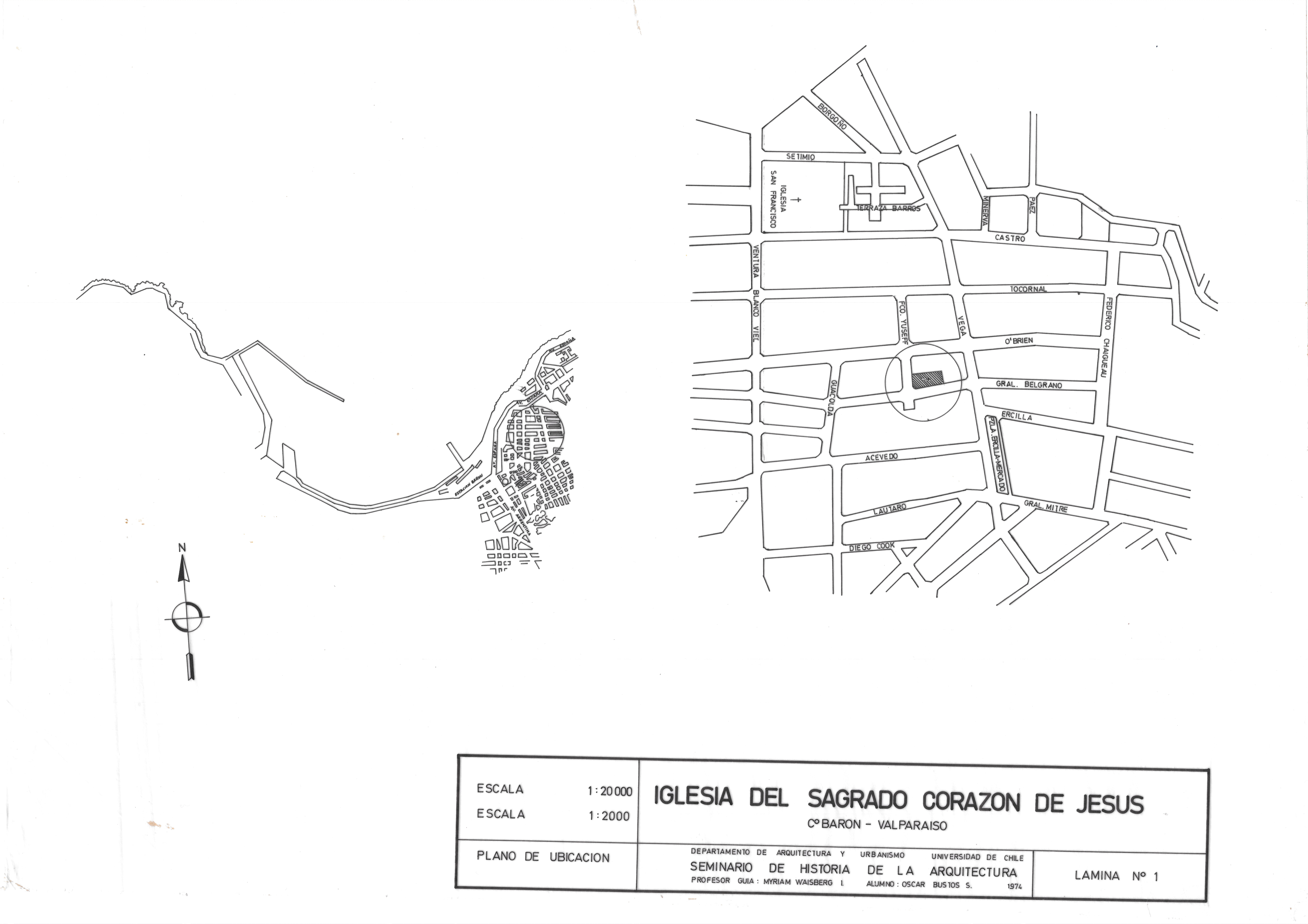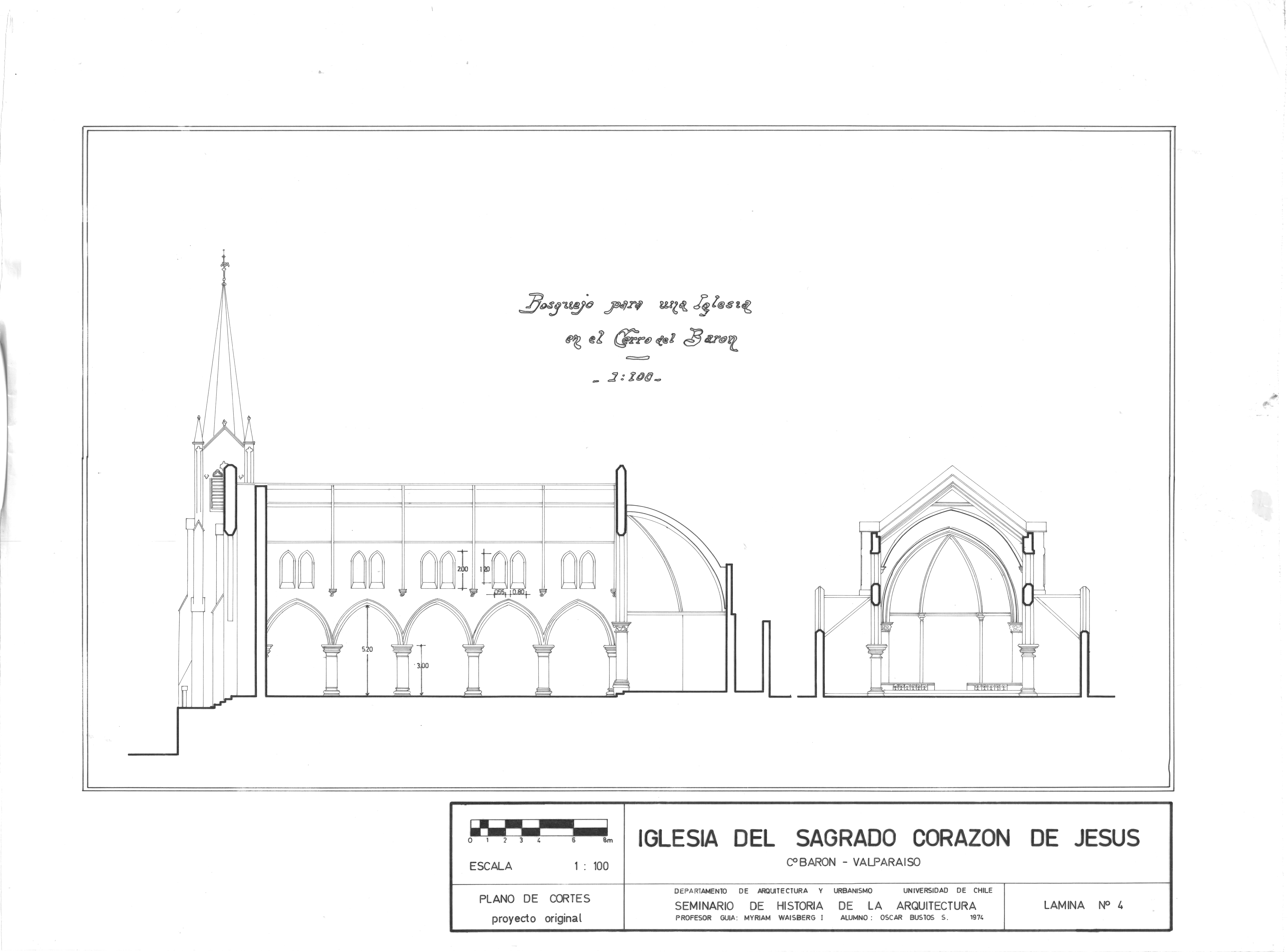 Lámina n° 1: plano de ubicación, escala 1:20.000/ escala 1:2000. Lámina n° 3: iglesia proyectada en el cerro Barón, planta, escala 1:100. Lámina 4: bosquejo para una iglesia en el cerro Barón, cortes, escala 1:100. Lámina n°5: fachadas actuales/detalles, escala 1:100 / escala 1:10.