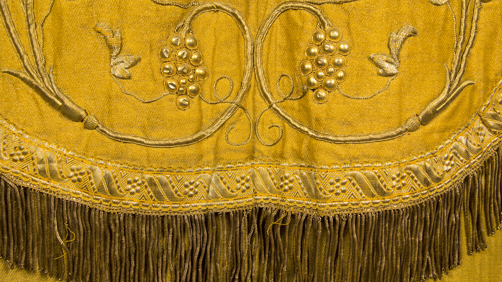 dc.description | dc.description | Golden lamé with stripes on the front and back with raised golden embroideries, the back application has golden fringes in the seam. Stains on the back hem. | |