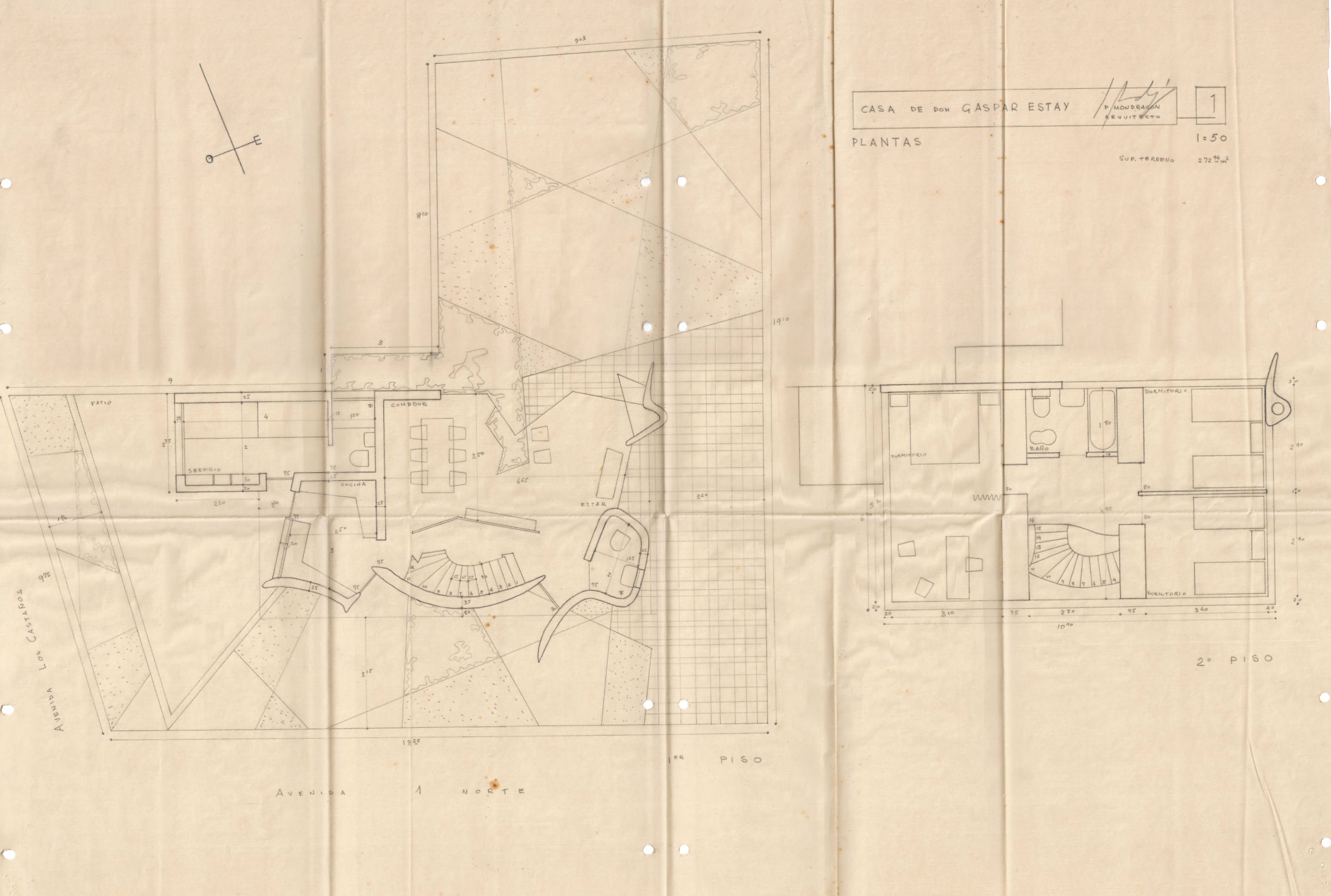 El proyecto de la Casa de Don Gaspar Estay se ubica en Av. 1 Norte con Av. Los Castaños, en la ciudad de Viña del Mar. Este incluye un plano de fachadas norte, sur, este y oeste en escala 1:50, así como el plano de plantas del primer y segundo nivel en la misma escala, correspondiente a un terreno de 272,94 m². Además, se incorpora el anteproyecto en escala 1:100, que presenta la distribución general de ambos pisos y la fachada principal. Finalmente, se añade un croquis de la fachada de la vivienda para complementar la representación visual del proyecto.