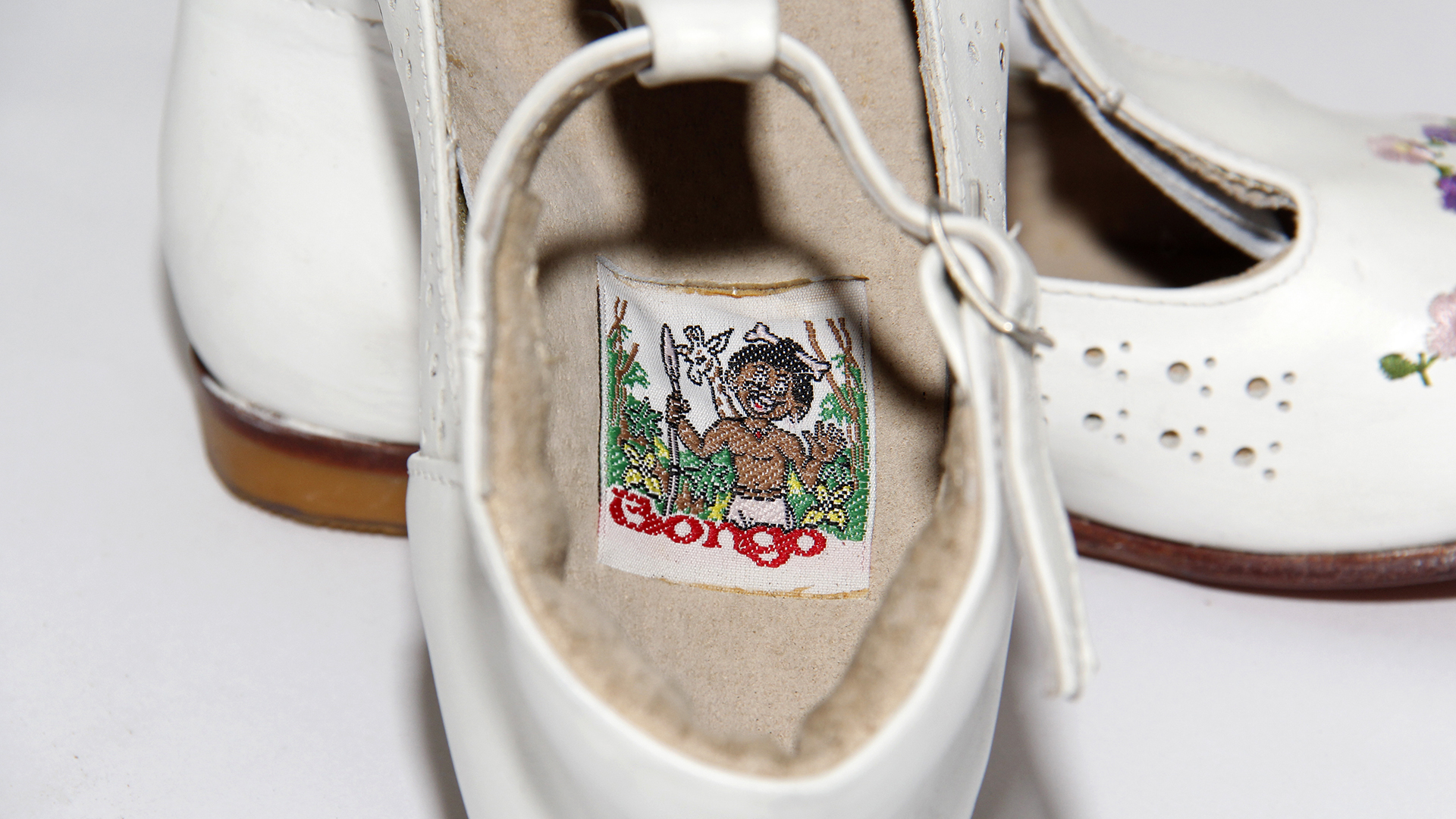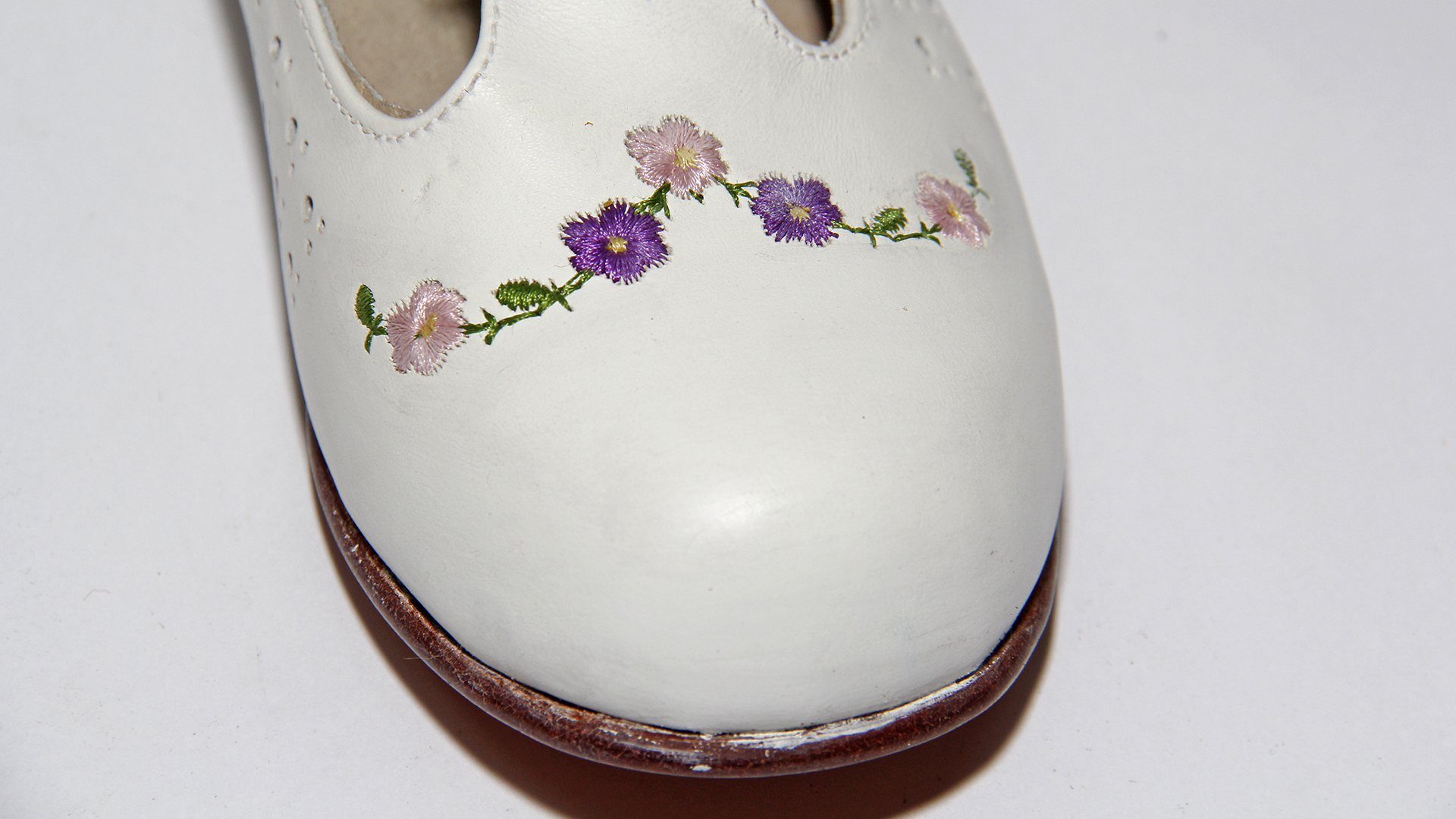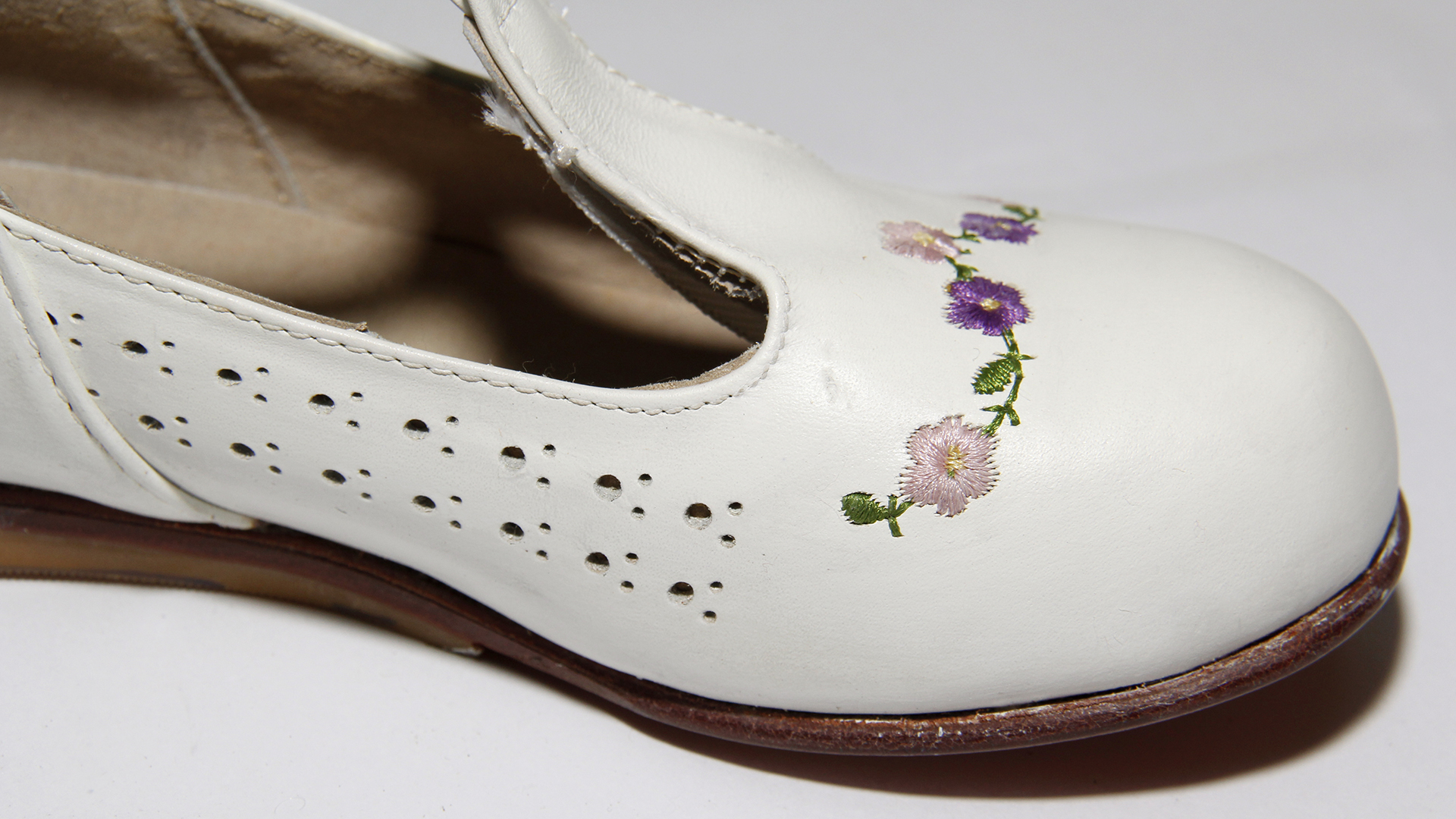 White badana leather shoes, with perforated instep, strap with metallic buckle, lilac embroidered flowers at the tip, and cutouts on the sides, 'Bongo' brand. Made in Chile. Ramirez Rodrígez Fernando and another.