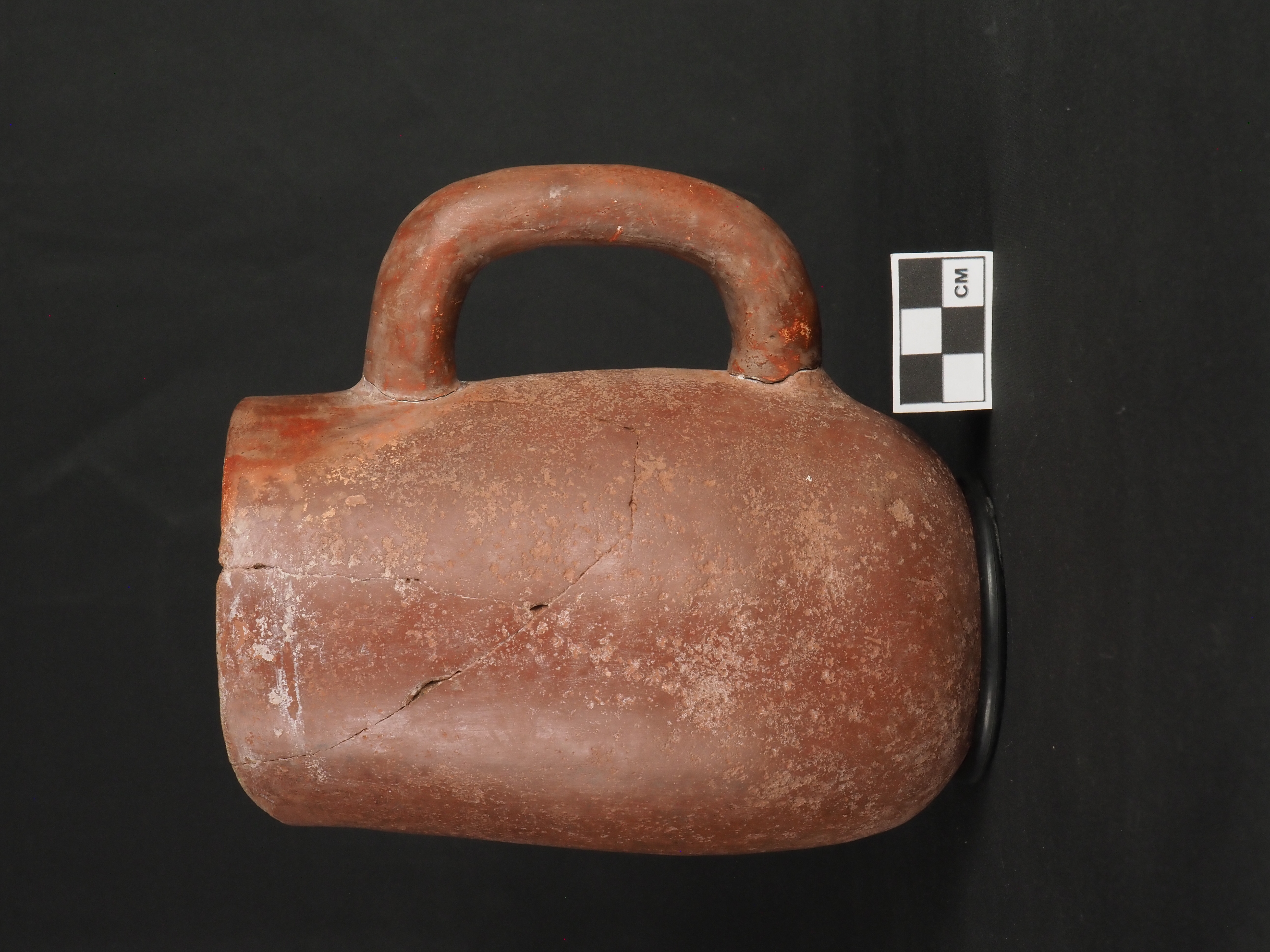 Objeto rojo engobado sin decoración adicional, posee reintegración cromática de color rojo en algunas secciones en las que se evidencia reintegración volumétrica anterior. Técnica: Arcilla modelada, alisada, pulida, bruñida. Cerámica engobada. Morfología: Objeto simétrico de estructura no restringida, perfil simple, cuerpo cilíndrico, borde recto, labio redondeado y base curva. Presenta un asa vertical emplazada en el cuerpo. La unidad estructural del objeto se presenta en fragmentos unidos con pequeñas secciones faltantes sobre las que se evidencia, en algunos casos, reintegración volumétrica.