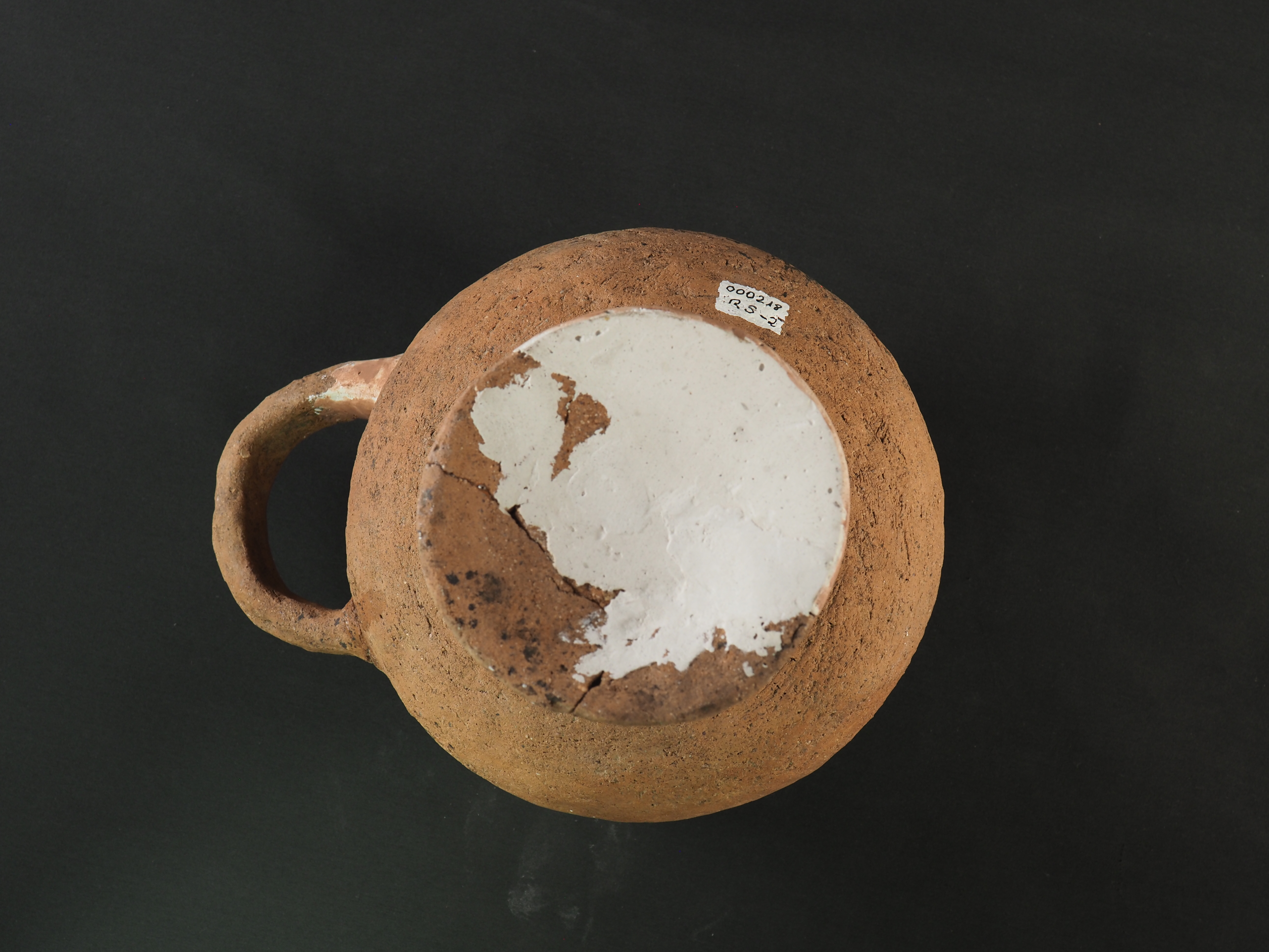 Objeto de uso doméstico y/o ritual, posee la coloración natural de la pasta, con notorio deterioro por uso y contexto arqueológico de entierro. Además, a modo decorativo, presenta dos protúberos con una incisión esférica central cada uno. Técnica: Arcilla modelada, alisada y pulida. Morfología: Objeto simétrico de estructura restringida, perfil complejo, cuerpo esférico, borde evertido, labio redondeado y base curva con pedestal de la misma materialidad. Presenta un asa de arco de correa horizontal y dos protúberos laterales emplazados en el cuerpo. La unidad estructural del objeto se presenta en fragmentos unidos y secciones faltantes en el cuerpo, el borde y la base sobre las que se evidencia reintegración volumétrica y cromática.