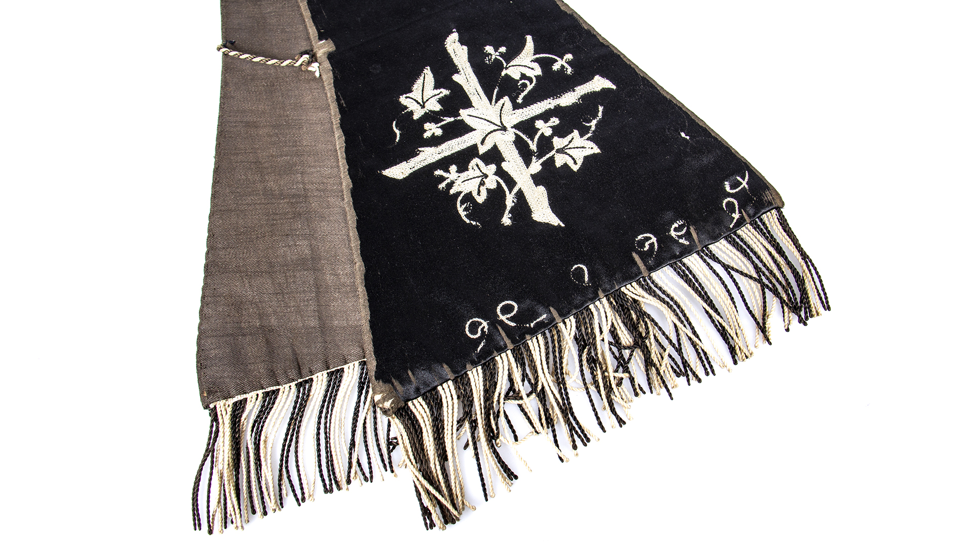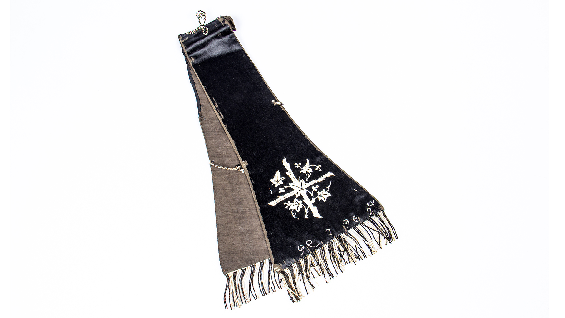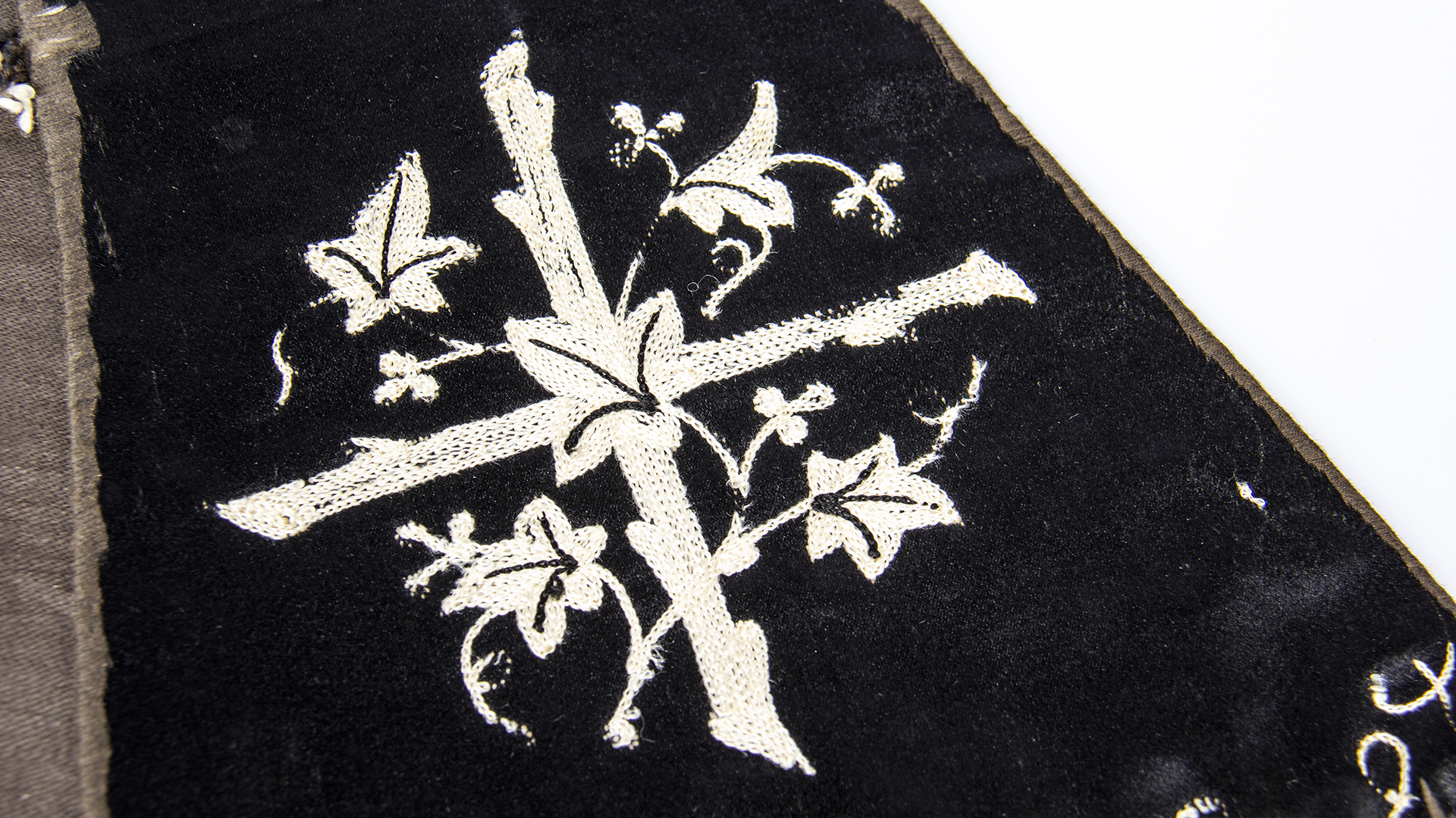 Black satin flared shape, with embroidered cross with flowers at the ends and orlas on the edges. Loss of border embroidery.
