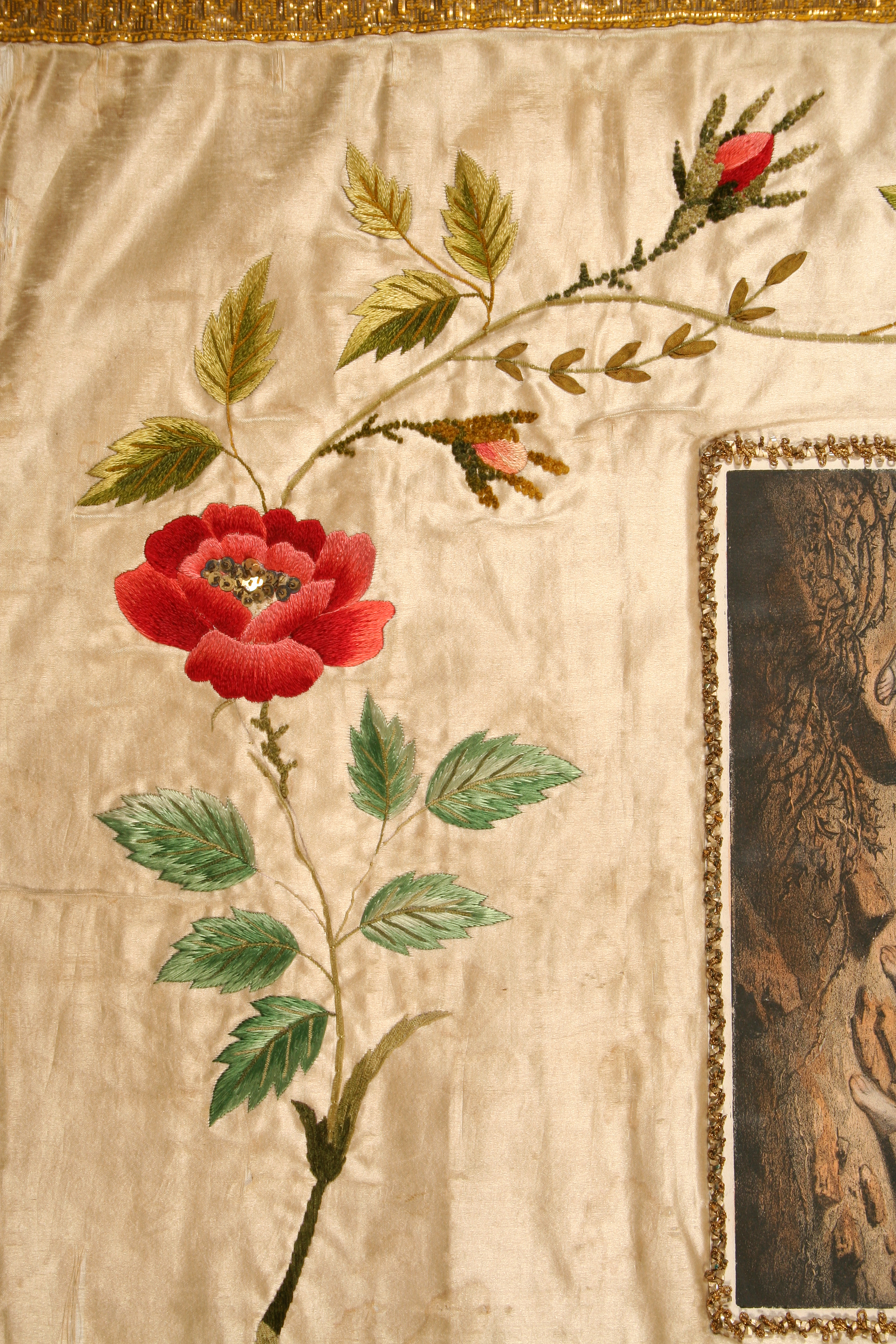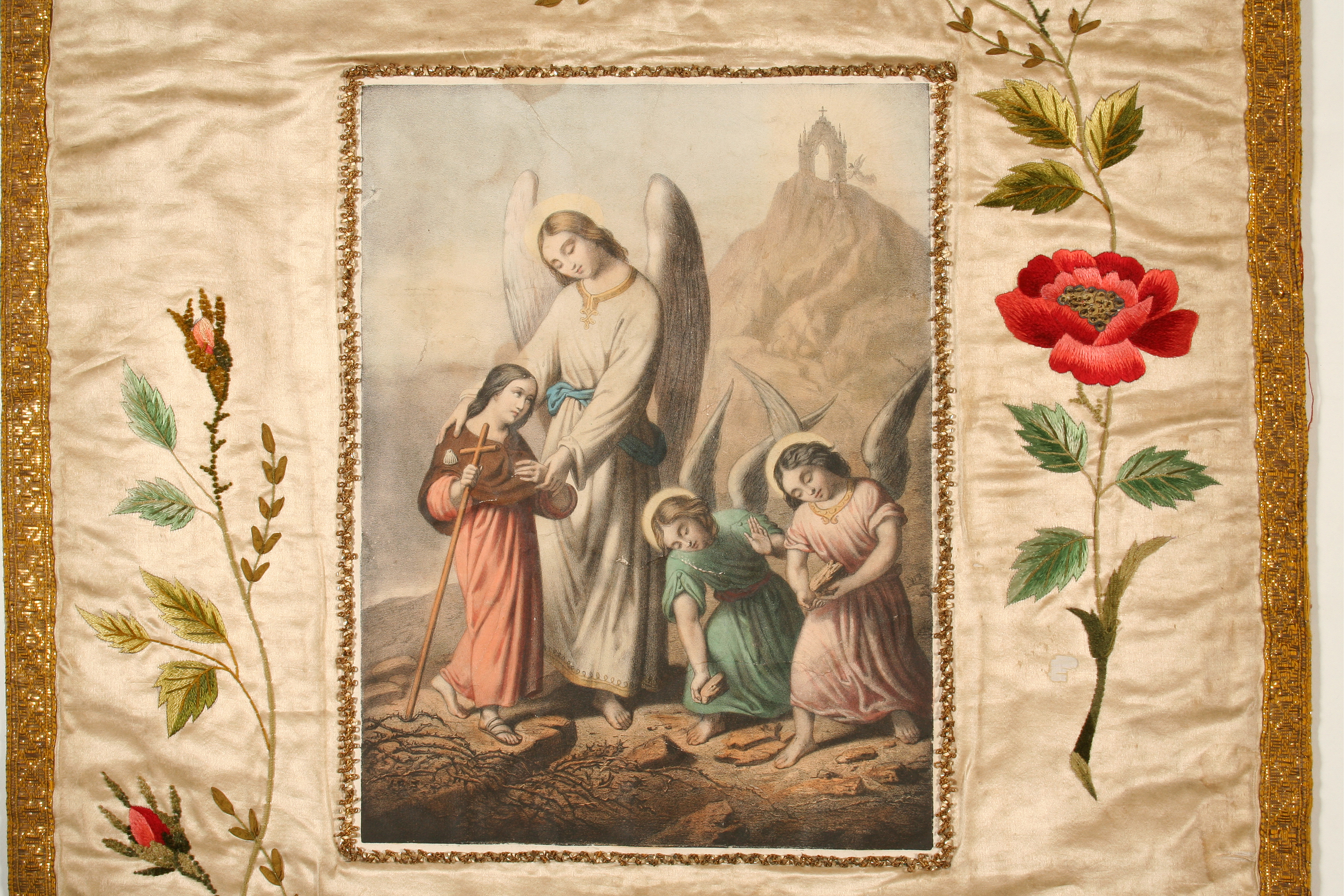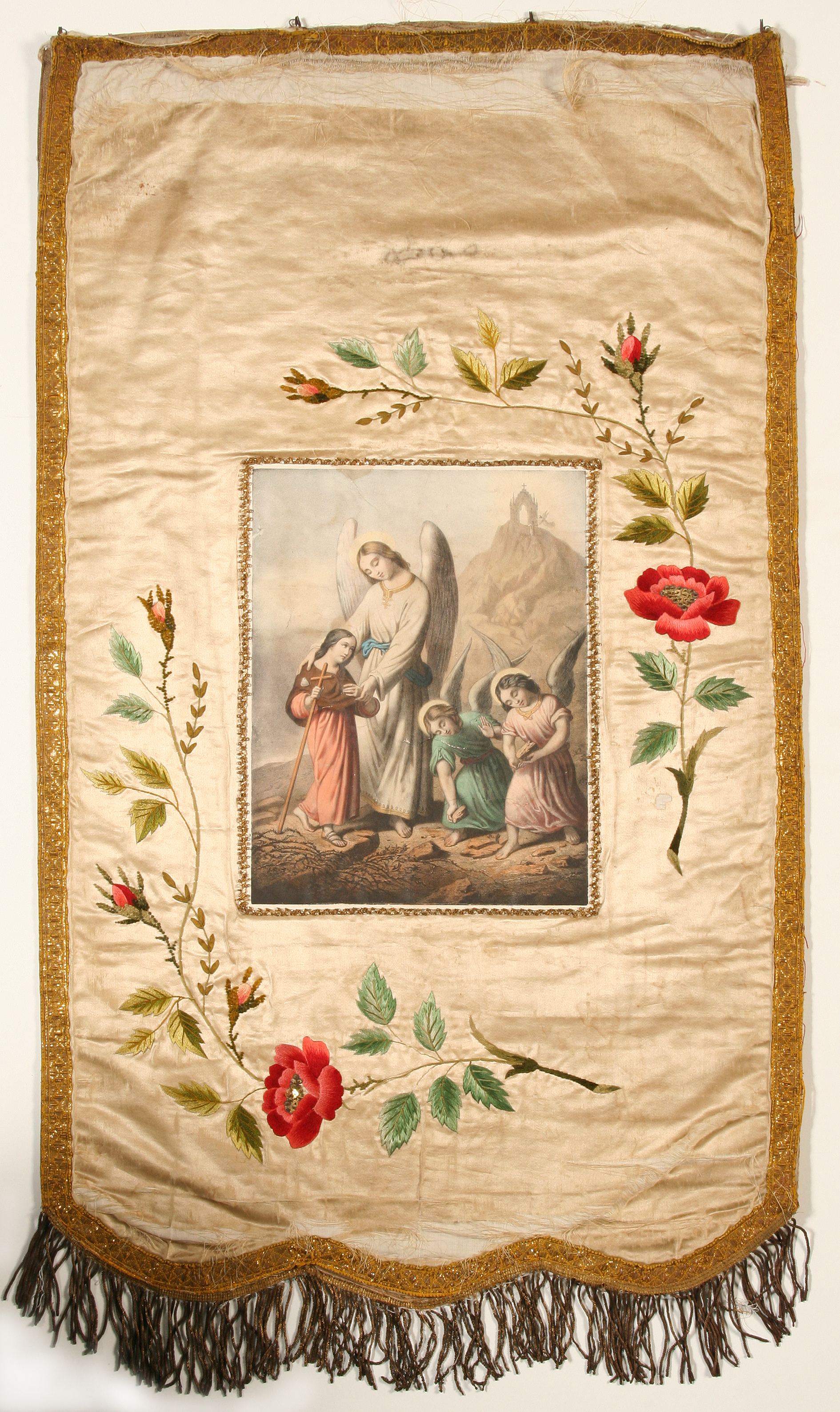 White satin banner with embroidered gold letters on the front, embroidered roses, and a paper with painted angels on the back. Golden galloon ribbon on edges and fringes at the bottom.