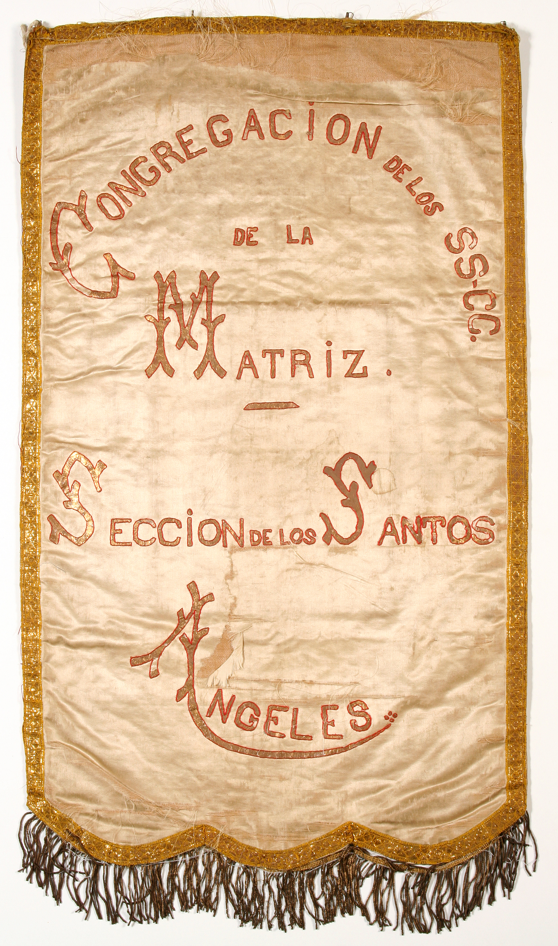 Estandarte de raso blanco con letras bordadas doradas en parte delantera, rosas bordadas y papel con pintura de ángeles en parte posterior, cinta galón dorado en contornos y flequillos en parte inferior.