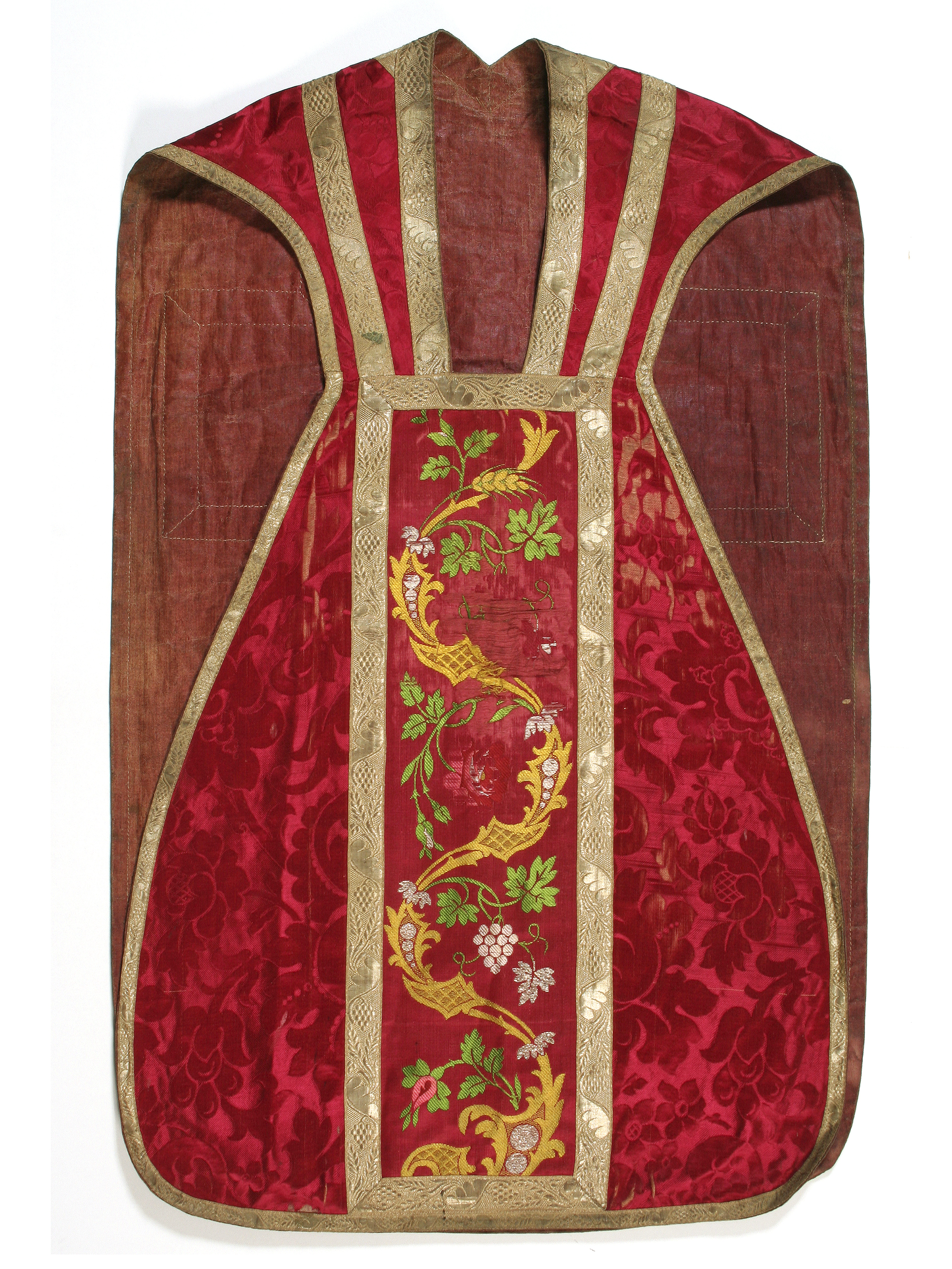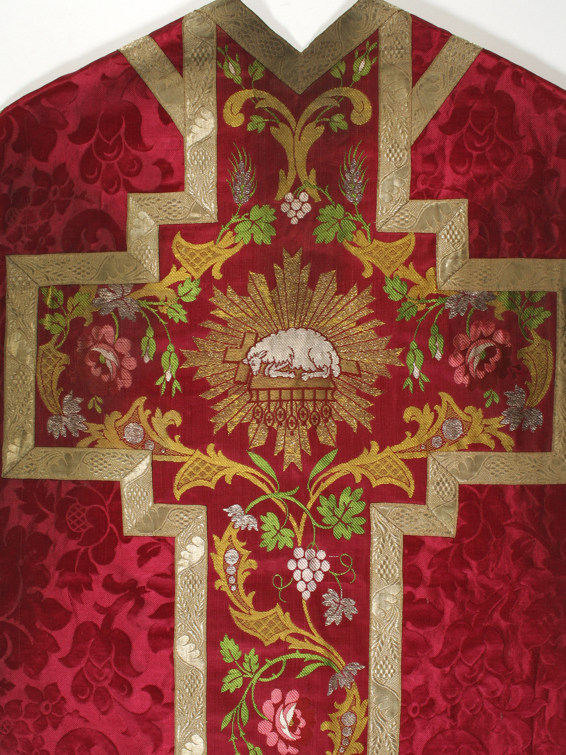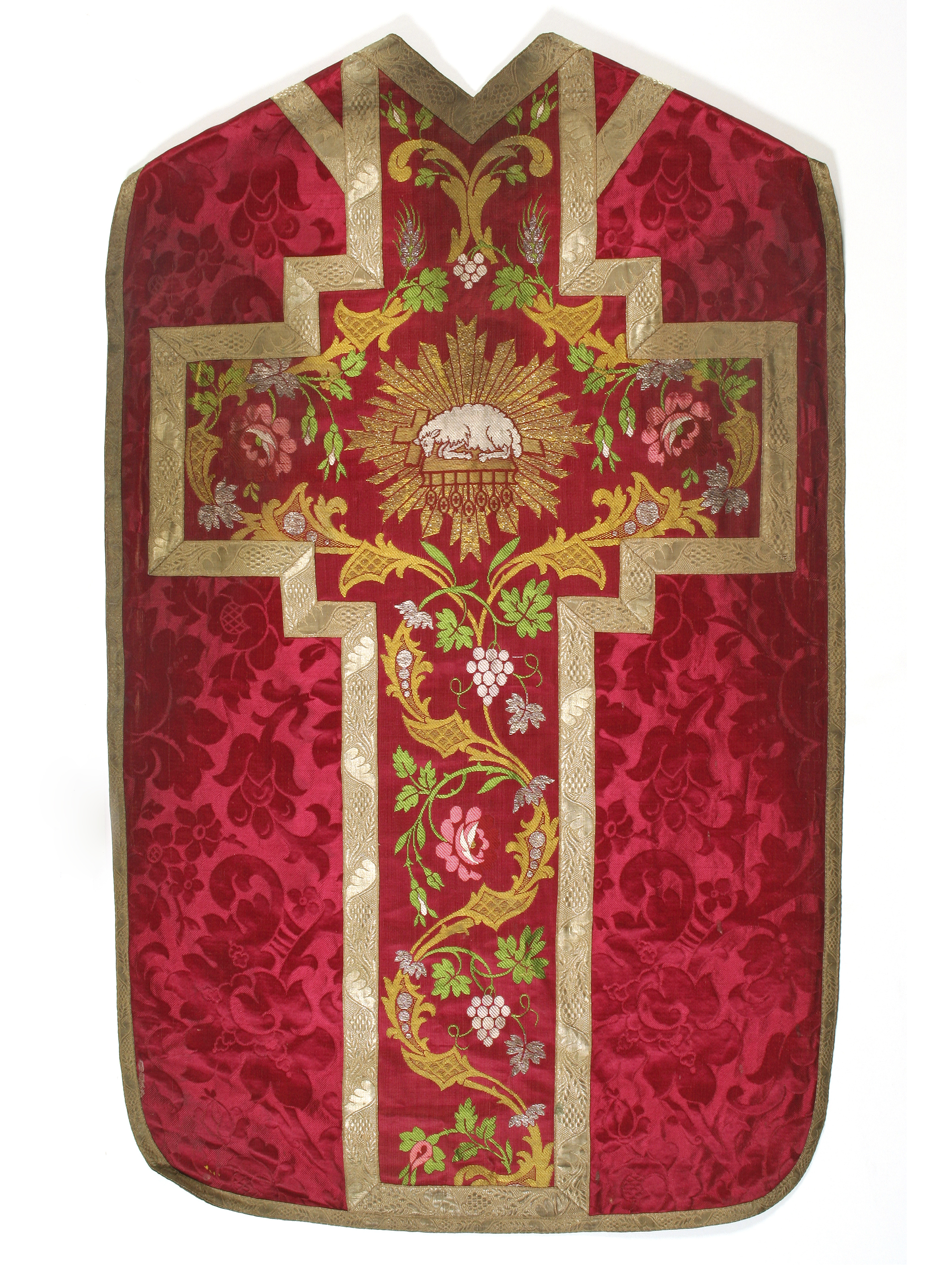 Damasco rojo con flores, con bordado de vides y un cordero en el centro de la espalda, orillas galón dorado