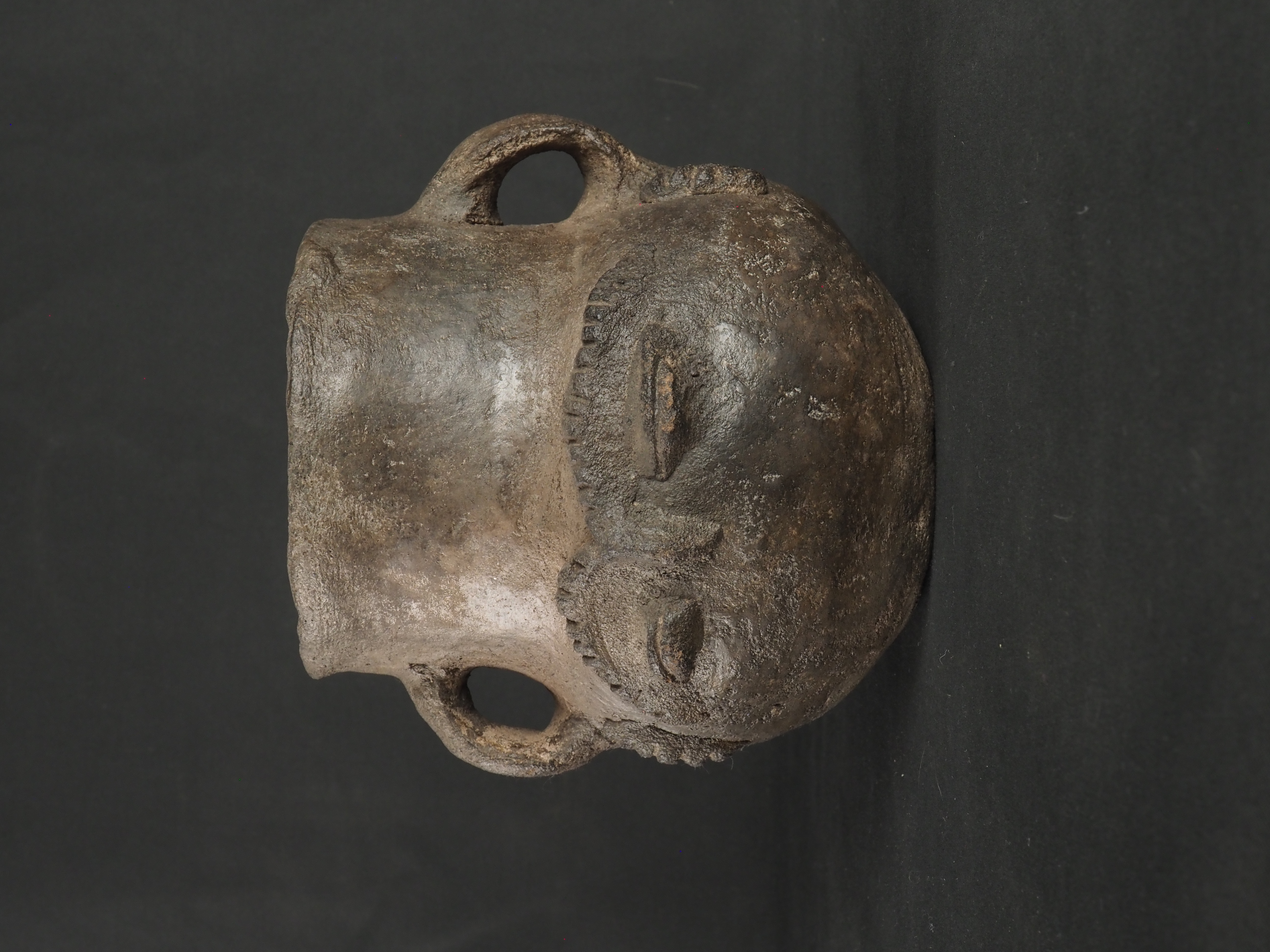 dc.description | dc.description | Objeto sin pigmentación adicional al color negro propio de la pasta. El tratamiento de superficie incluye diseño antropomorfo en altorrelieve del mismo color de la pasta, destacando morfología de los ojos similar a granos de café. Técnica: Arcilla modelada, alisada y pulida. Morfología: Objeto simétrico, restringido, con cuello y perfil inflectado. Posee cuerpo esférico con base convexa, cuello hiperboloide con borde evertido, labio redondeado y dos asas de arco lisas dispuestas verticalmente entre el cuello y el cuerpo. | |