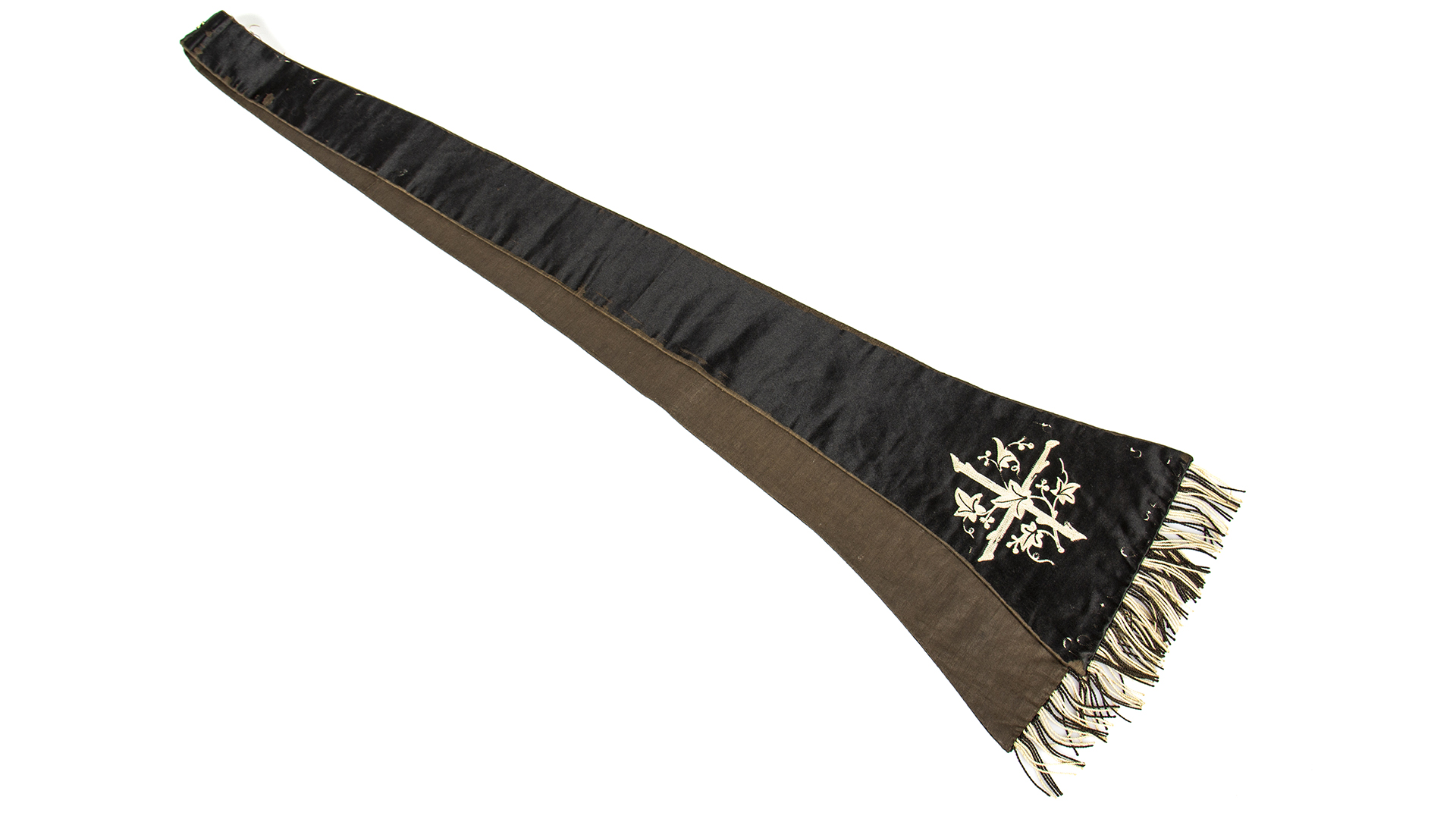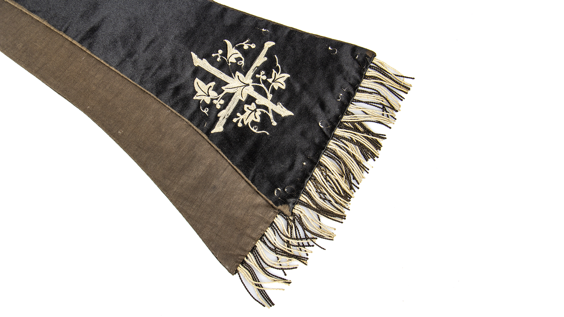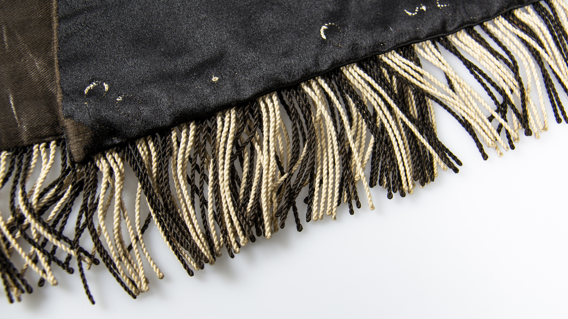 Black satin with white embroidery and fringes.