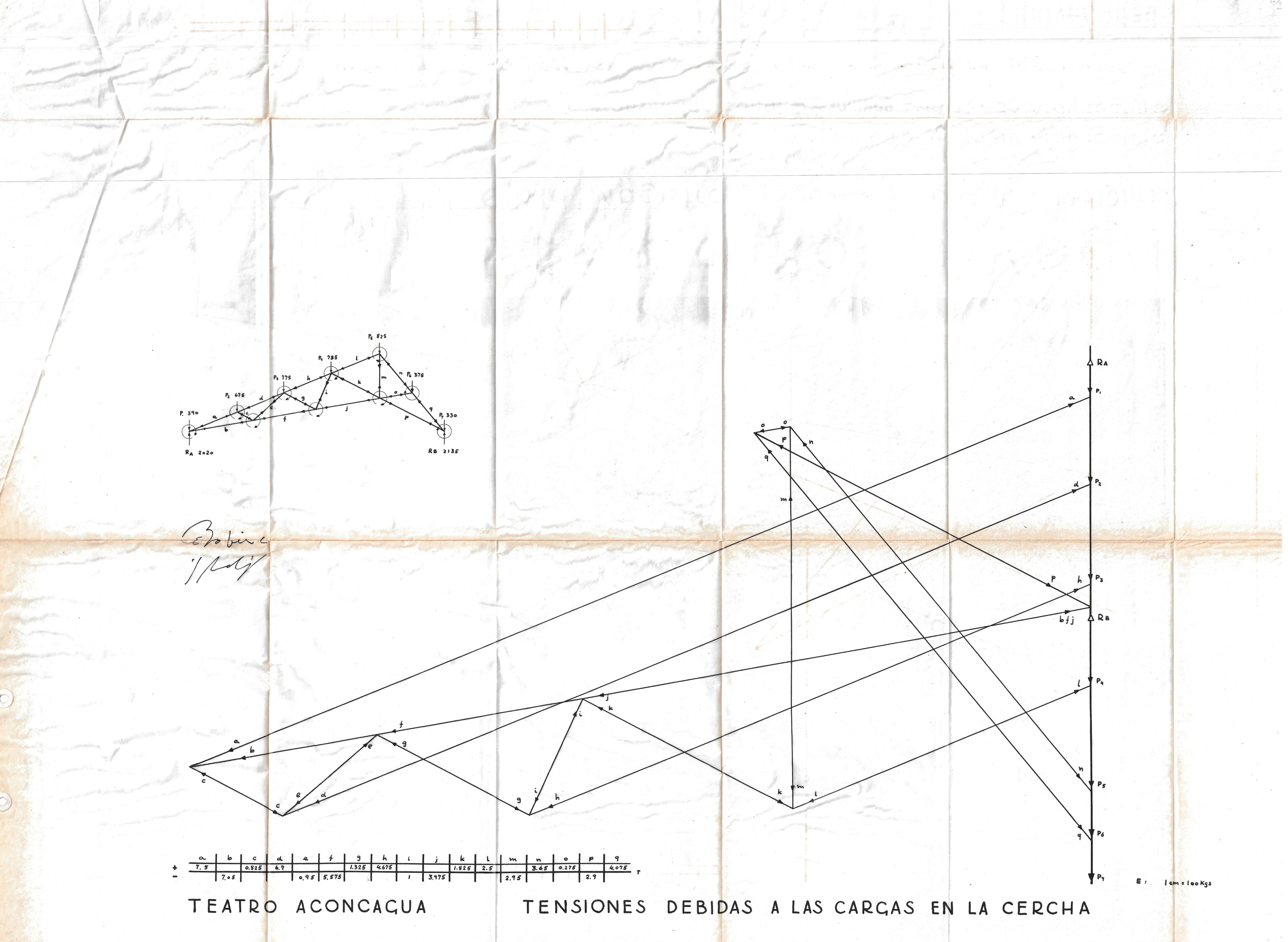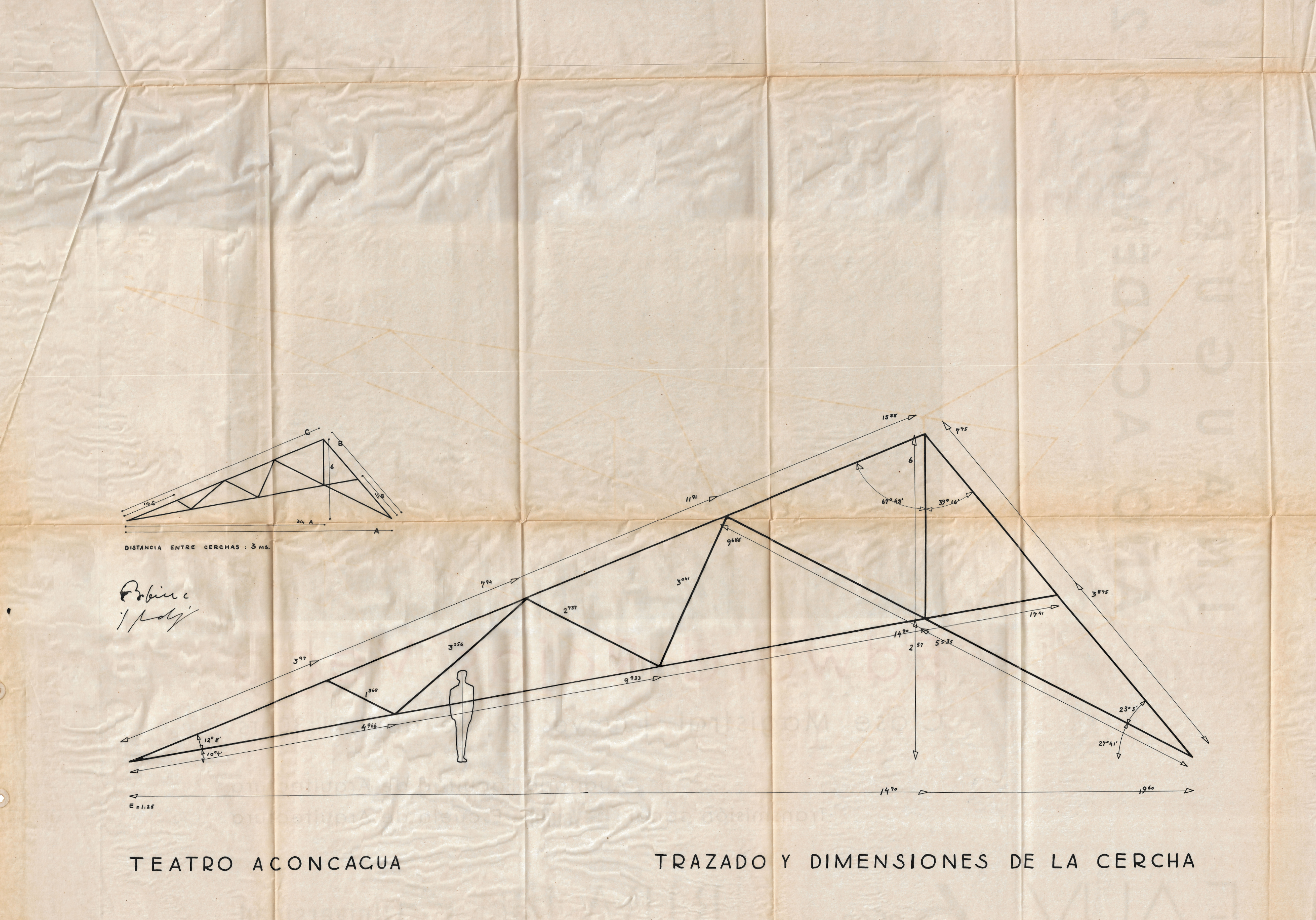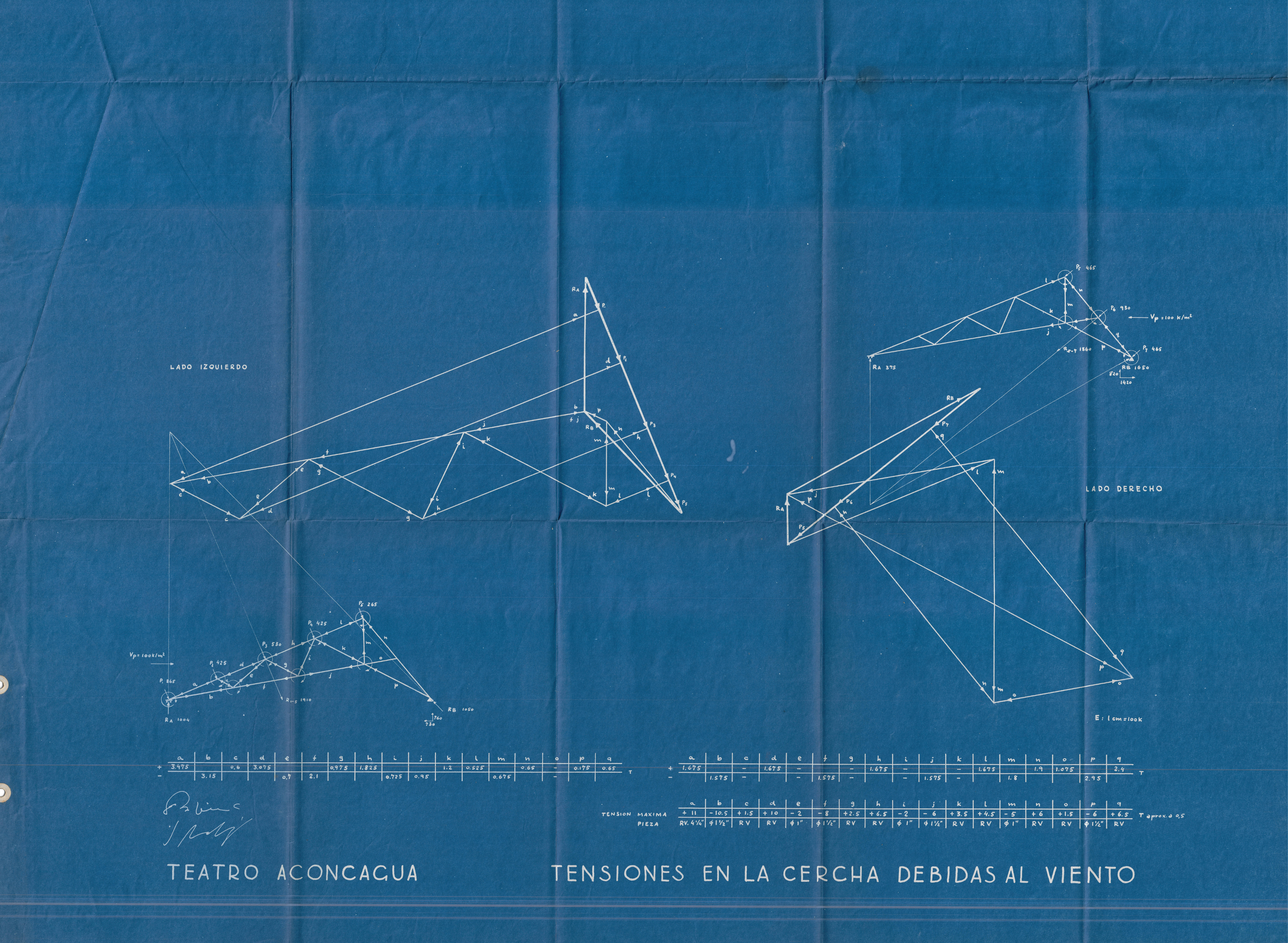 Los planos del Teatro Aconcagua incluyen diversos documentos relacionados con la estructura de su cercha: un plano de trazados y dimensiones elaborado en papel diamante junto a su versión heliográfica reproducida por el Laboratorio Heliográfico Copysol de Valparaíso; dos planos de detalles de la cercha, uno en papel diamante y otro en papel blueprint; además, se conservan planos que representan las tensiones producidas por el viento sobre la cercha, tanto en papel diamante como en formato heliográfico, los cuales proyectan las cargas en los lados izquierdo y derecho; finalmente, un plano adicional en papel diamante muestra las tensiones generadas por las cargas estructurales aplicadas a la cercha.