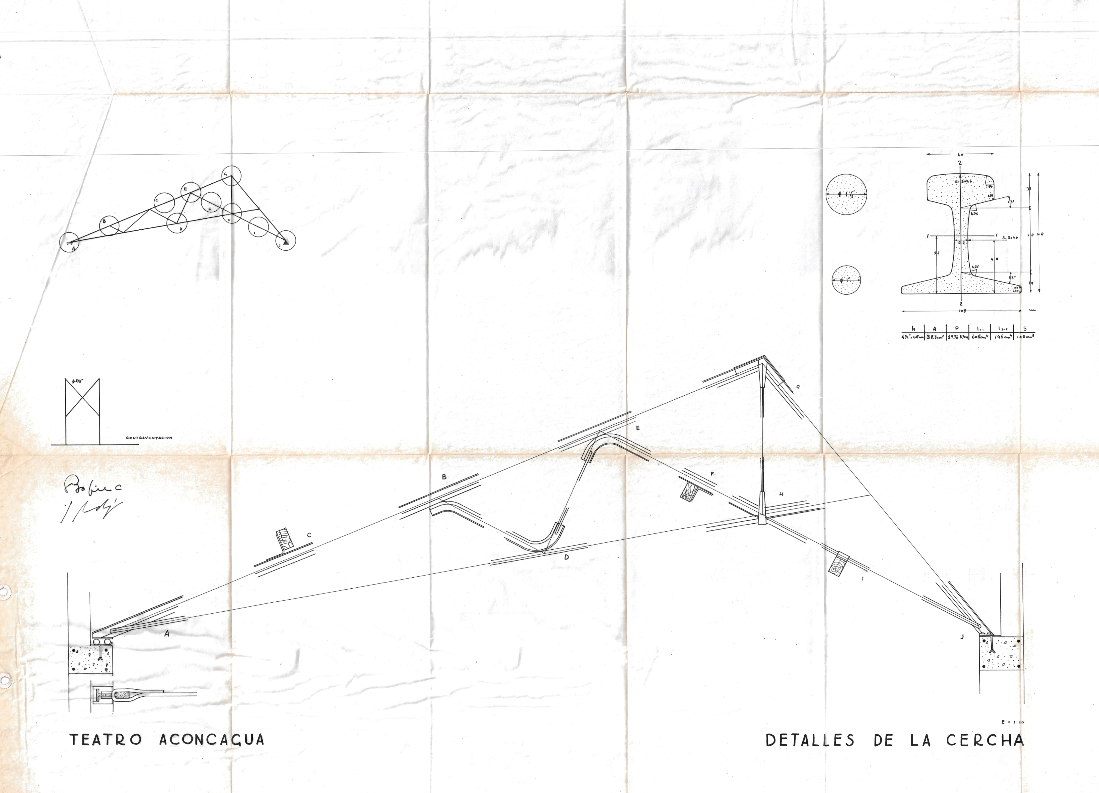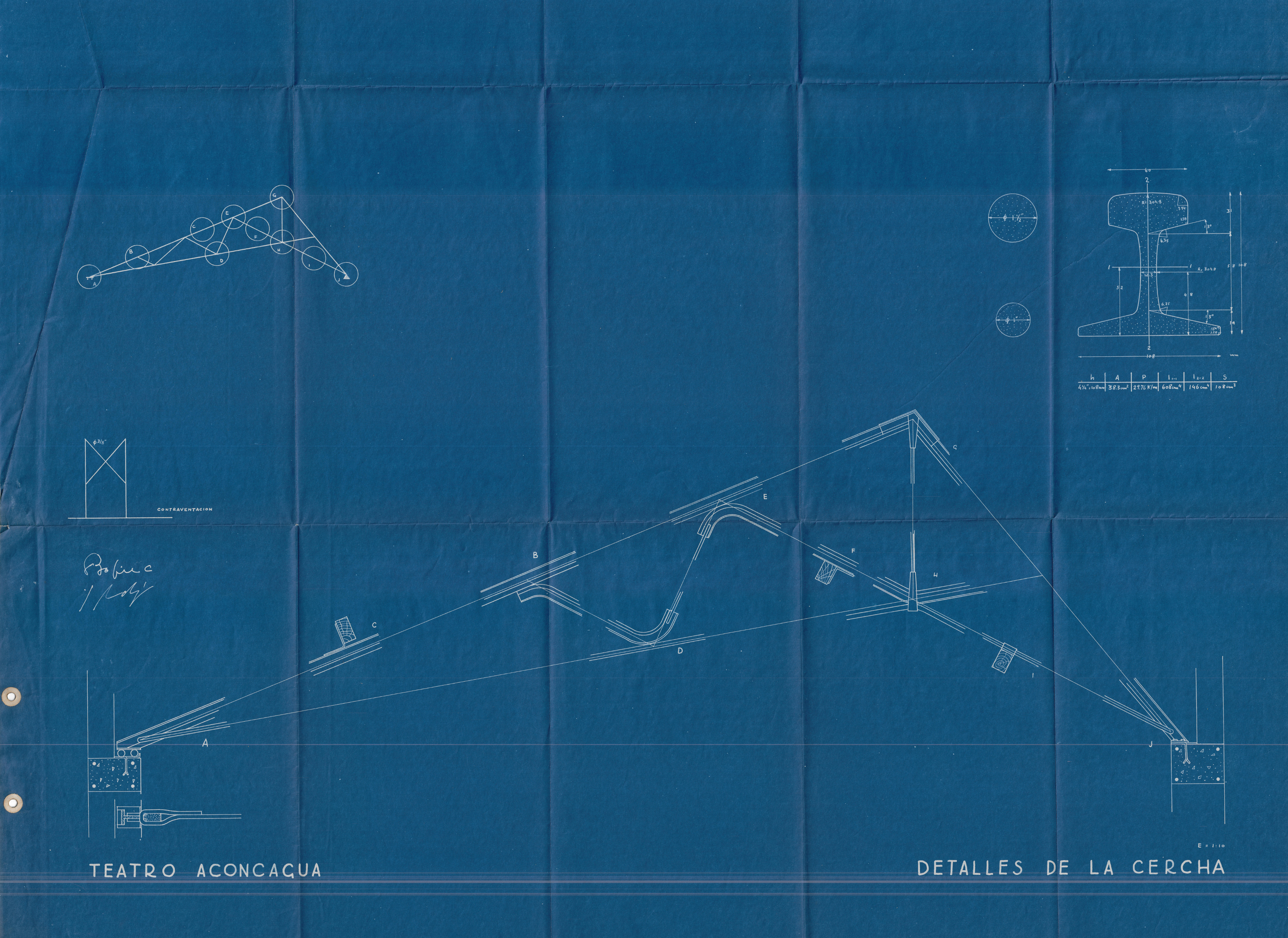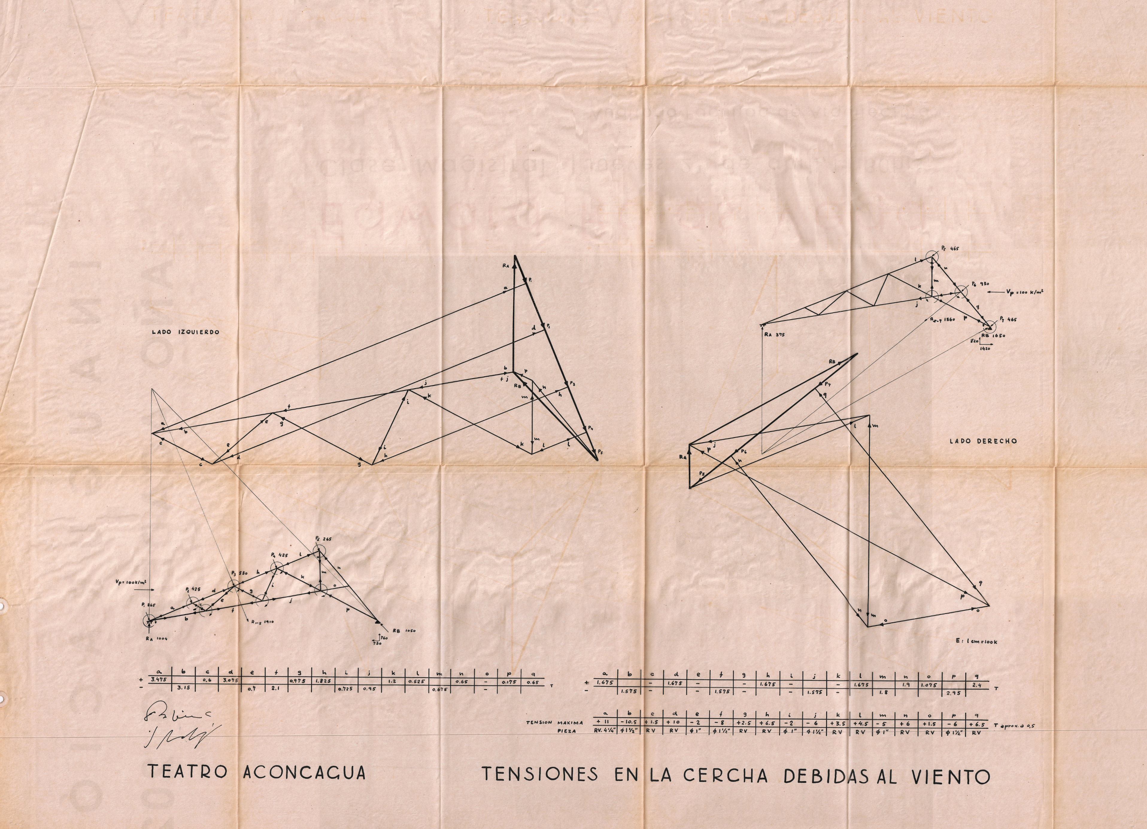 Los planos del Teatro Aconcagua incluyen diversos documentos relacionados con la estructura de su cercha: un plano de trazados y dimensiones elaborado en papel diamante junto a su versión heliográfica reproducida por el Laboratorio Heliográfico Copysol de Valparaíso; dos planos de detalles de la cercha, uno en papel diamante y otro en papel blueprint; además, se conservan planos que representan las tensiones producidas por el viento sobre la cercha, tanto en papel diamante como en formato heliográfico, los cuales proyectan las cargas en los lados izquierdo y derecho; finalmente, un plano adicional en papel diamante muestra las tensiones generadas por las cargas estructurales aplicadas a la cercha.